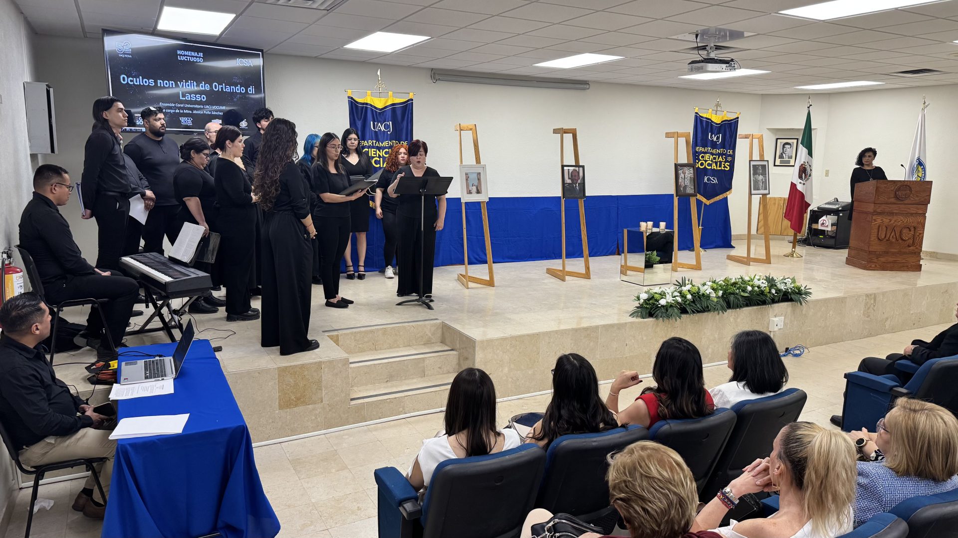 A un costado, el coro interpretaba Oculos non vidit, de Orlando di Lasso, acompañado por el Ensamble Coral Universitario UACJ-VOCUME. Las voces elevaban el momento a un plano íntimo. La música no llenaba el auditorio: lo abrazaba.
