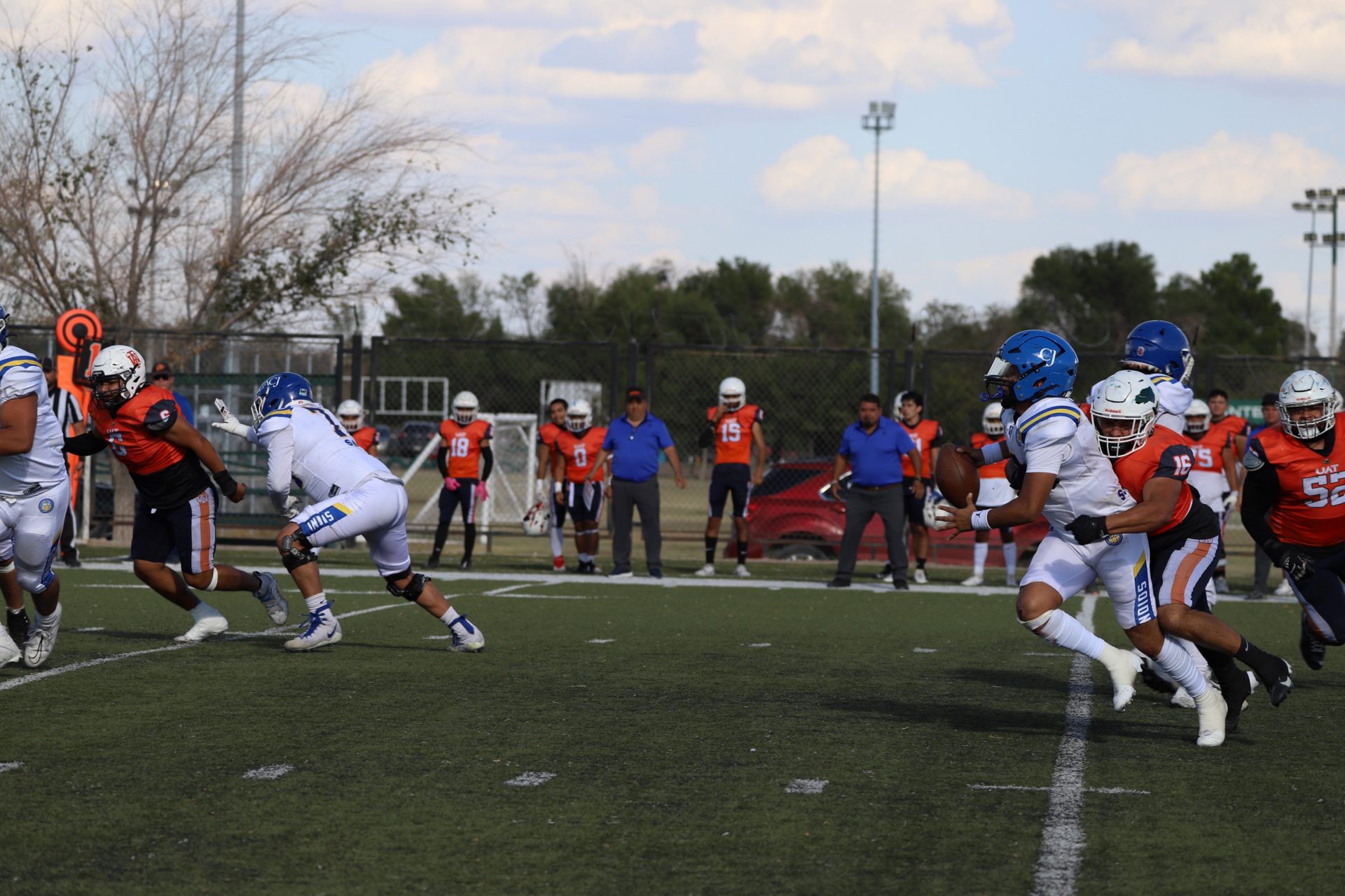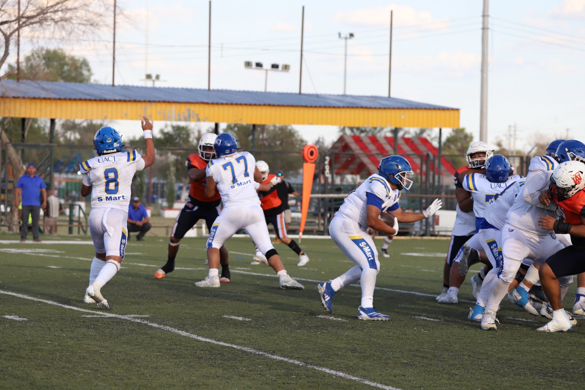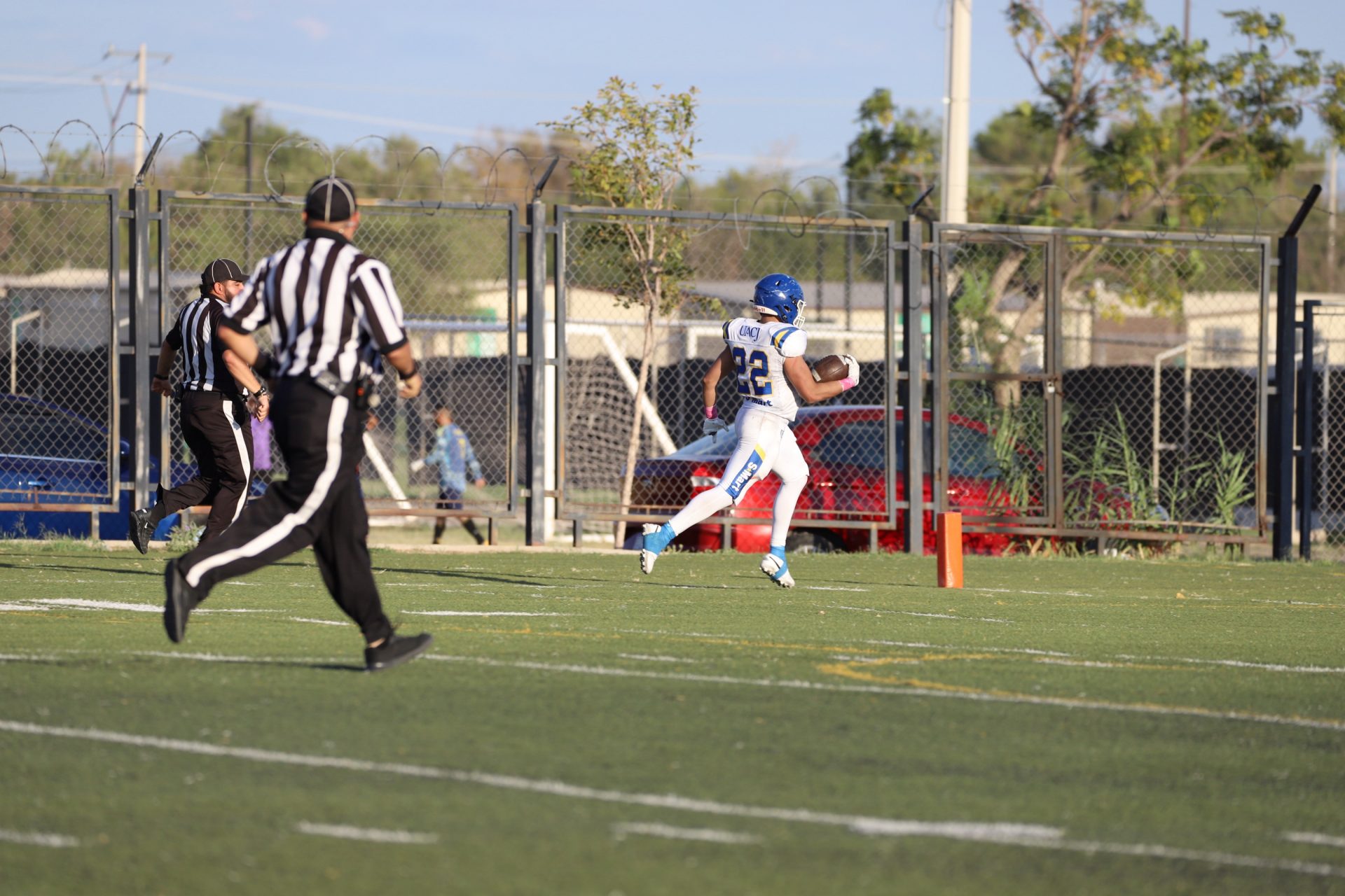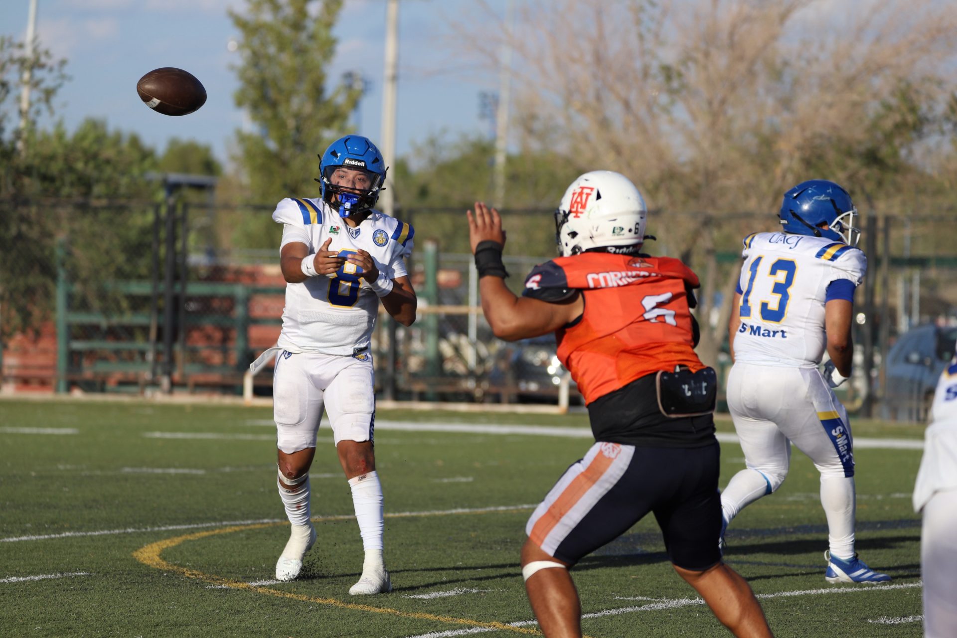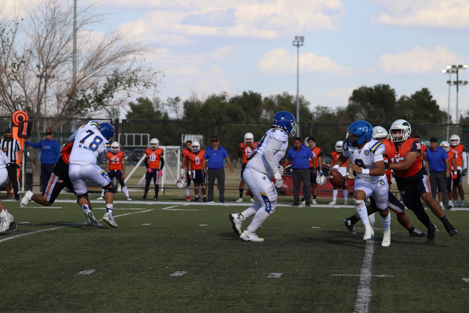 Sin embargo, después del último tropiezo de la UACJ, separando 4:53 del segundo cuarto, la ofensiva visitante continuaba mostrando firmeza: el mariscal (#10) efectuó un pase de 24 yardas al corredor (#8), desarticulando las aspiraciones locales, manteniendo a raya el marcador 7-6.