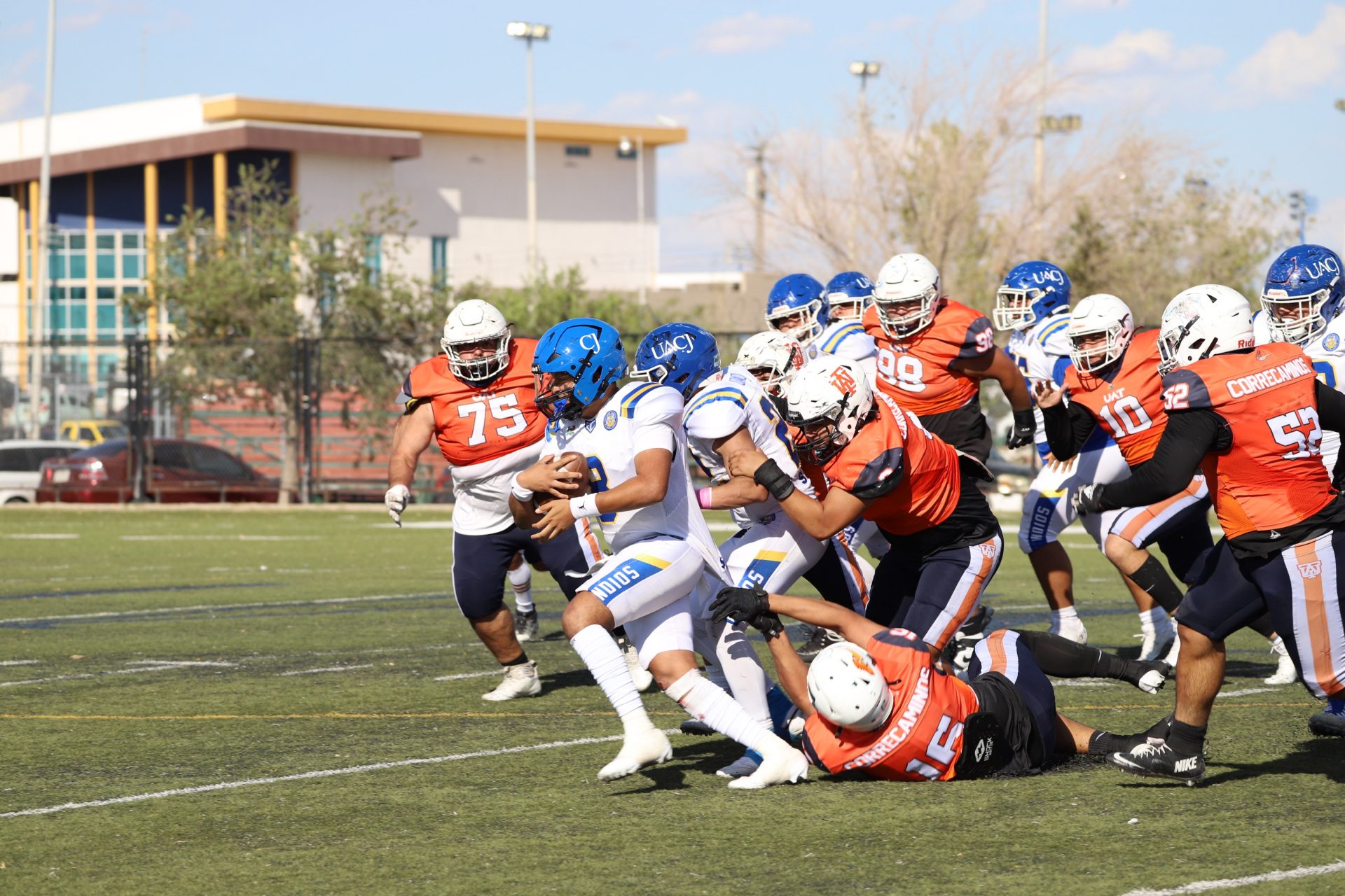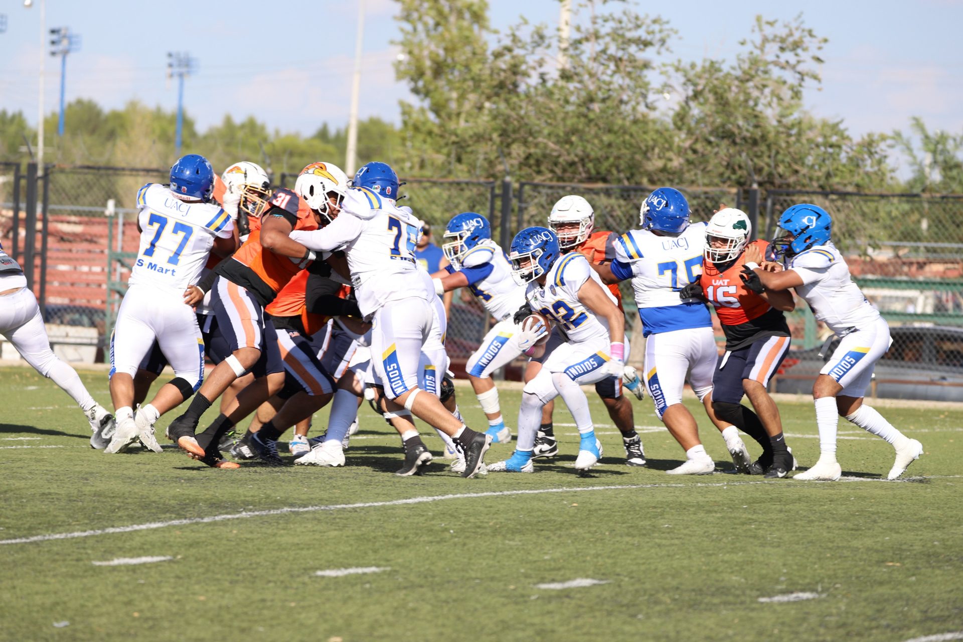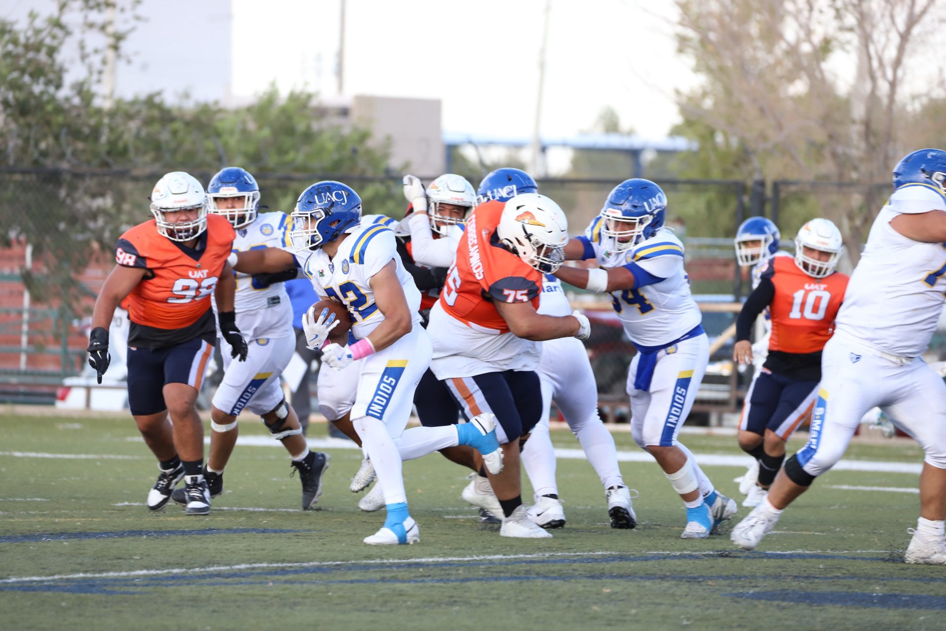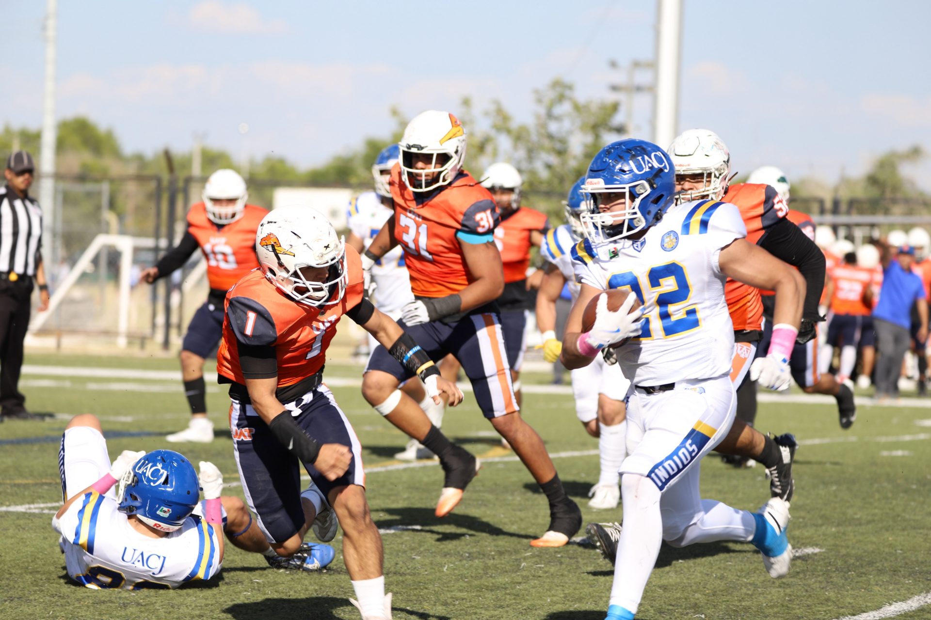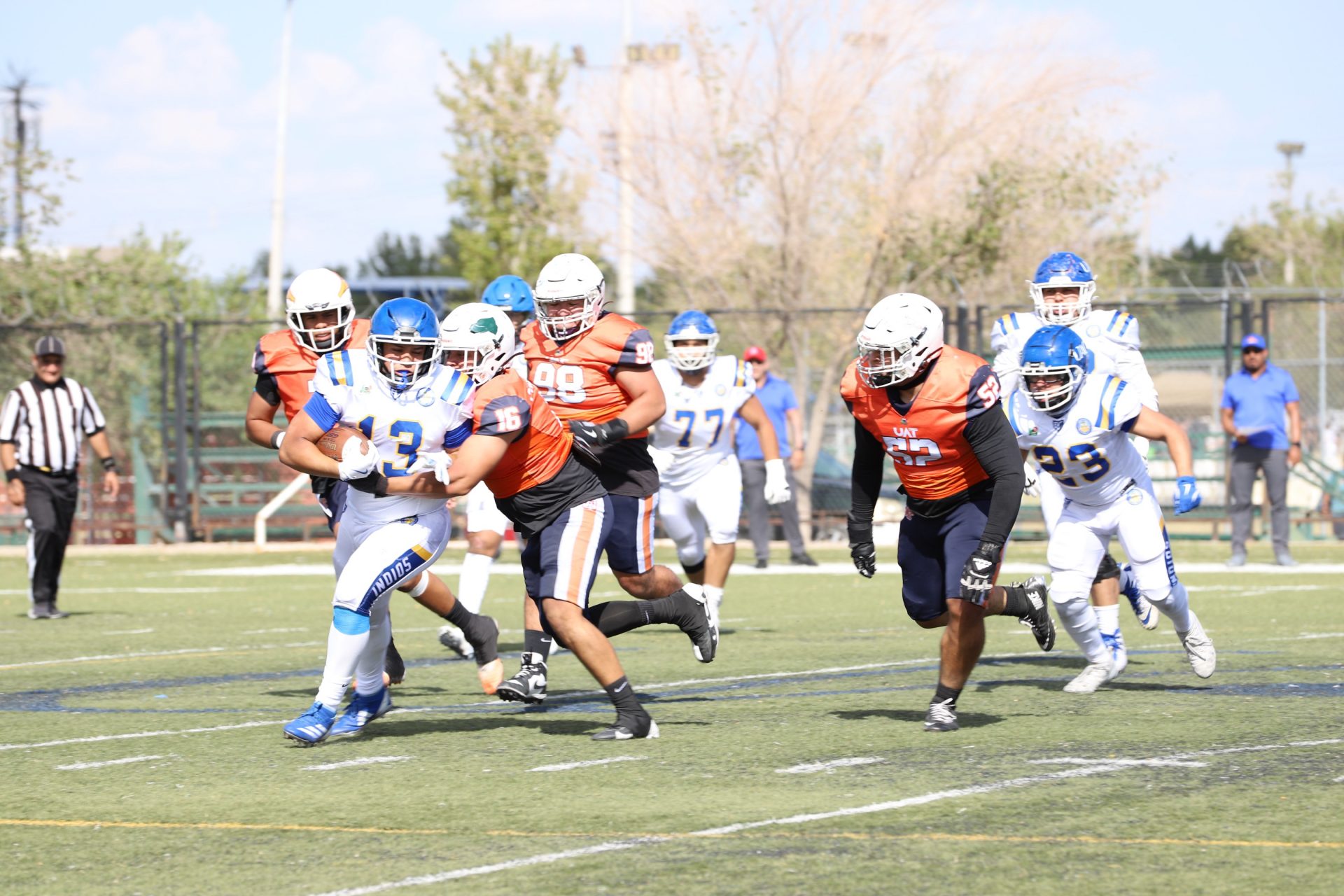 En su regreso a casa después de poco más de un mes de ausencia, cargados de la euforia universitaria, los Indios de la Universidad Autónoma de Ciudad Juárez (UACJ) defendieron con autoridad su territorio y lograron su cuarta victoria de la temporada al imponerse 31-14 a los Correcaminos de la Universidad Autónoma de Tamaulipas (UAT), en el marco del quinto juego del grupo norte de la Conferencia Nacional de la Organización Estudiantil de Futbol Americano (ONEFA).