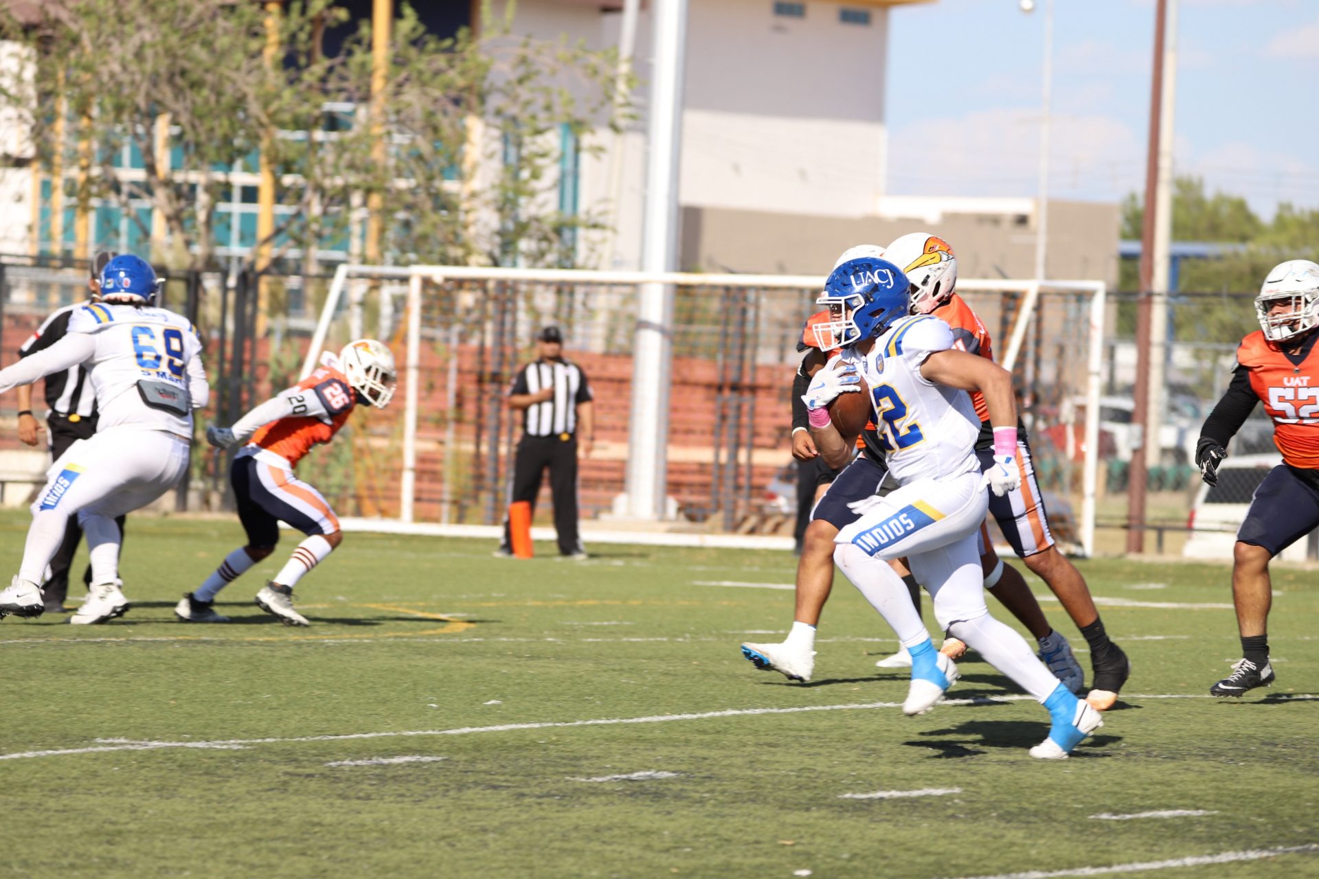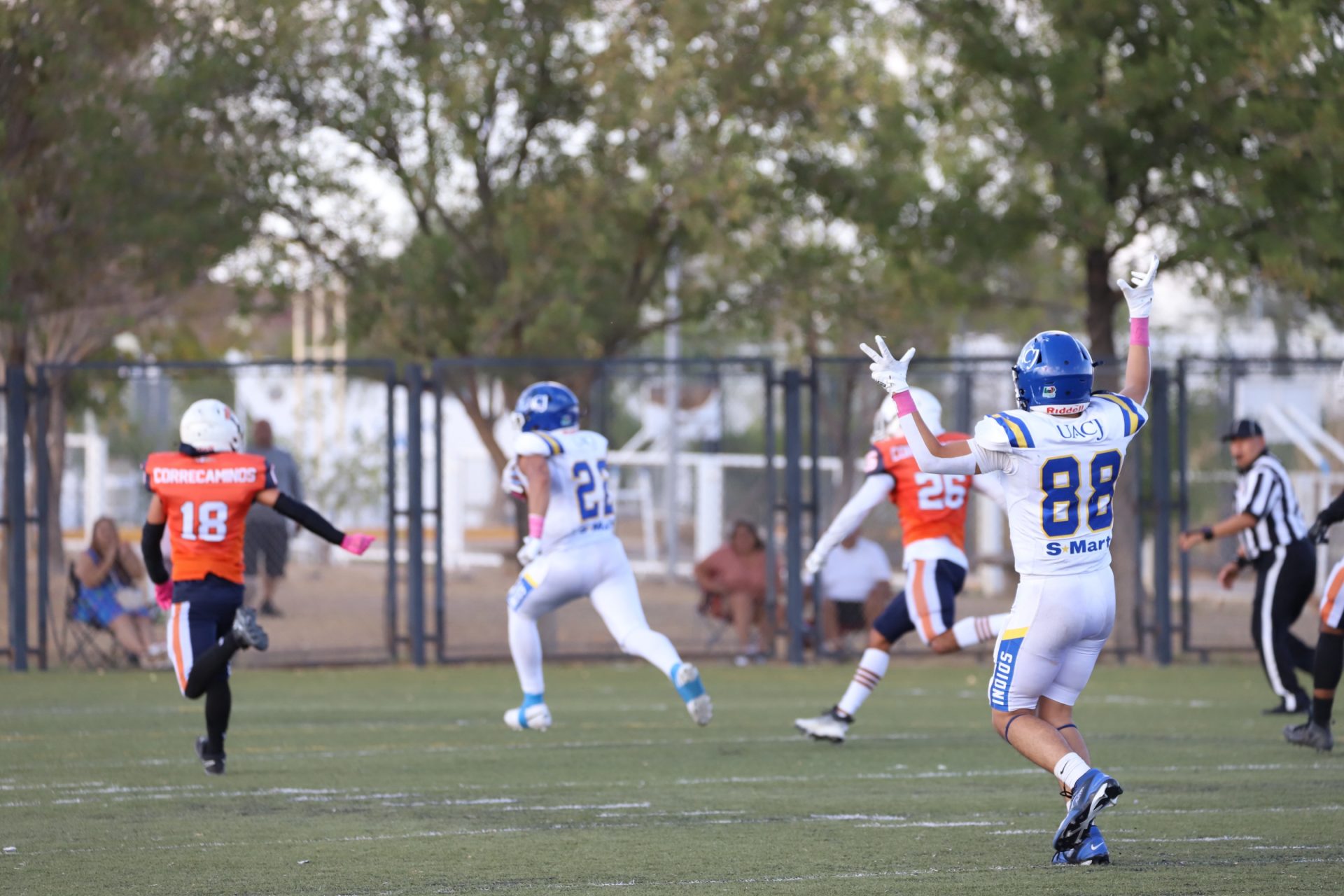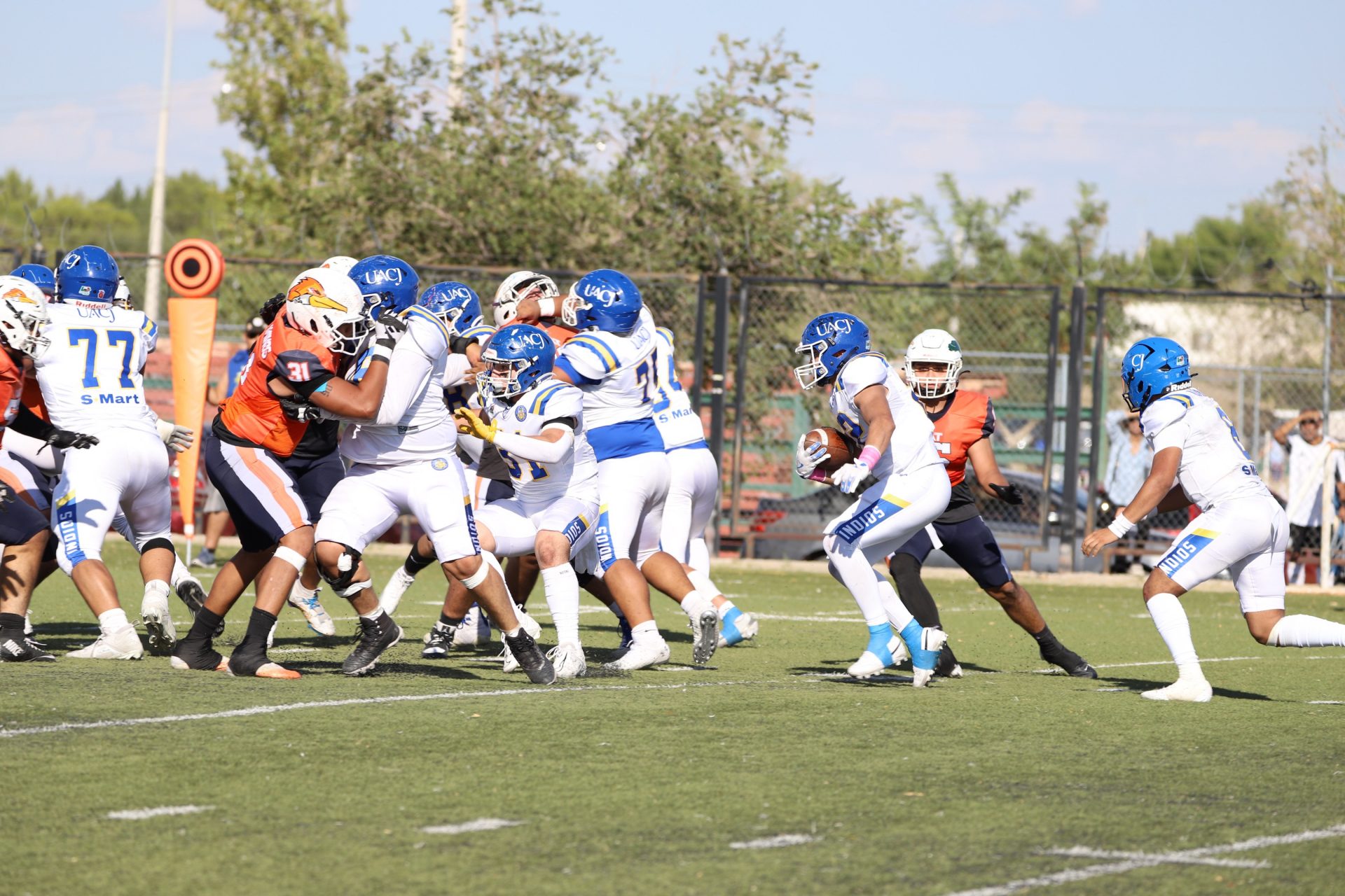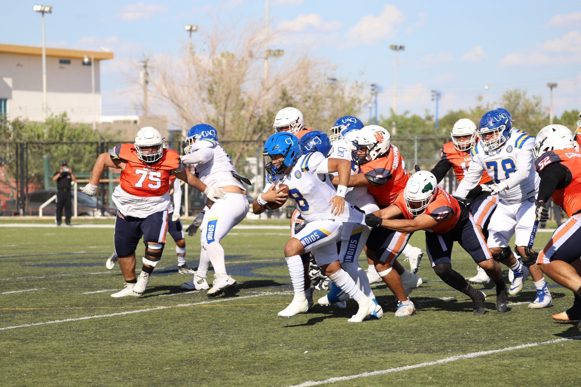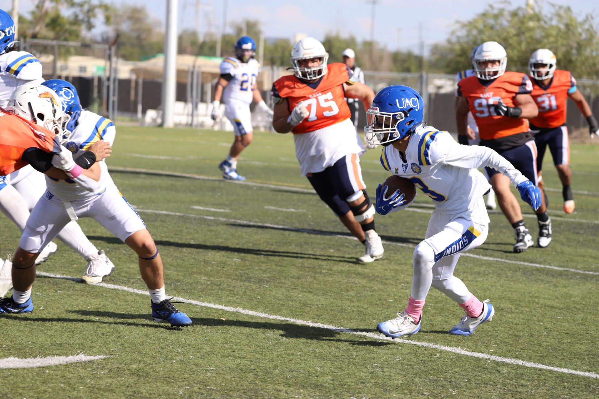 En su regreso a casa después de poco más de un mes de ausencia, cargados de la euforia universitaria, los Indios de la Universidad Autónoma de Ciudad Juárez (UACJ) defendieron con autoridad su territorio y lograron su cuarta victoria de la temporada al imponerse 31-14 a los Correcaminos de la Universidad Autónoma de Tamaulipas (UAT), en el marco del quinto juego del grupo norte de la Conferencia Nacional de la Organización Estudiantil de Futbol Americano (ONEFA).