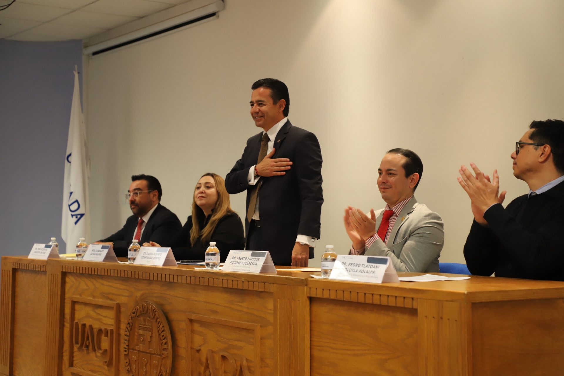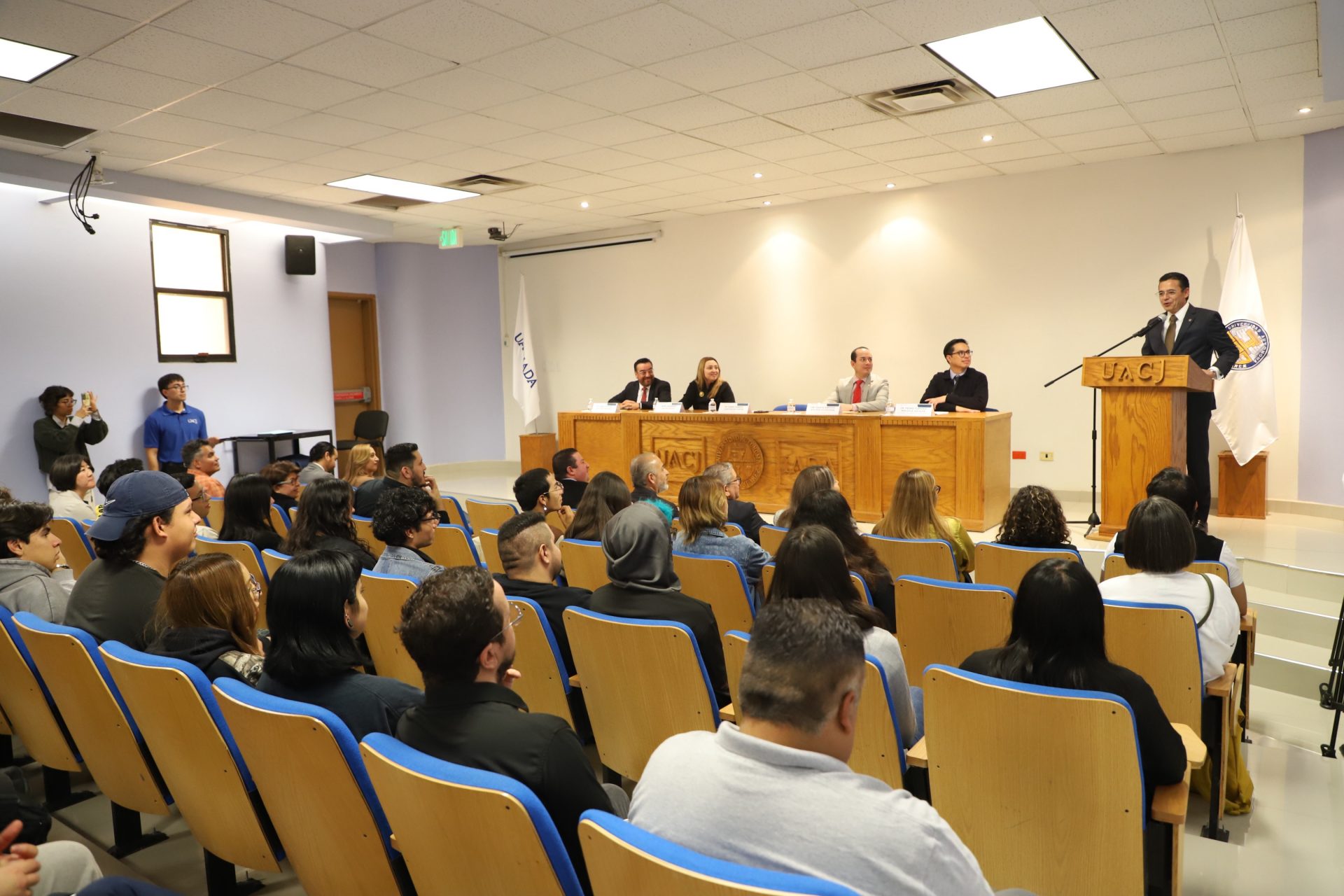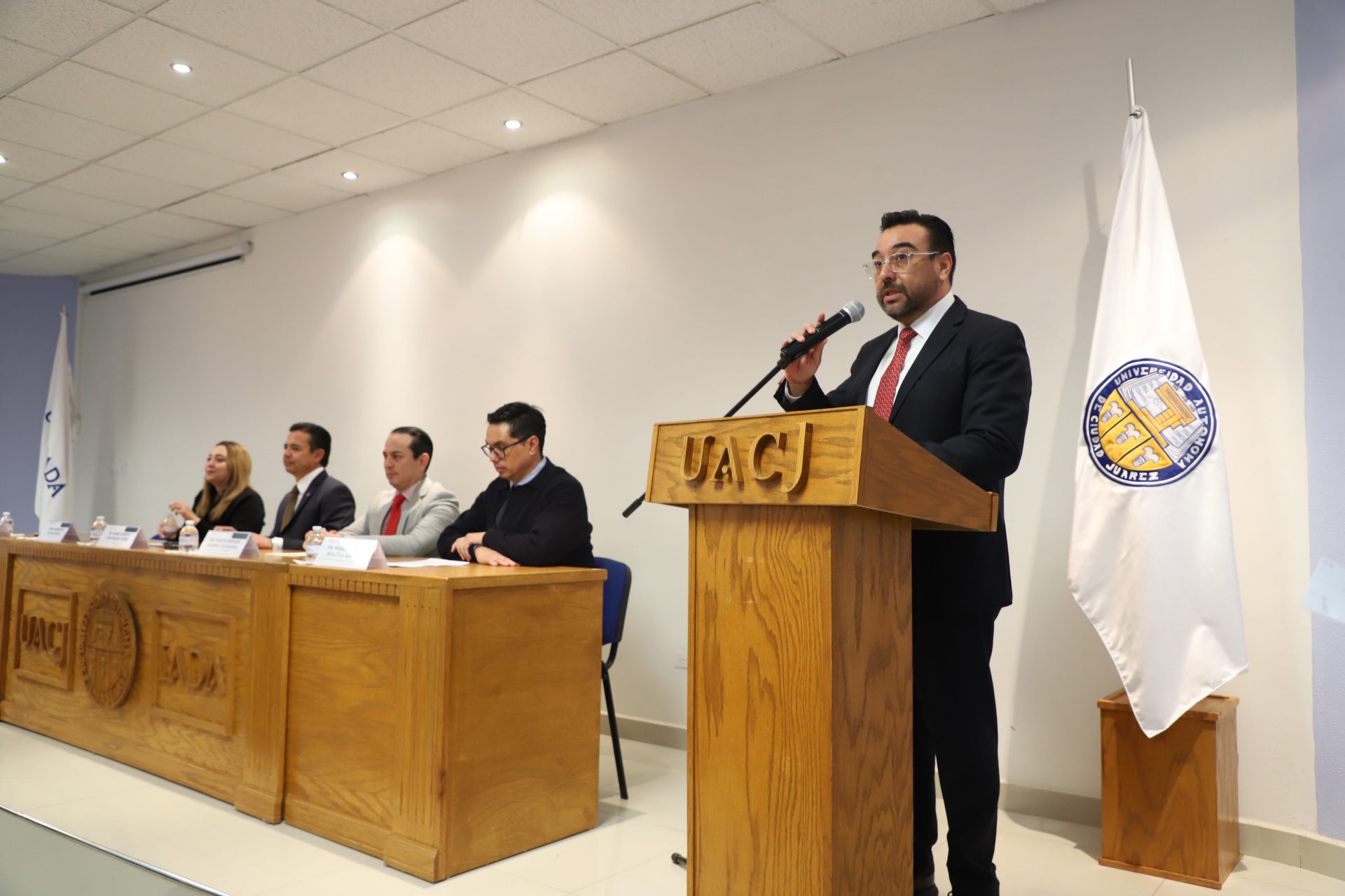 En el presídium, el doctor Daniel Alberto Constandse Cortez, rector de la UACJ; la maestra Guadalupe Gaytán Aguirre, secretaría académica; el doctor Fausto Enrique Aguirre Escarcega, director del IADA; el doctor René Ezequiel Saucedo Muñoz, jefe del departamento de Arquitectura y el doctor Pedro Tlatoani Molotla Xolalpa, coordinador del Programa de maestría en Arquitectura, encabezaron la bienvenida a este espacio.