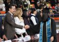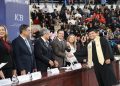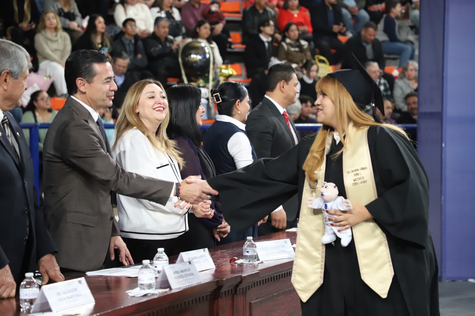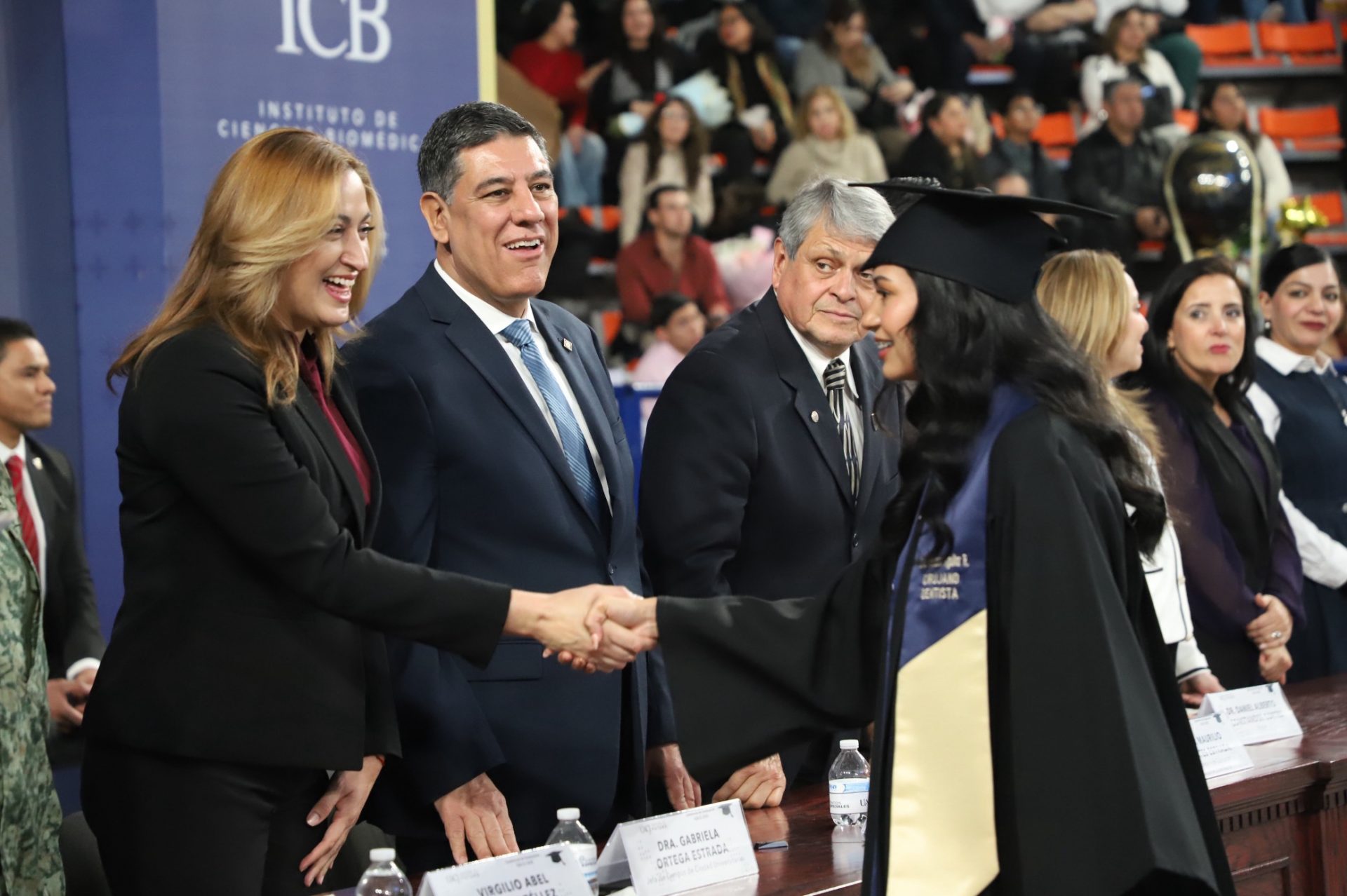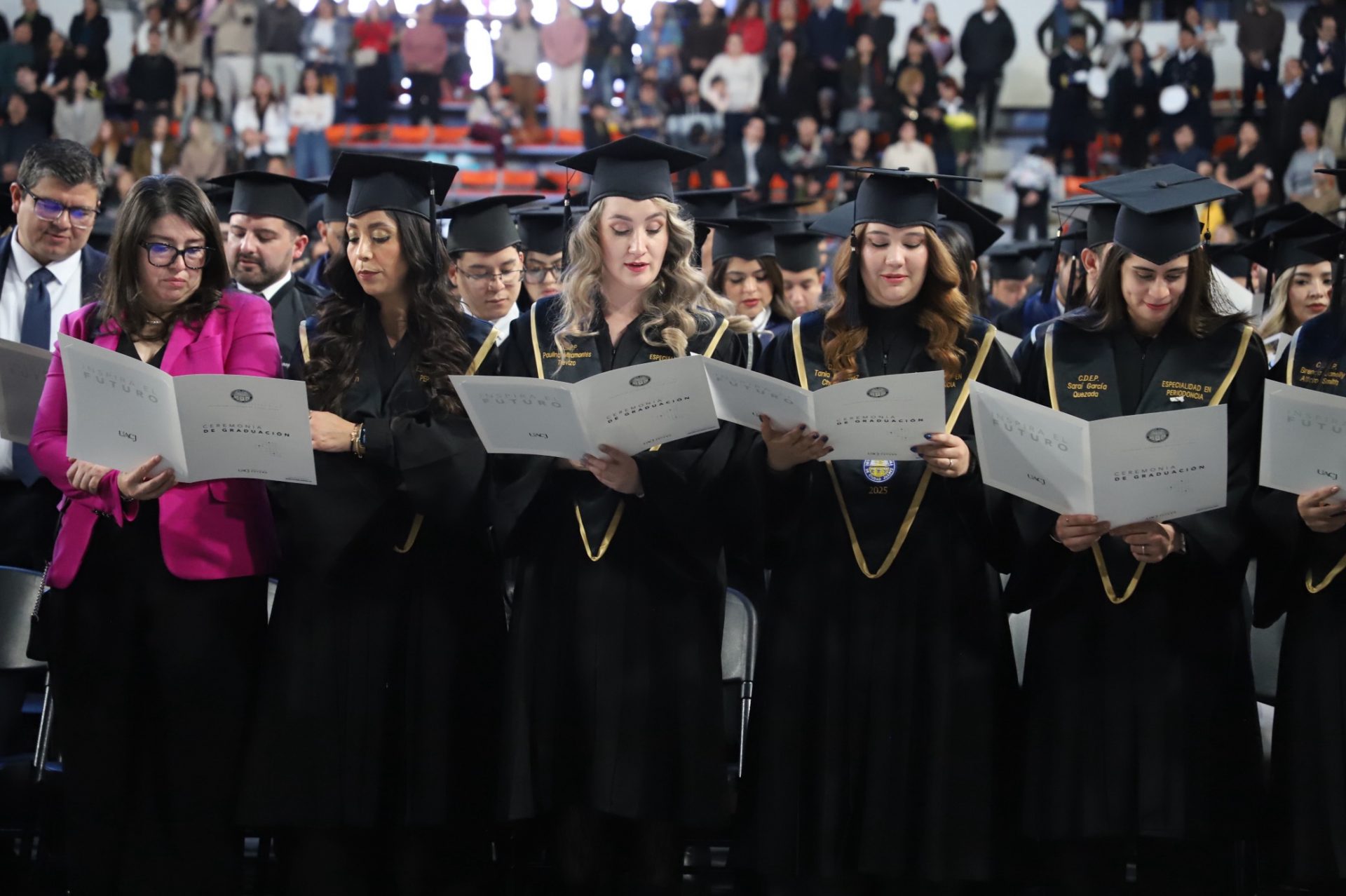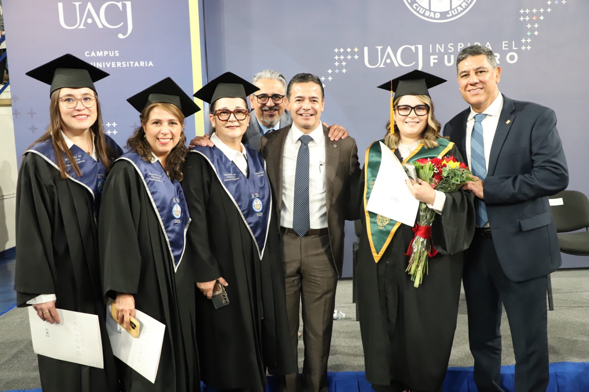 El rector de la UACJ, el doctor Daniel Alberto Constandse Cortez, presidió el presídium junto a funcionarios universitarios, representantes de los tres niveles de gobierno y militares —entre los que destacan, el doctor Salvador David Nava Martínez, secretario general; la maestra María Guadalupe Gaytán Aguirre, secretaria académica; la maestra Tania Dolores Hernández García, directora del Instituto de Ciencias Biomédicas (ICB); la doctora Gabriela Ortega Estrada, jefa del Campus de Ciudad Universitaria (CCU); la doctora Daphne Patricia Santana Fernández, directora de Salud Municipal, en representación del licenciando Cruz Pérez Cuéllar, alcalde del ayuntamiento de Juárez; el ingeniero Maurilio Fuentes Estrada, subsecretario de Educación y Deporte Zona Norte; y Virgilio Abel Ramírez Téllez, Coronel de Caballería, en representación del Coronel de Infantería de Estado Mayor, Mauricio Cansino Báez, Comandante de la Guarnición Militar de Ciudad Juárez—, en un evento que combinó la solemnidad de los honores a la bandera y los himnos nacional, estatal y universitario —estos tres últimos entonados por la maestra Jessica Peña—, con calurosas felicitaciones a las nuevas generaciones de enfermeros, médicos cirujanos, cirujanos dentistas y especialistas odontológicos.