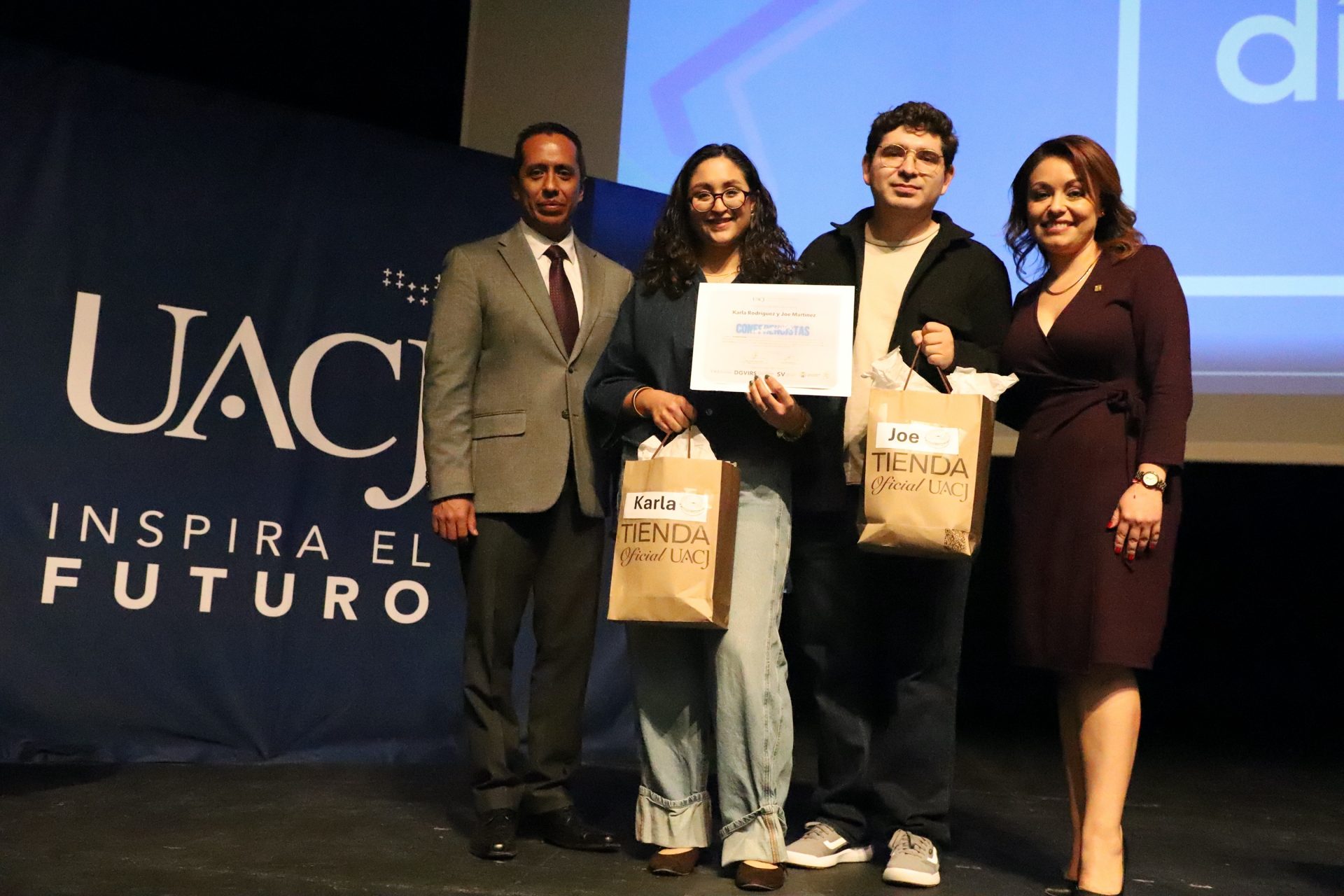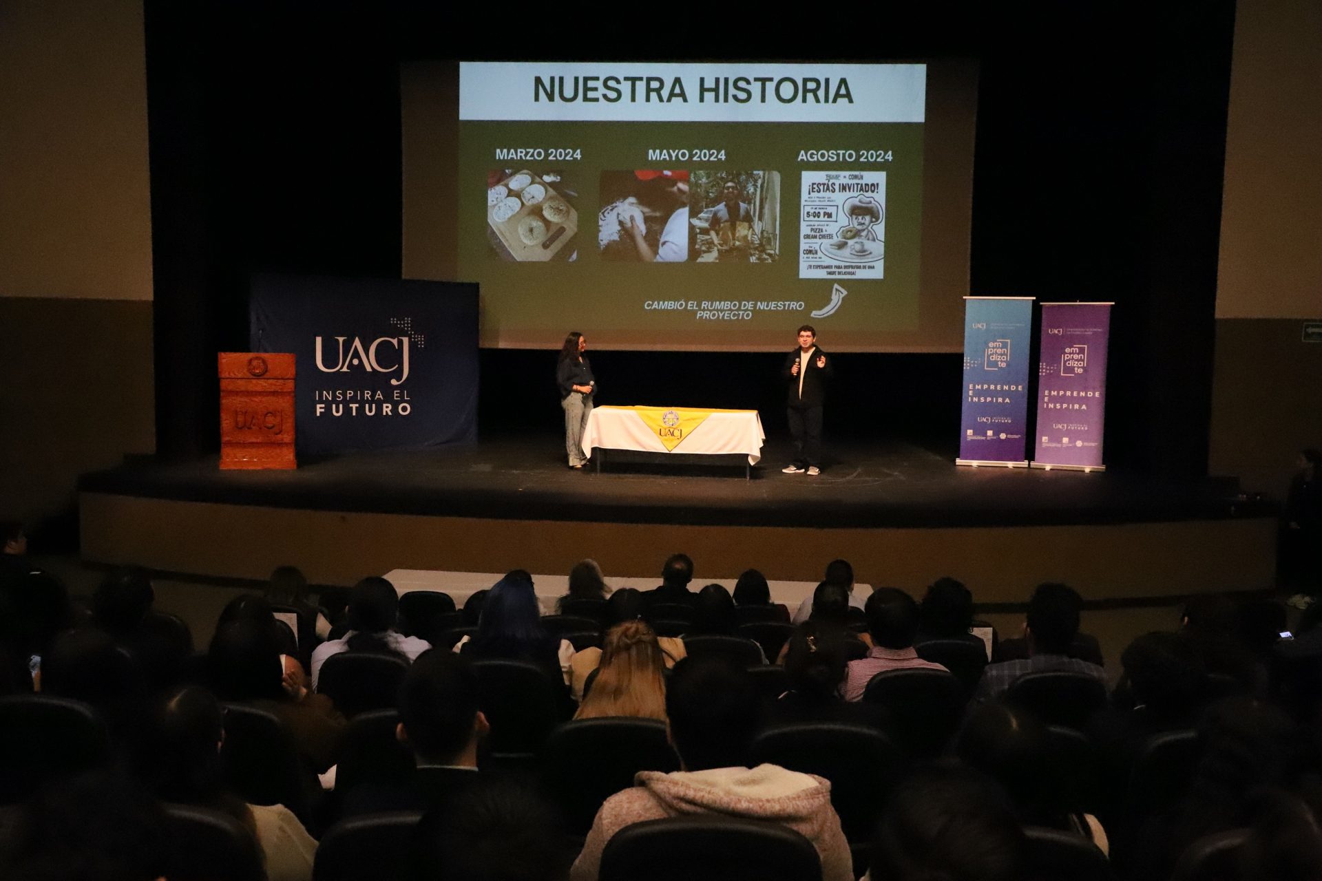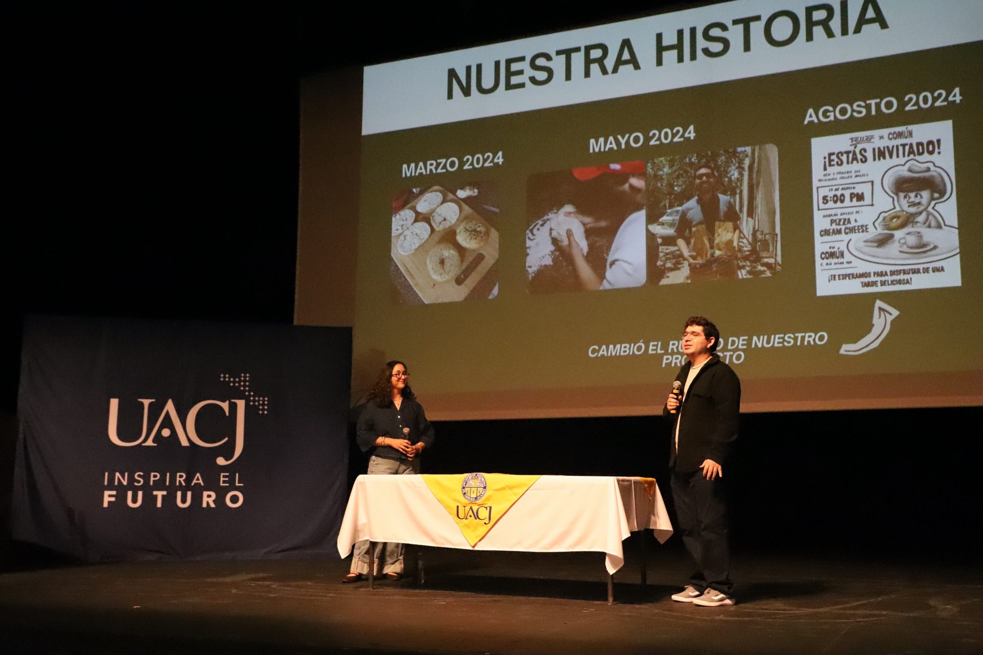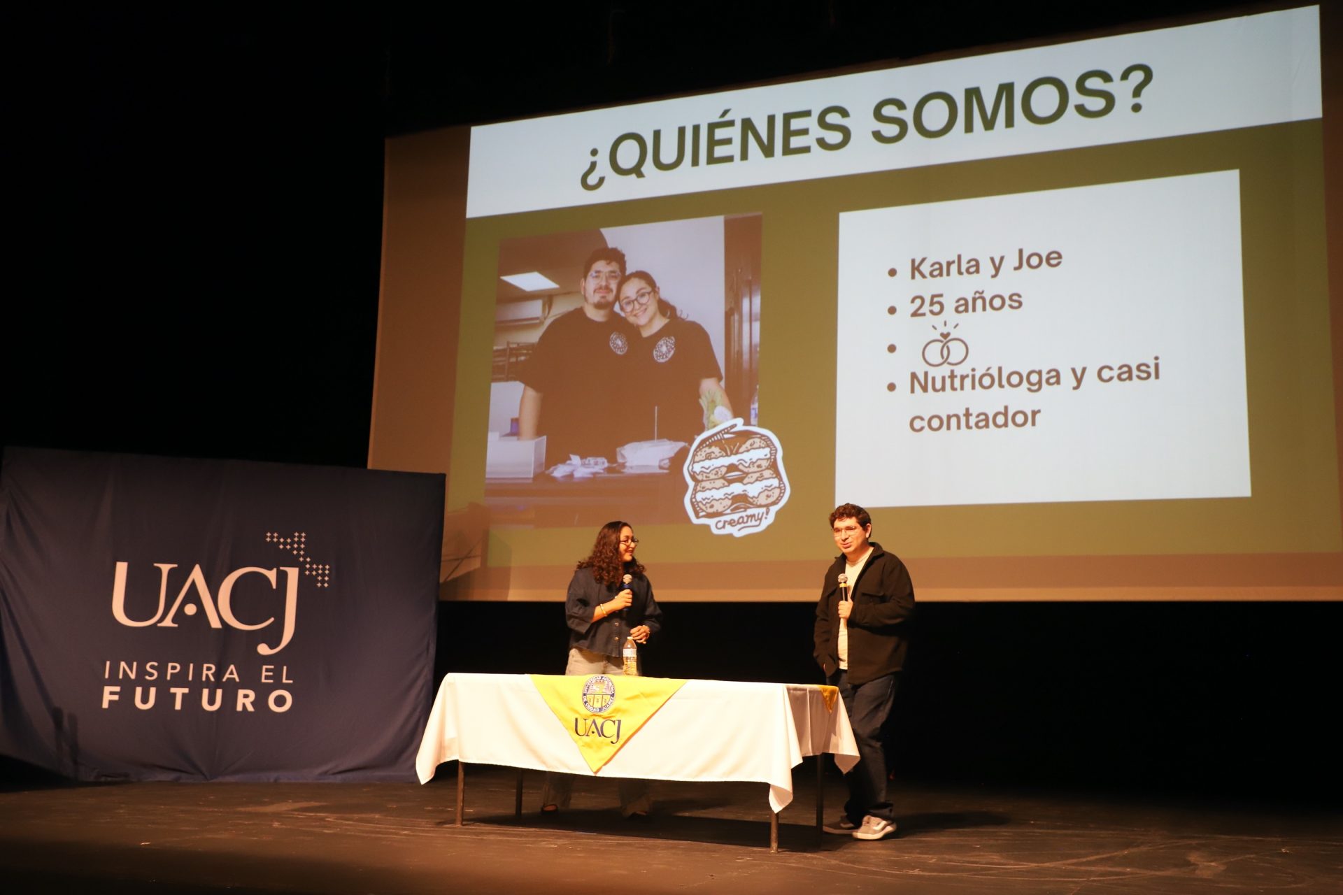 Durante la conferencia magistral de “Emprendízate”, Karla Edith Rodríguez Carreón, nutrióloga orgullosamente egresada de la Universidad Autónoma de Ciudad Juárez, y Joe Martínez González, compartieron su historia de emprendimiento con el propósito de inspirar a la comunidad universitaria