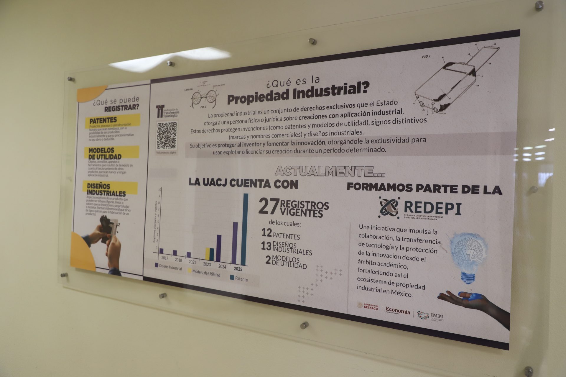 La campaña de Propiedad Industrial de la UACJ se presenta en el pasillo central de Rectoría mediante una exposición de 11 acrílicos que reúne 27 proyectos desarrollados por profesoras y profesores investigadores. La iniciativa surge desde la  Dirección General de Investigación y Transferencia Tecnológica