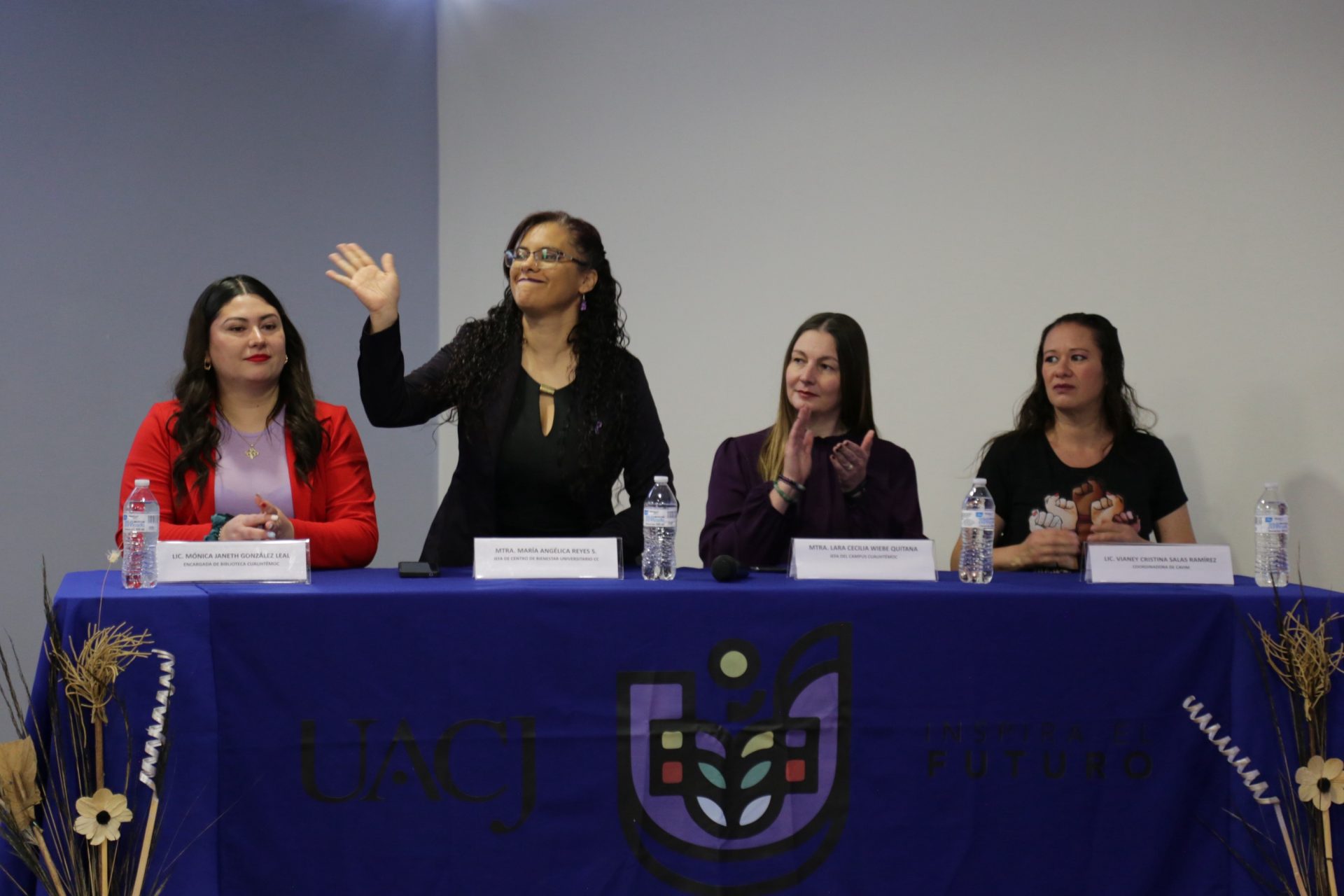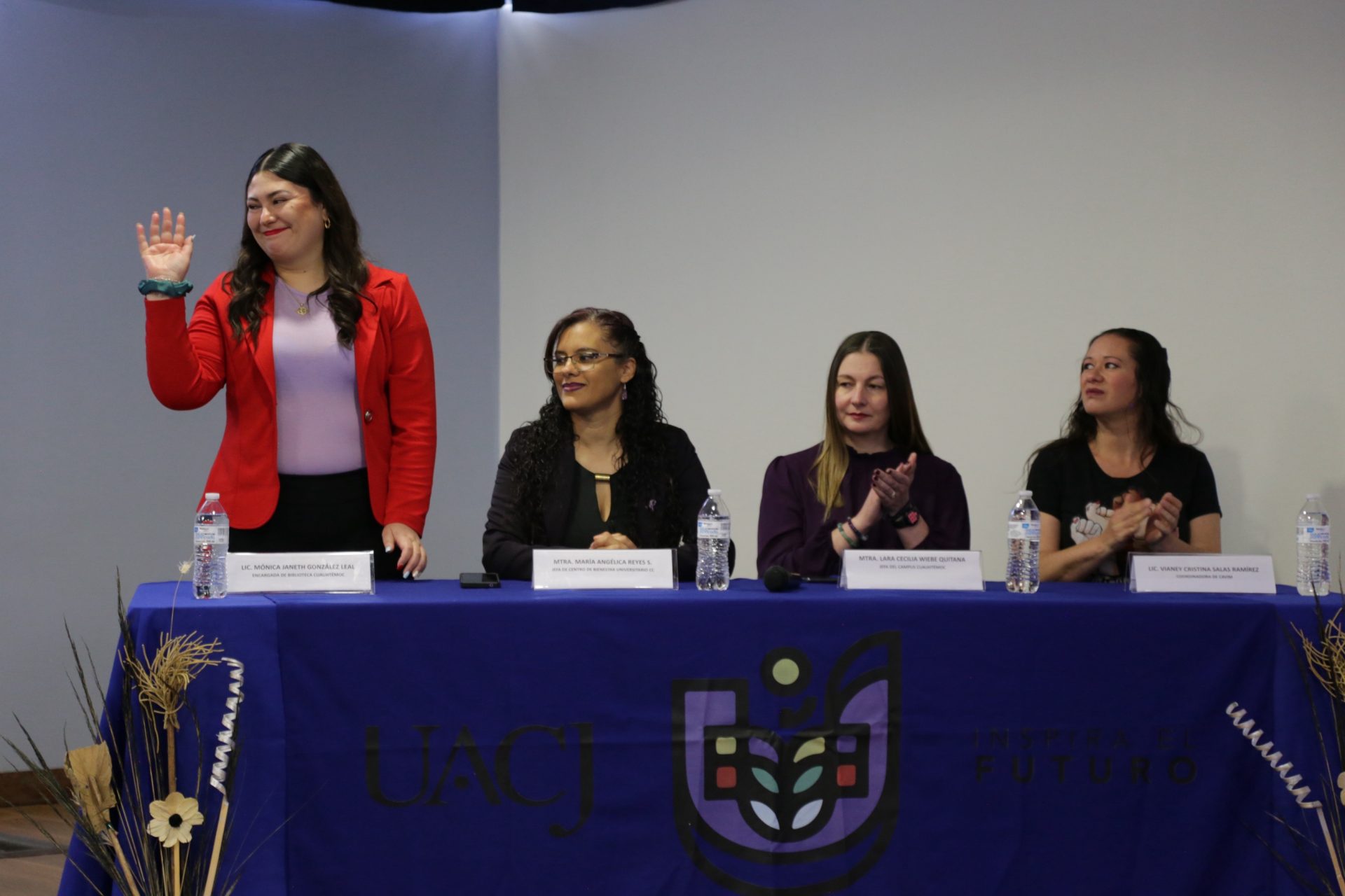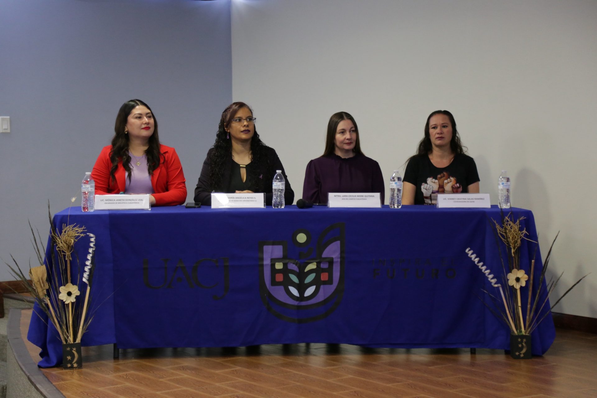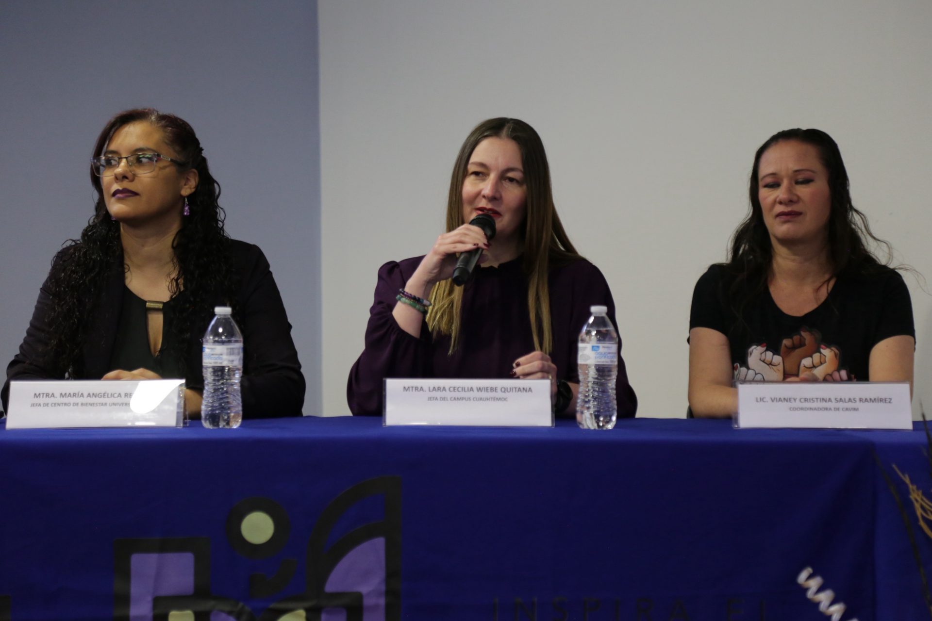 El acto inaugural contó con la participación de la maestra Lara Cecilia Wiebe Quintana, jefa del Campus Cuauhtémoc; la maestra María Angélica Reyes Sánchez, jefa del Centro de Bienestar Universitario(CBU); la licenciada Mónica Janeth González Leal; y la licenciada Vianney Cristina Salas Ramírez, coordinadora del Centro de Atención a la Violencia contra la Mujer (CAVIM) e integrante del Comité Municipal para la Prevención, Atención, Sanción y Erradicación de la Violencia.