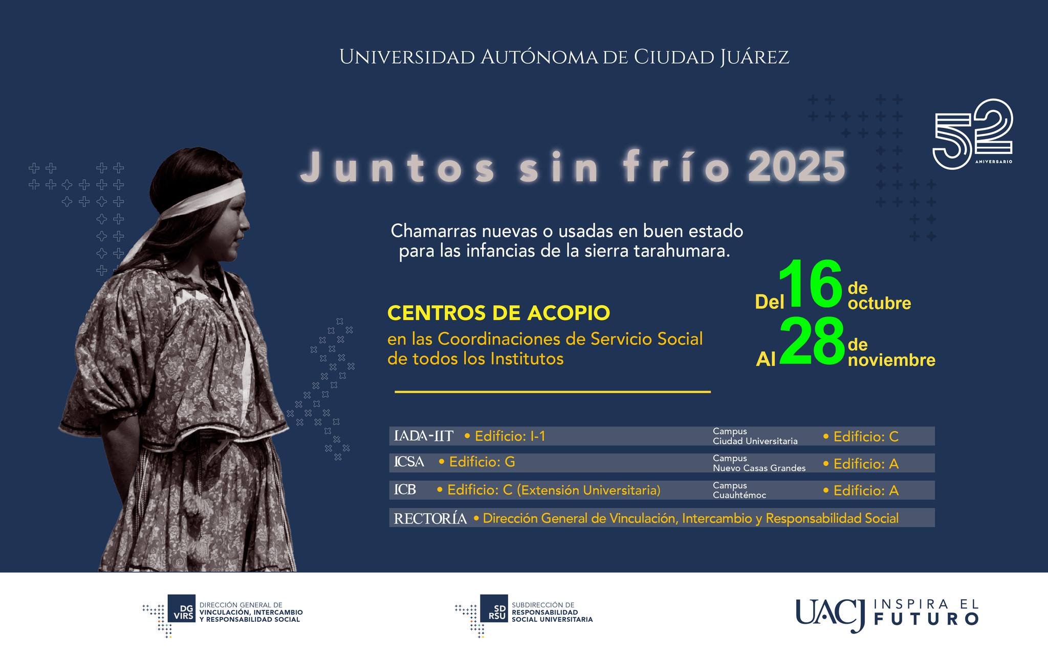 La Universidad Autónoma de Ciudad Juárez (UACJ), a través de la Dirección de Vinculación, Intercambio y Responsabilidad Social invita a la comunidad a seguir participando en la campaña “Juntos Sin Frío 2025”, con el propósito de recolectar chamarras para donarlas a niños y niñas de la Sierra Tarahumara.