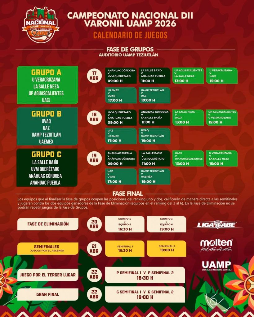 La Liga de Asociación de Básquetbol Estudiantil (ABE) ha revelado oficialmente el calendario de juegos para el Campeonato Nacional de la División II Varonil 2026, que tendrá como sede el Auditorio de la Universidad Americana de Puebla (UAMP) en Teziutlán.