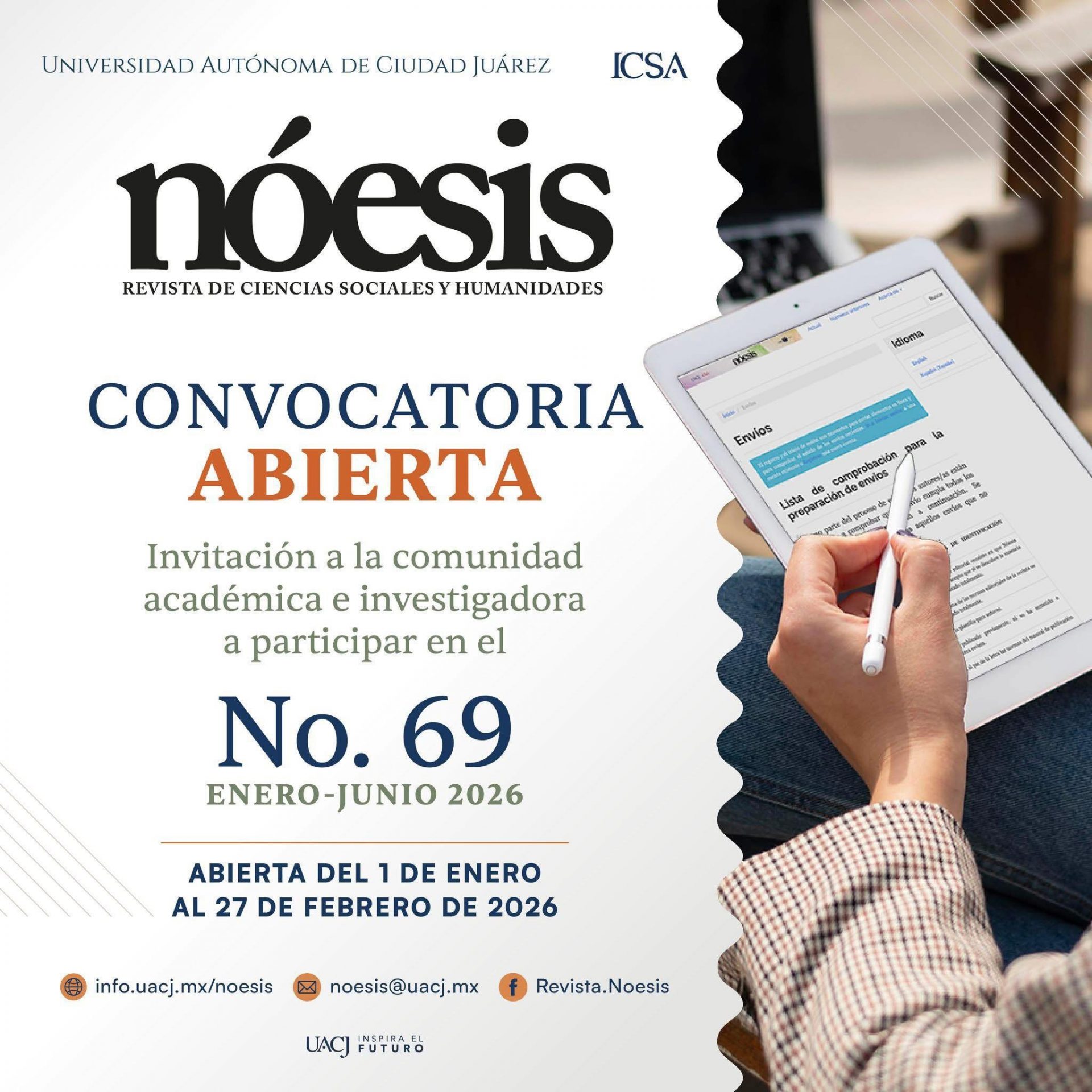 “Noésis” es una revista electrónica de la Universidad Autónoma de Ciudad Juárez, evaluada por pares, indizada internacionalmente y adscrita al Instituto de Ciencias Sociales y Administración (ICSA). El doctor Isaac Leobardo Sánchez Juárez, coordinador editorial, indicó que se convoca a todos los investigadores de las ciencias sociales y humanísticas para que sometan a revisión investigaciones para su posible publicación, en caso de cumplir con los requisitos.