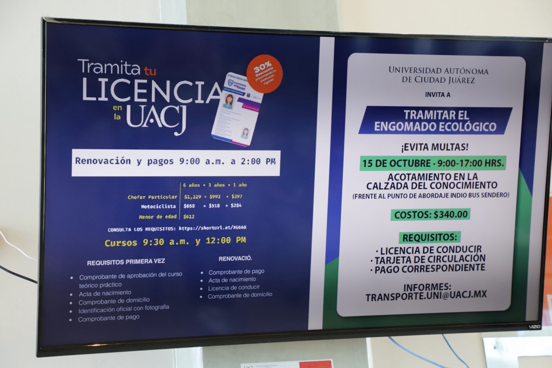 A fin de facilitar a la comunidad universitaria el acercamiento a trámites de servicios gubernamentales, así como el fomento a la cultura de la legalidad en la movilidad urbana, la Universidad Autónoma de Ciudad Juárez (UACJ) a través de la Dirección General de Vinculación, Intercambio y Responsabilidad Social (DGVIRS) llevó a cabo la última jornada especial de trámite de licencias de conducir en el Campus de Ciudad Universitaria (CCU), auspiciada por la Secretaría de Seguridad Pública del Estado (SSPE).