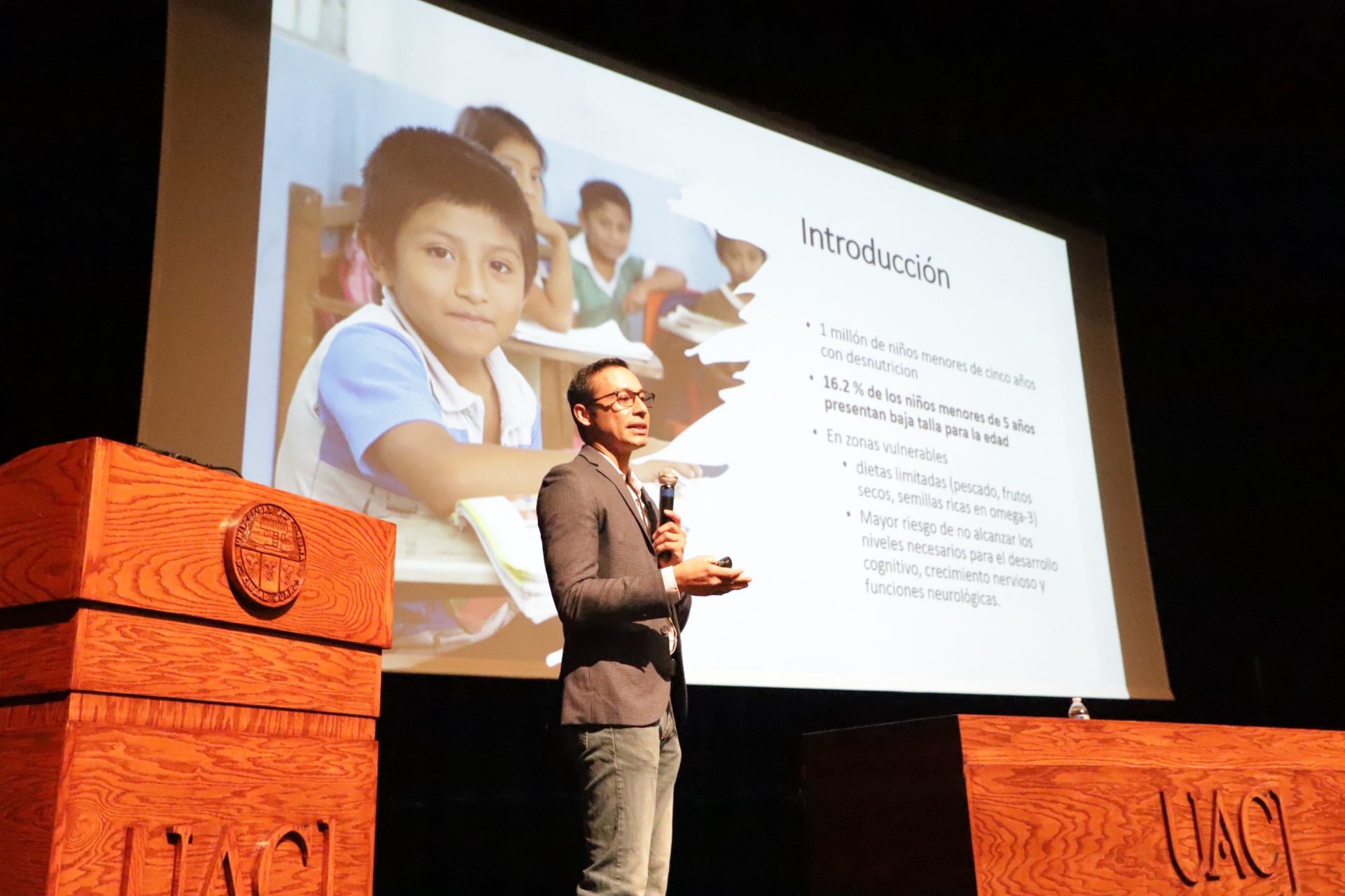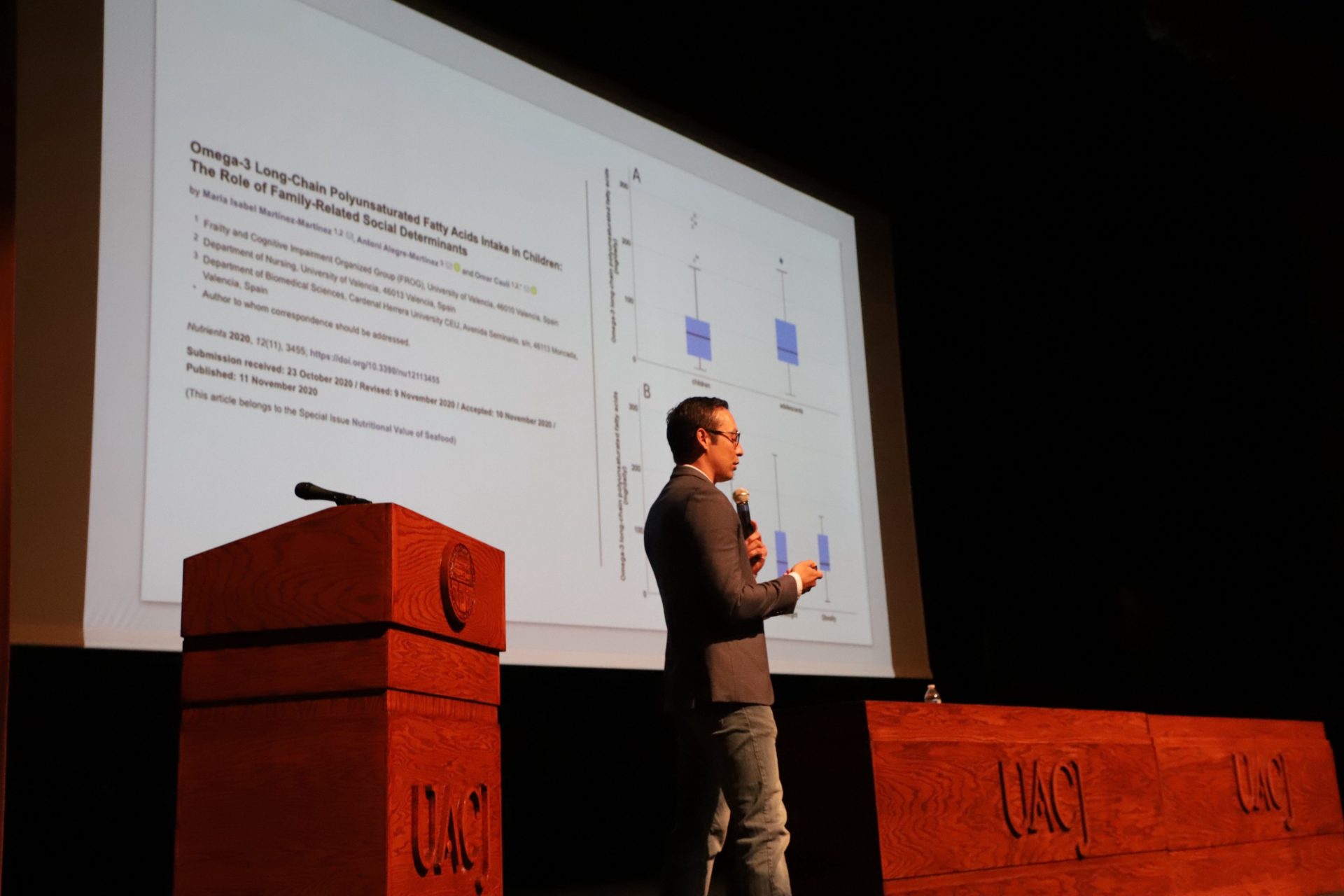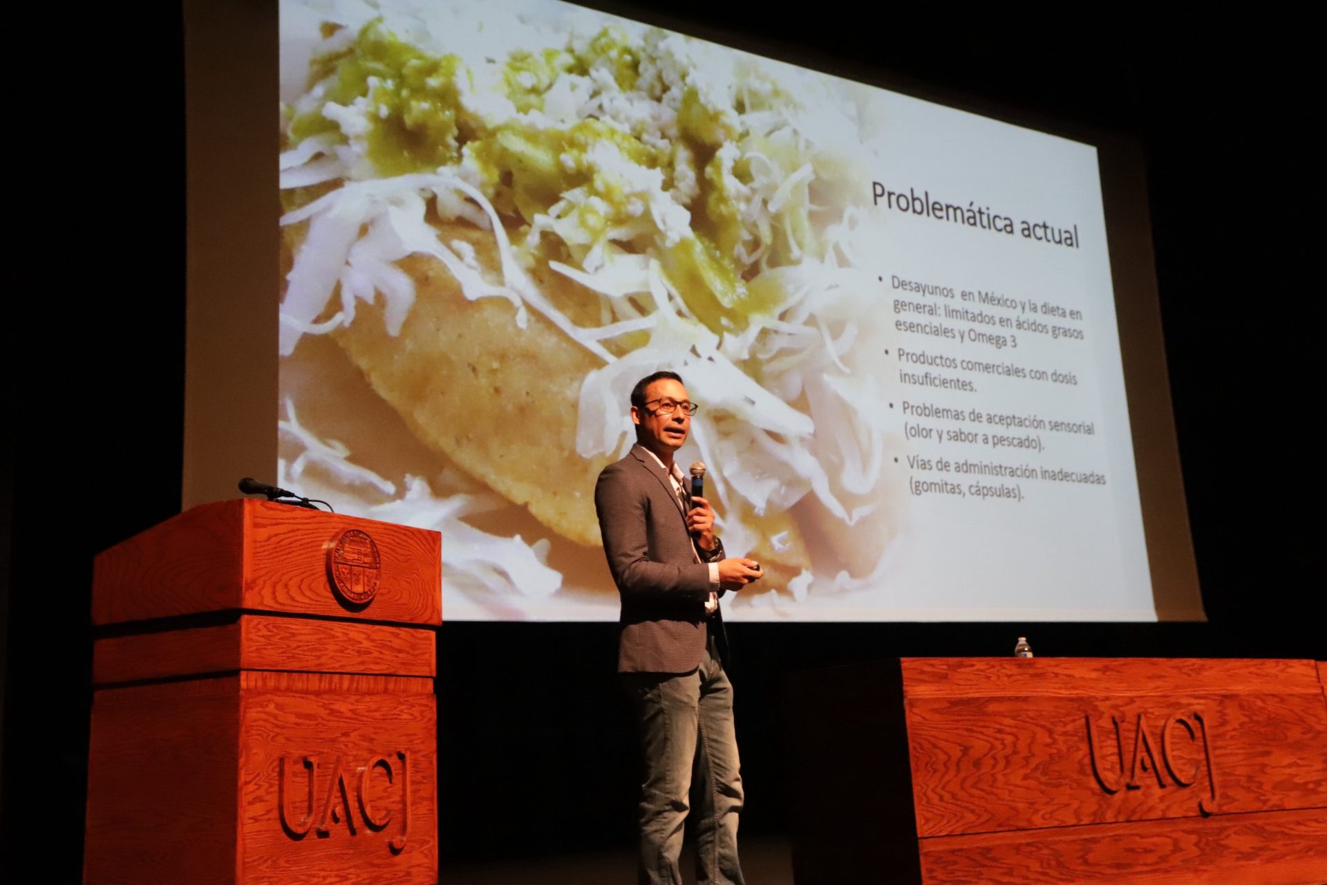 Posterior a la declaratoria inaugural del evento, efectuada por la maestra Hernández García, en representación del doctor Daniel Alberto Constandse Cortez, rector de la UACJ, el doctor Jorge Carrasco González, experto en ciencia aplicada en biología molecular, dispositivos médicos, suplementación deportiva y nutraceúticos, ofreció la primera conferencia magistral titulada “Desarrollo de productos con Omega 3 para desayunos escolares”, en la que subrayó la importancia de fortalecer los programas de alimentación dirigidos a la niñez.