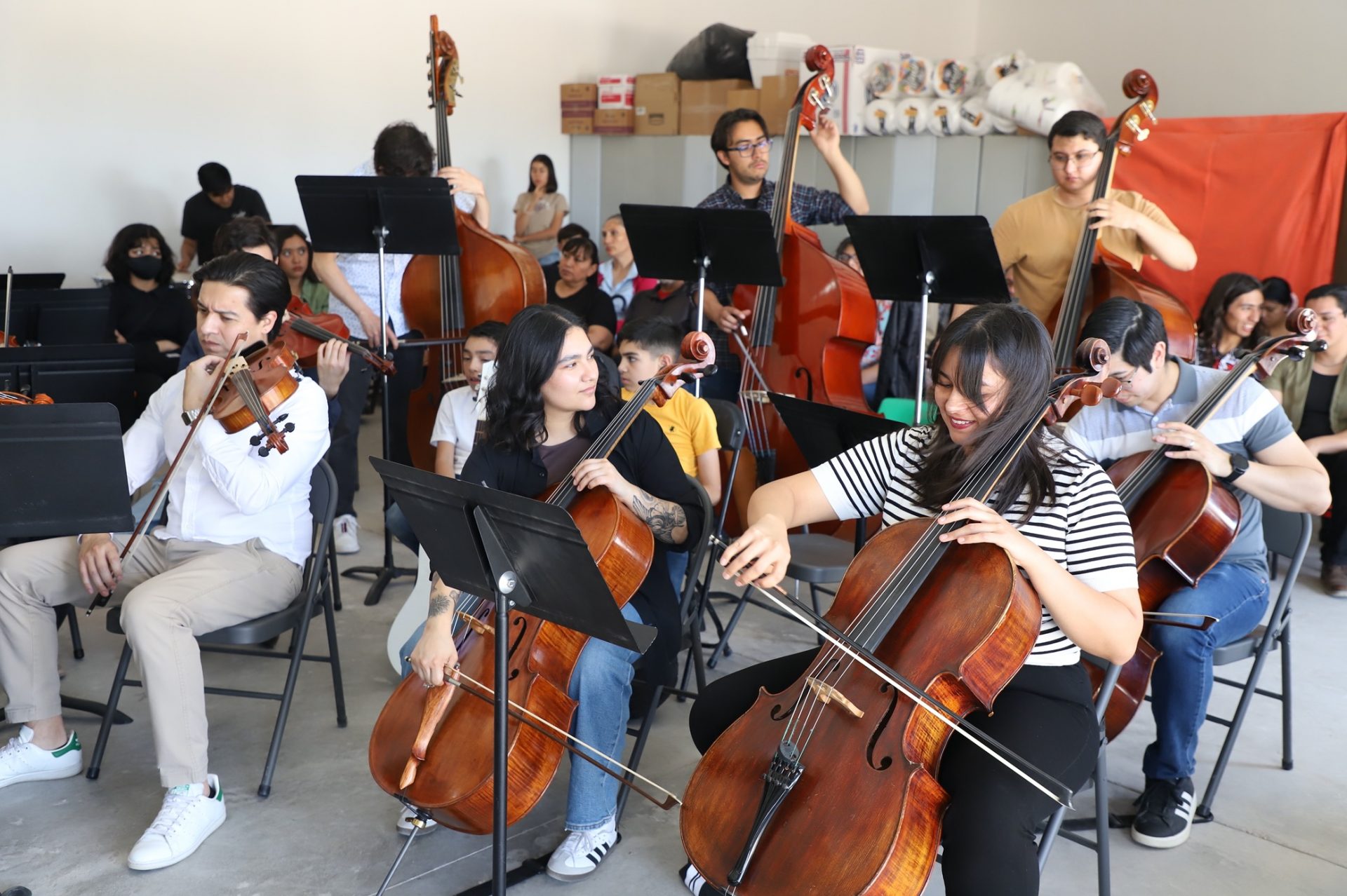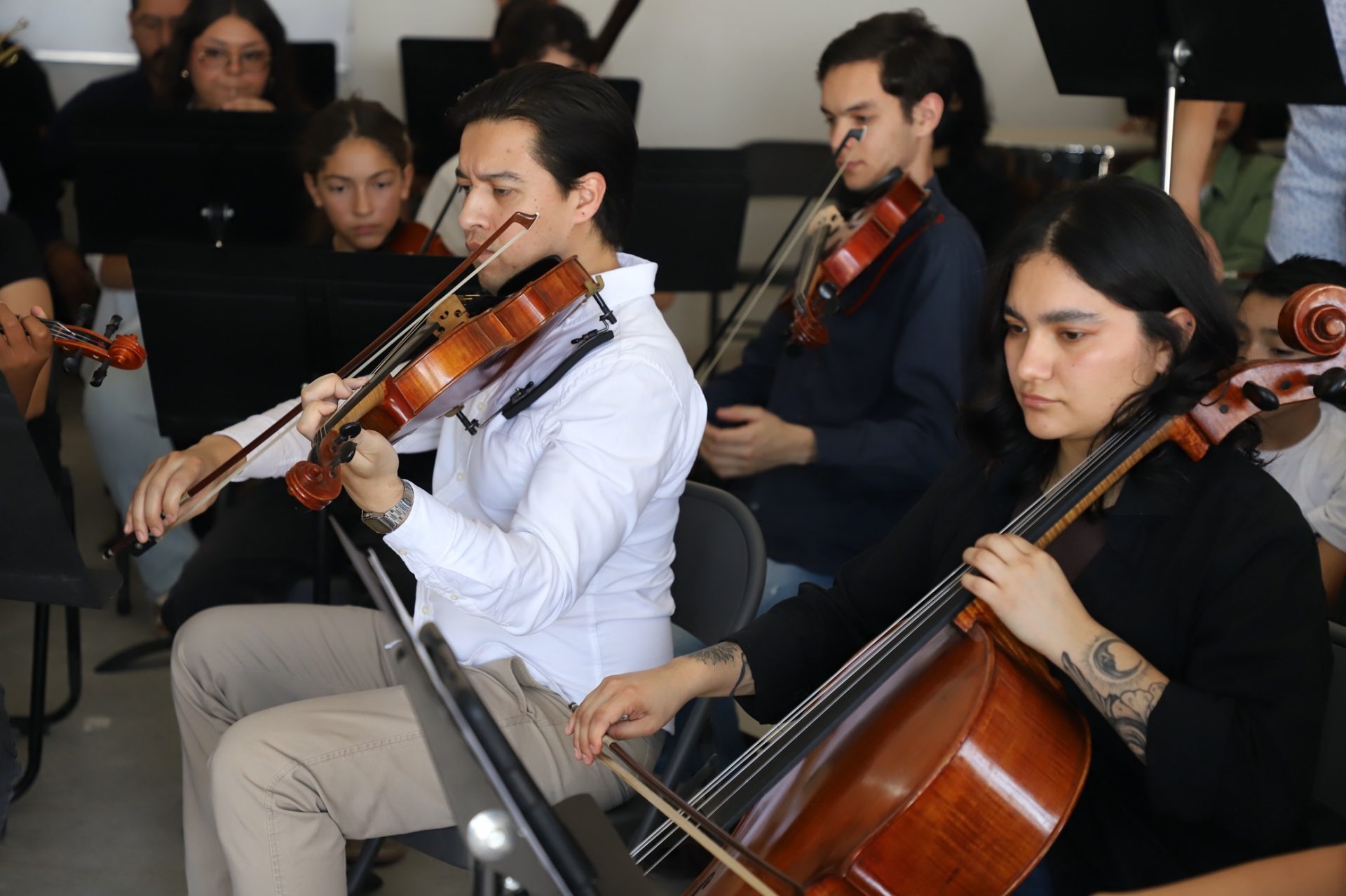 Después de la afinación de instrumentos la Orquesta Sinfónica Juvenil de la UACJ expandió la magia musical en el Centro Comunitario.
