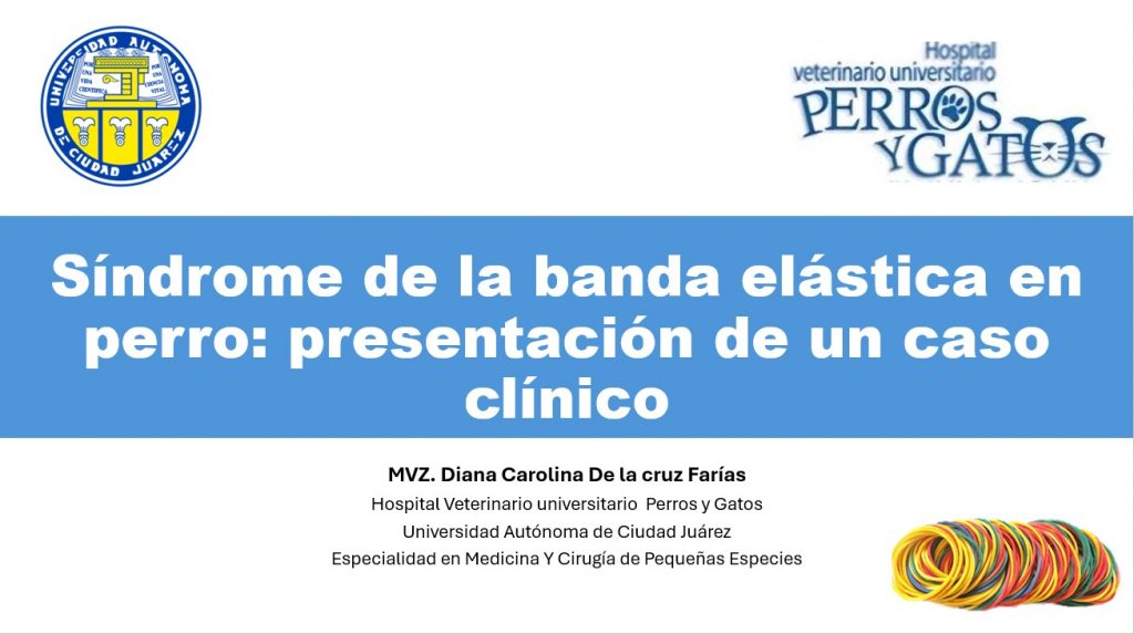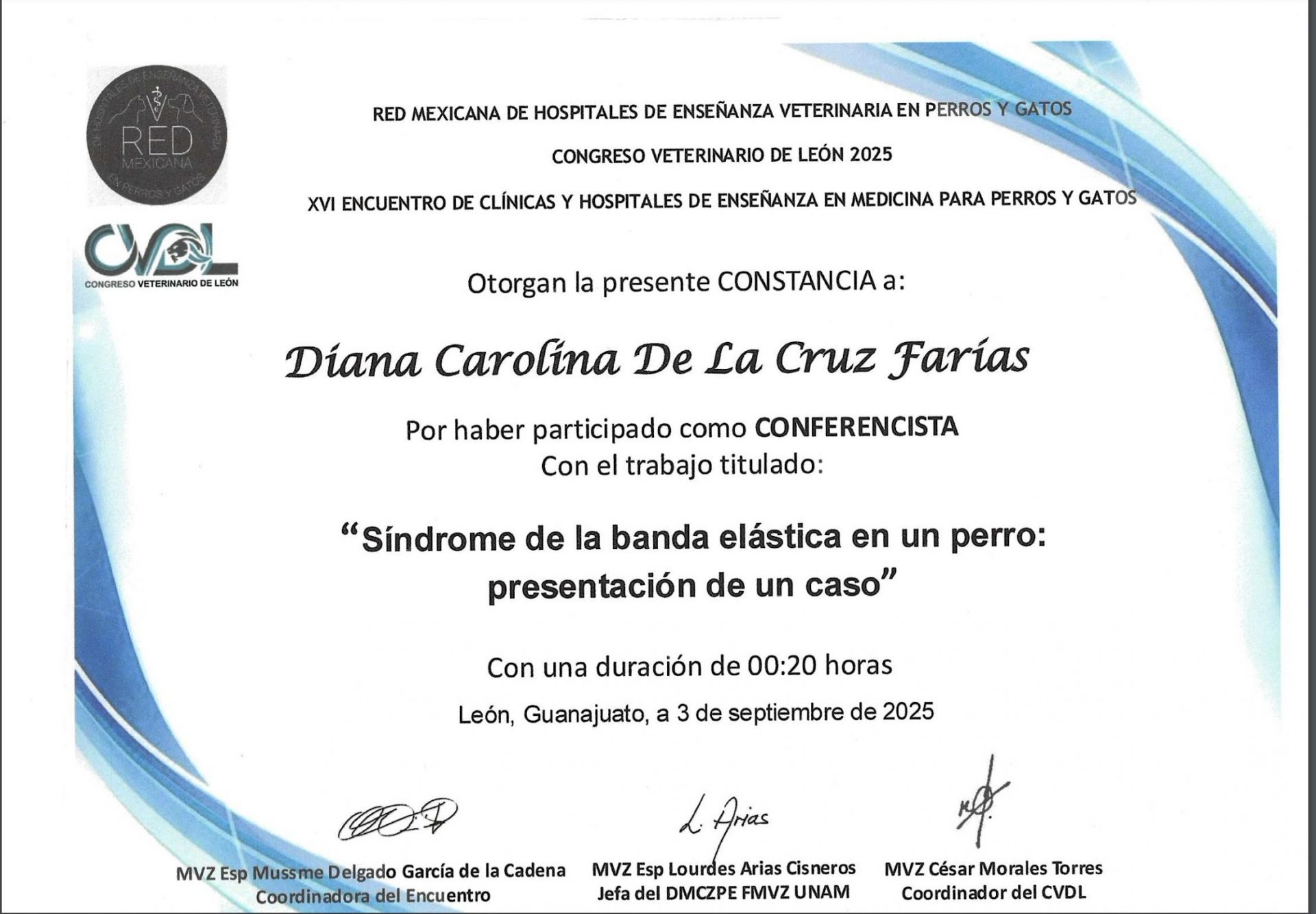 La médico veterinario zootecnista Diana Carolina De la Cruz Farías, adscrita al Instituto de Ciencias Biomédicas (ICB) de la Universidad Autónoma de Ciudad Juárez (UACJ), obtuvo el primer lugar en la categoría de presentaciones clínicas con el trabajo “Síndrome de la banda elástica en perro: presentación de un caso clínico”.