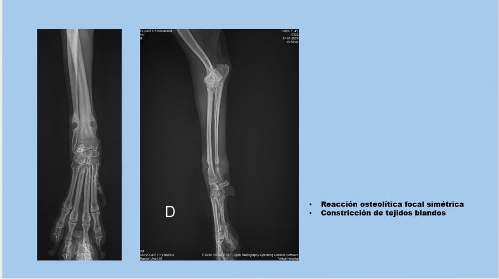 “Es un caso muy peculiar, realmente hay muy pocos reportes, sobre todo en español; por lo general, los reportes que encontré de este tipo de casos son de la India o algunos de Estados Unidos. Básicamente es cuando a un perro o algún gato, también, se le llega a encarnar una liga en su pata o en su cola y esta llega a penetrar hasta el hueso y la piel recubre nuevamente esta liga, haciendo que estas dos especies tengan una claudicación o una cojera persistente sin descubrir una causa esencial”, relata Diana.