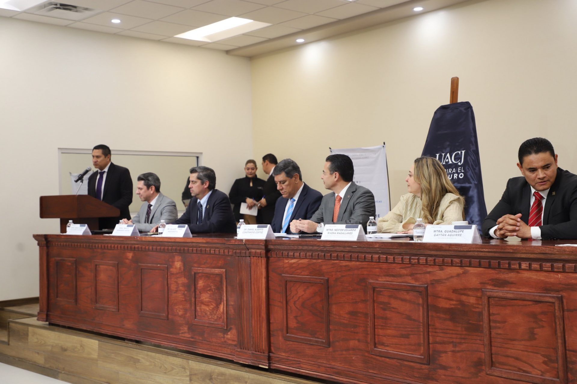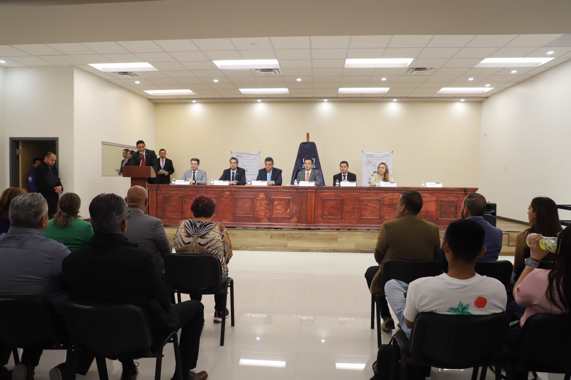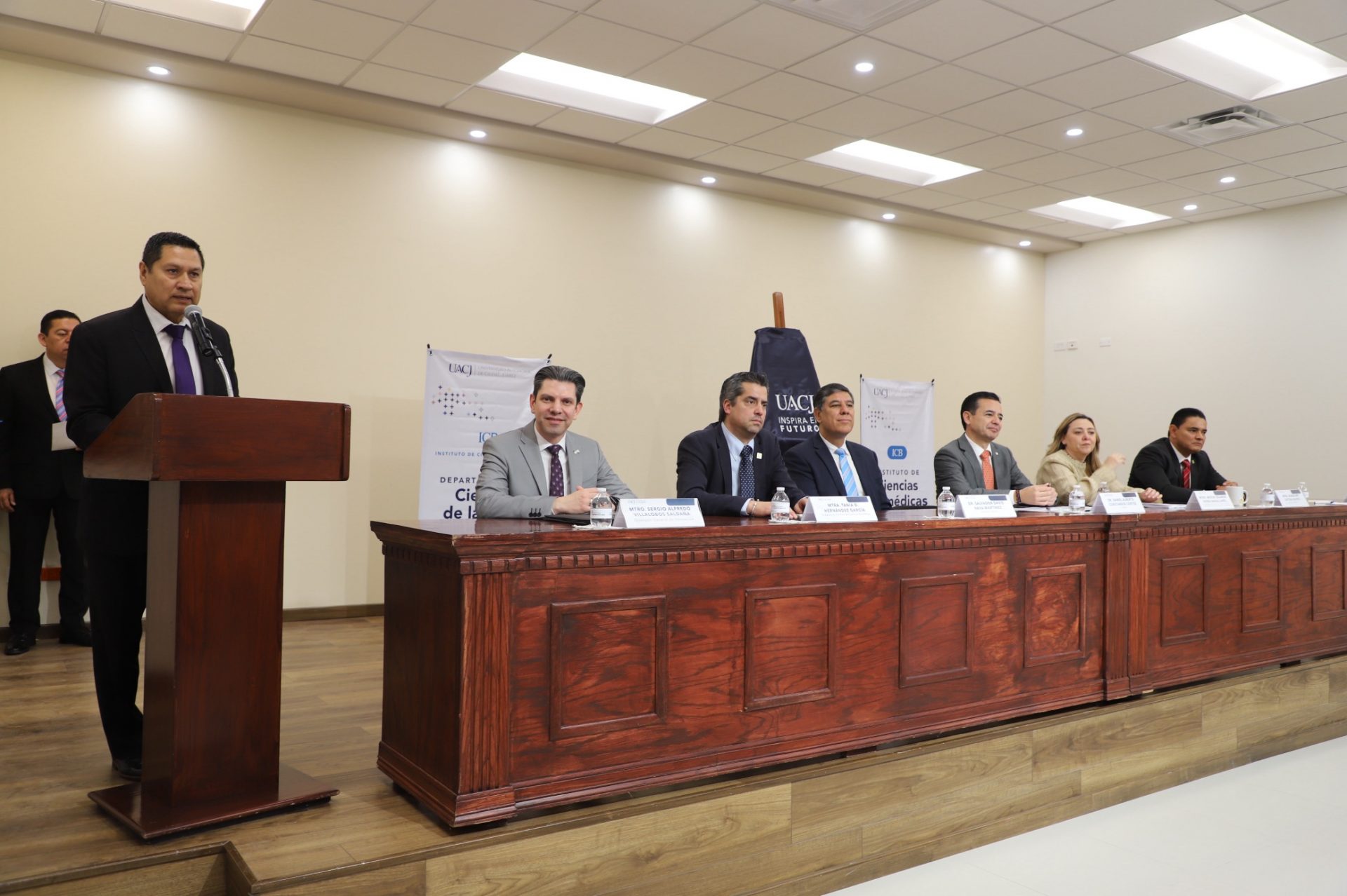 El titular de esta casa de estudios estuvo acompañado en el presídium por el doctor Salvador David Nava Martínez, secretario general; la maestra María Guadalupe Gaytán Aguirre, secretaria académica; el maestro Néstor Eduardo Rivera Magallanes, presidente del COMACAF; la maestra Tania Dolores Hernández García, directora del Instituto de Ciencias Biomédicas (ICB), quien no pudo asistir por causas de fuerza mayor, estuvo representada por el doctor Luis Felipe Fornelli Martín del Campo, jefe del Departamento de Estomatología; el maestro Gabriel Medrano Don Lucas, jefe del Departamento de Ciencias de la Salud y el maestro Sergio Villalobos Saldaña, director general de Innovación Educativa.