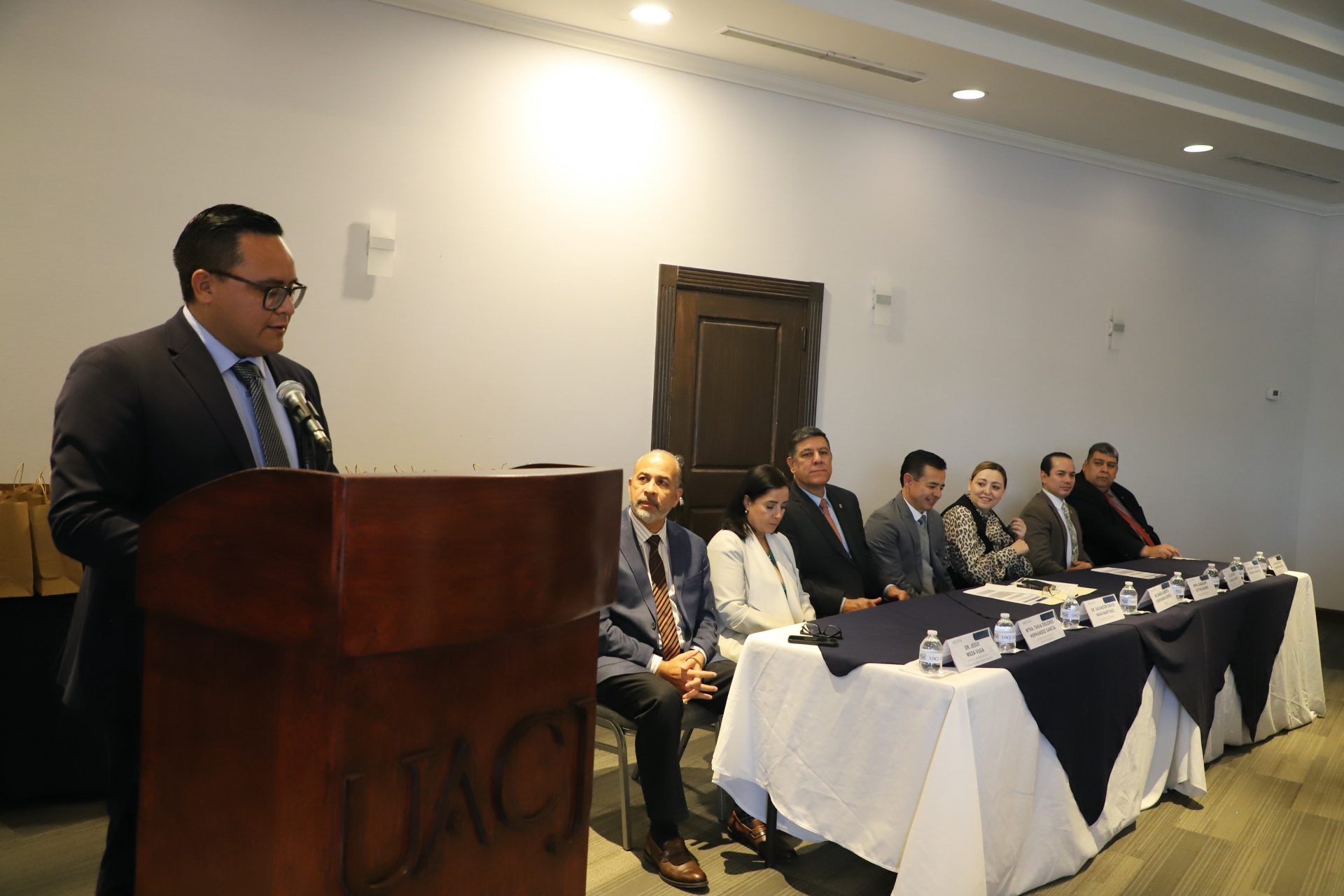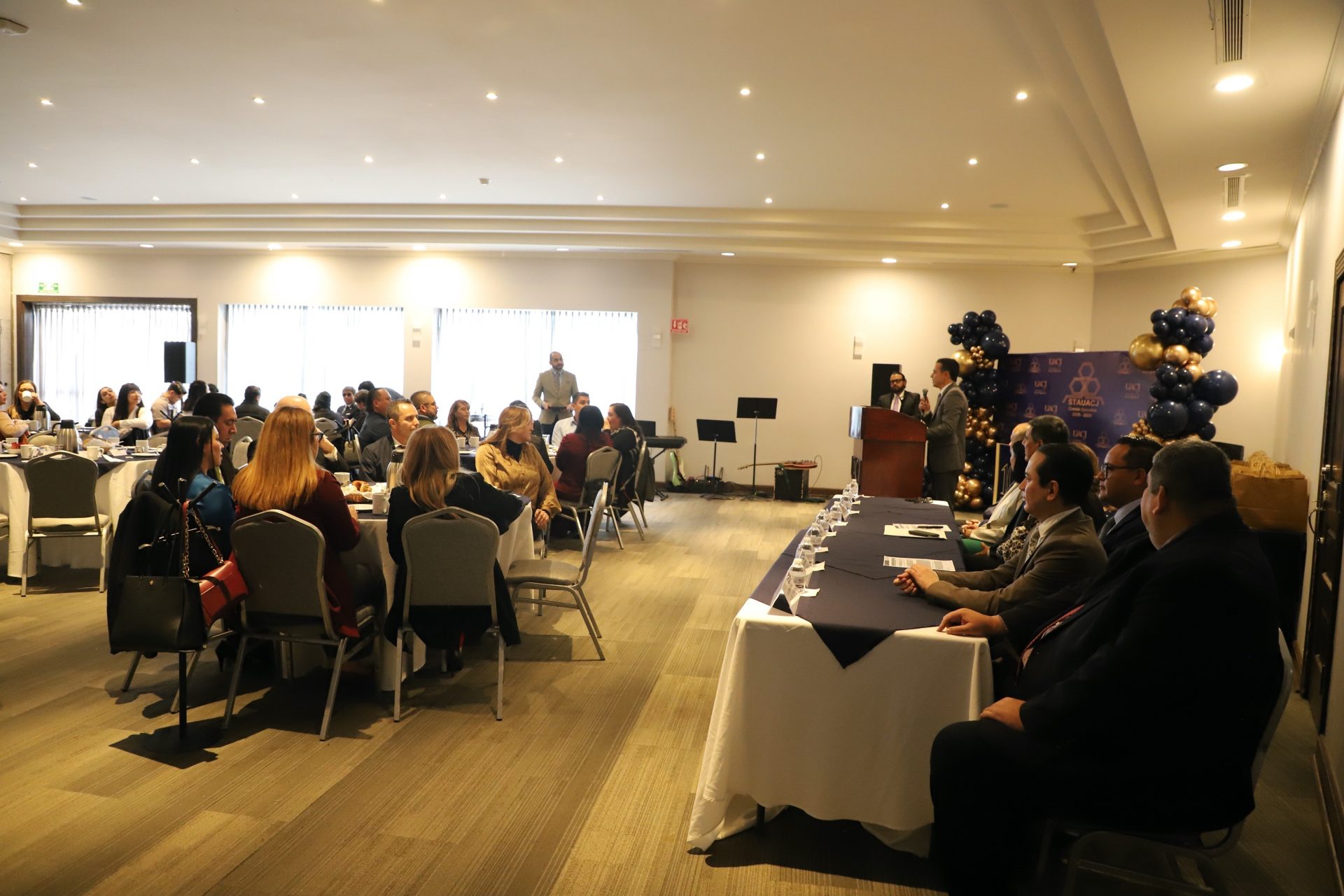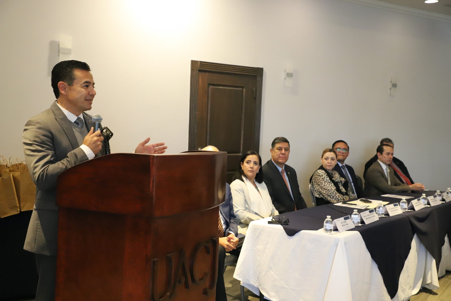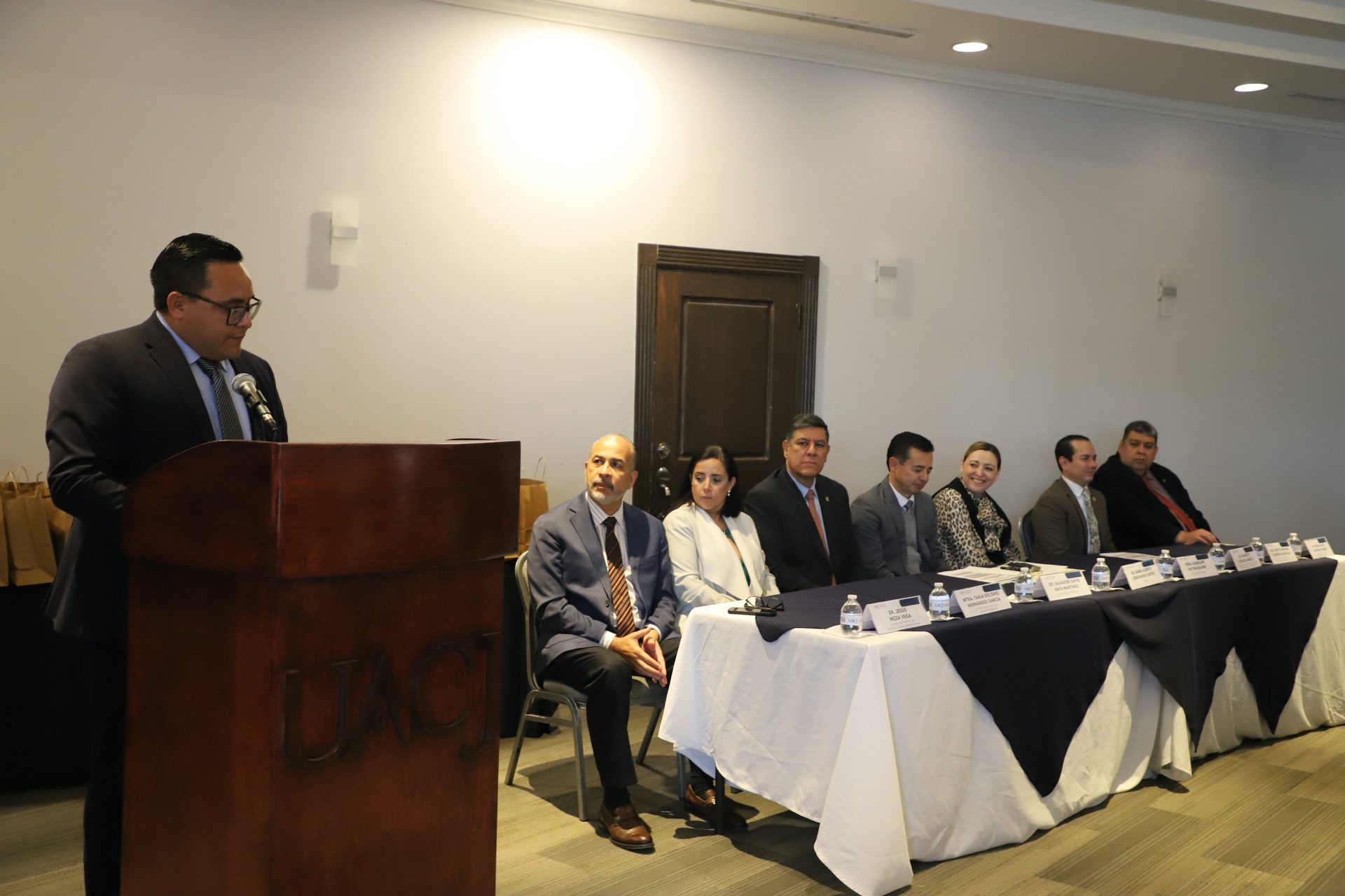 En el presídium se contó con la compañía del doctor Daniel Alberto Constandse Cortez, rector; del doctor Salvador Nava Martínez, secretario general; de la maestra María Guadalupe Gaytán Aguirre, secretaría académica; de la maestra Tania Dolores Hernández García, directora del Instituto de Ciencias Biomédicas; del doctor Fausto Enrique Aguirre Escárcega, director del Instituto de Arquitectura, Diseño y Arte; doctor Jesús Meza Vega, director del Instituto de Ciencias Sociales y Administración; y del doctor Erwin Adán Martínez Gómez, director del Instituto de Ingeniería y Tecnología.