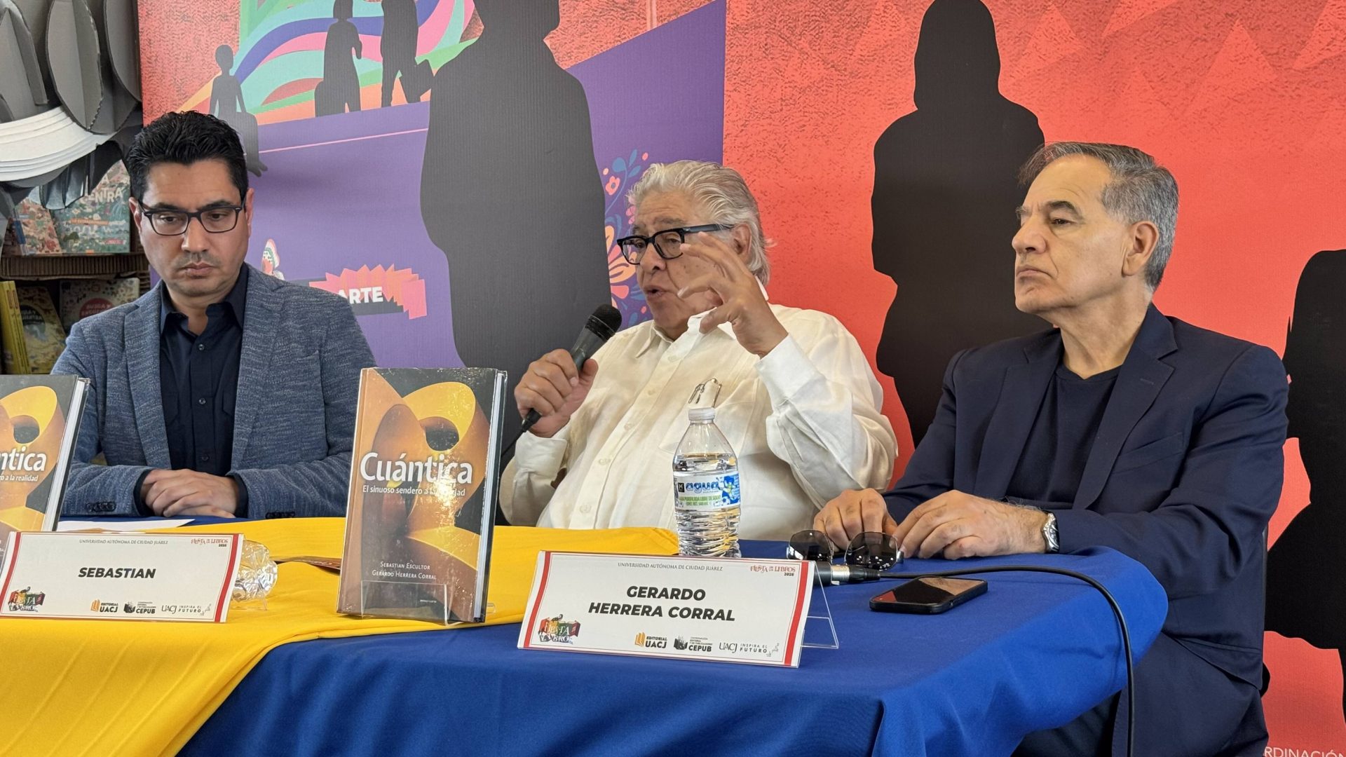 “Cuántica es un libro de ciencia y arte. Es un libro en el que se presentan textos divulgativos sobre la mecánica cuántica, sobre los temas ‘sexis’ de la mecánica cuántica y que van acompañados de obra plástica del Maestro Sebastián”, manifestó Herrera.