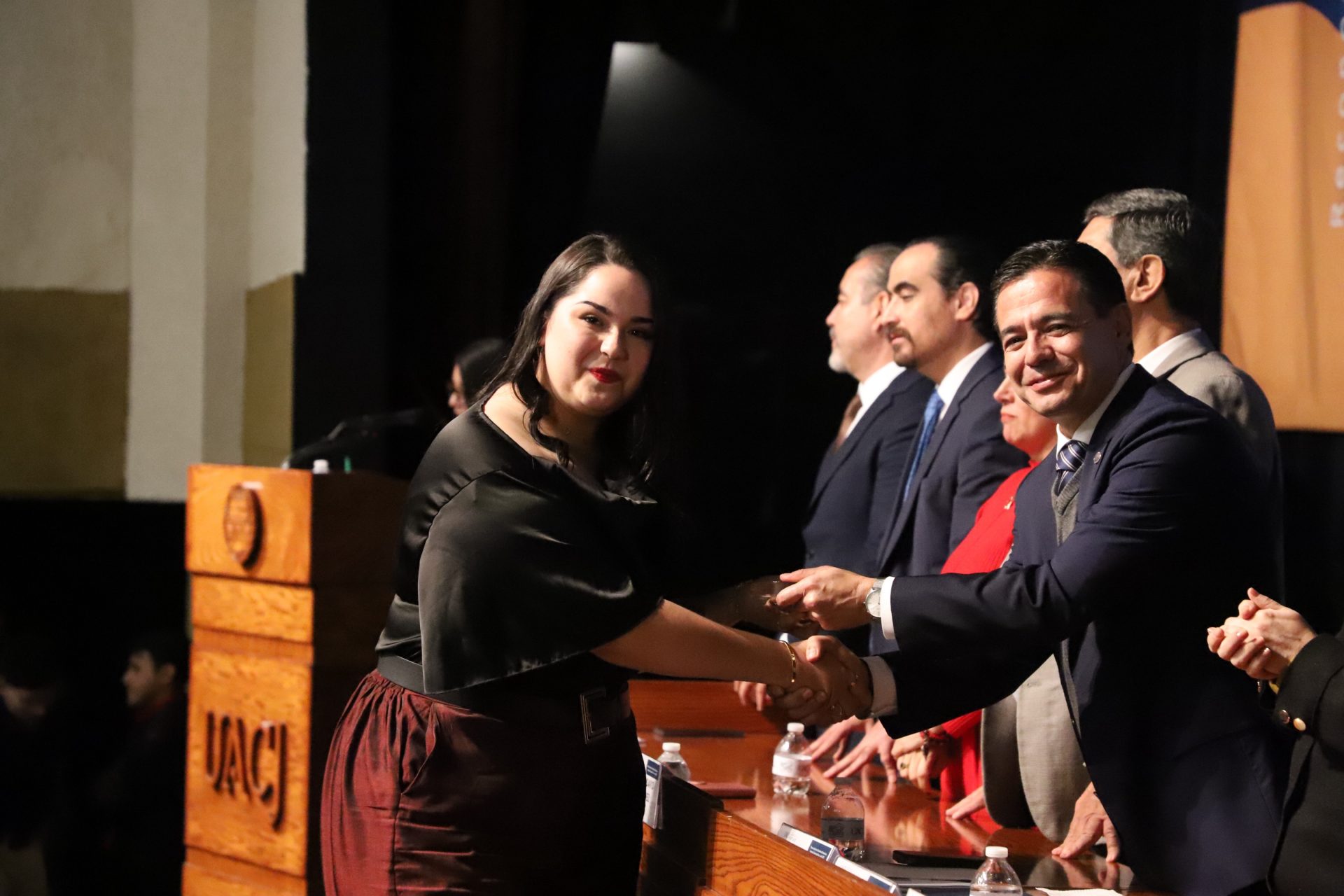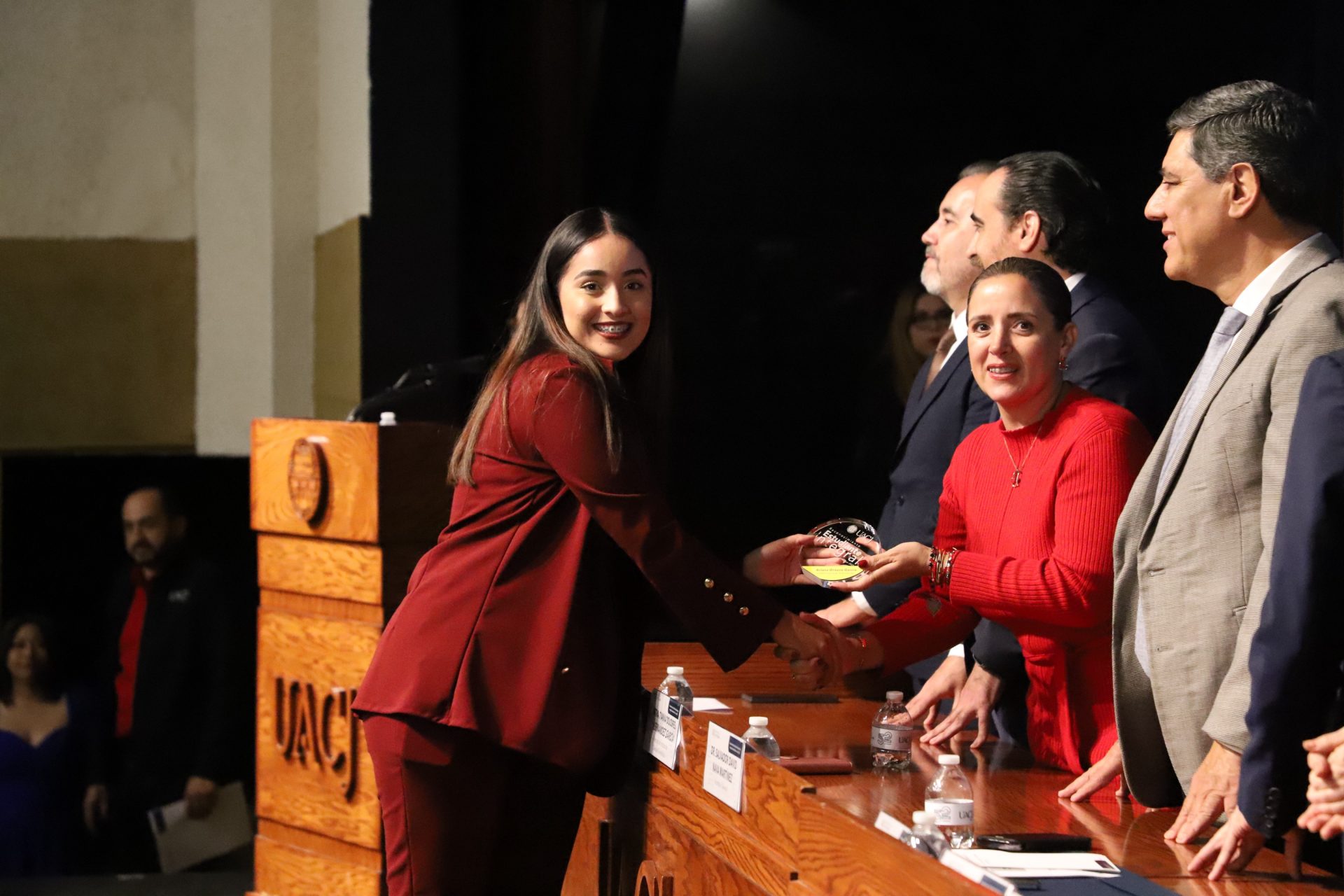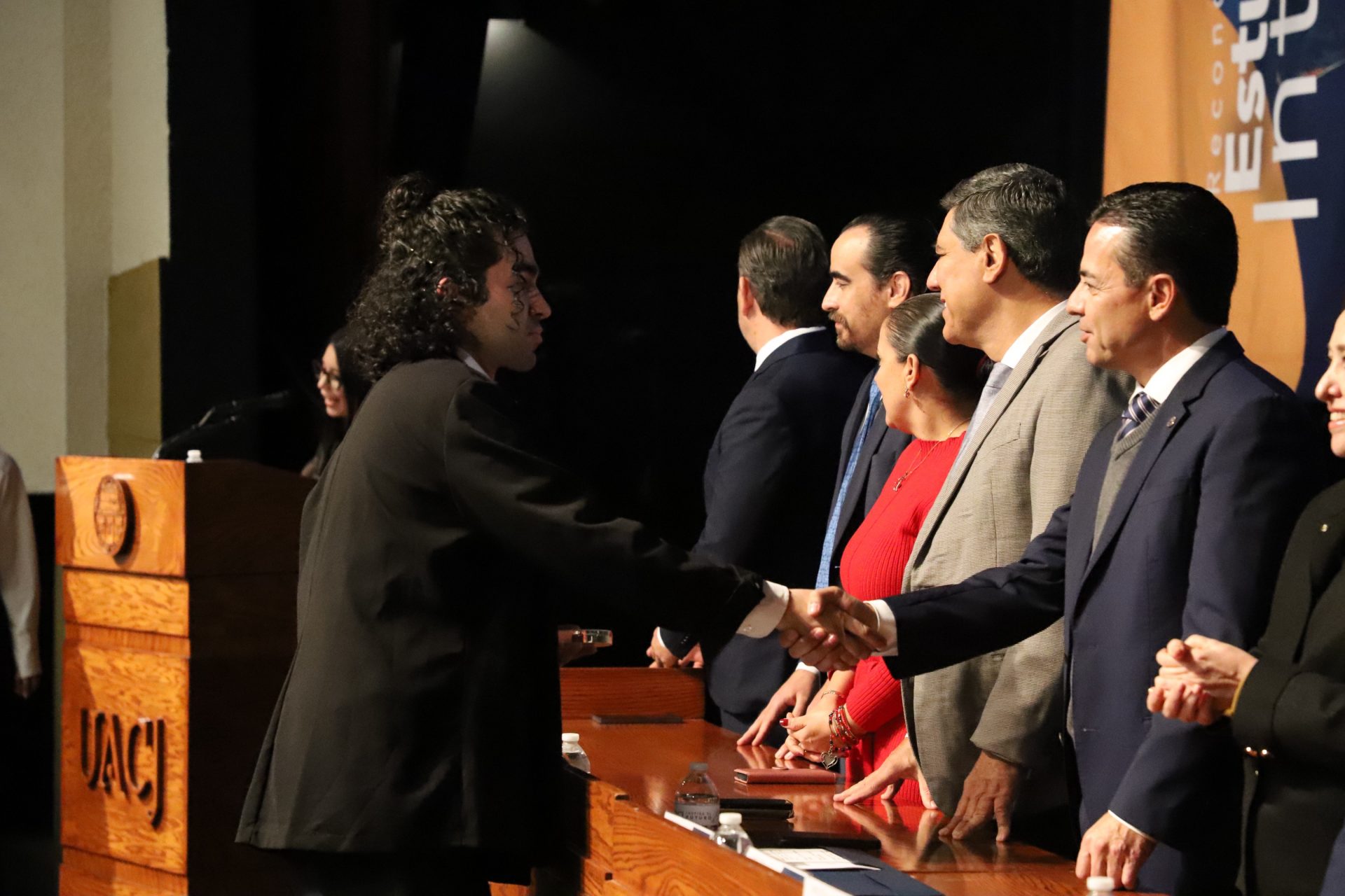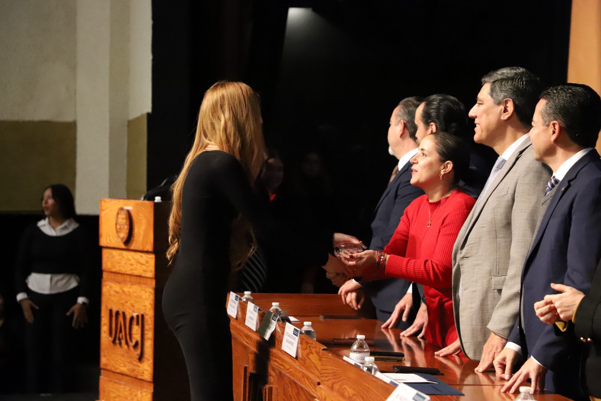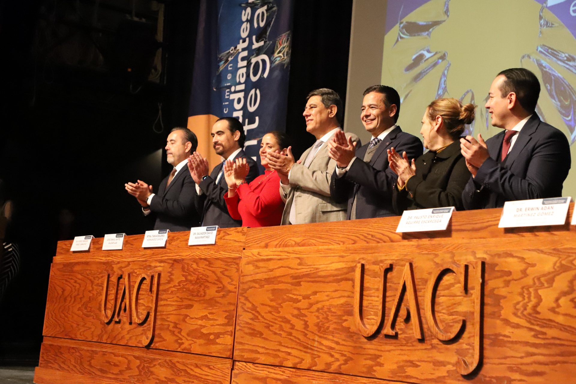 El presídium estuvo integrado por el doctor Daniel Constandse Cortez, rector de la Universidad Autónoma de Ciudad Juárez; la maestra Guadalupe Gaytán Aguirre, secretaria académica; el doctor Salvador Nava Martínez, secretario general; el doctor Pedro Enrique Yánez Camacho, director general de Bienestar Universitario; la doctora Gabriela Ortega Estrada, jefa del Campus Ciudad Universitaria; el doctor Fausto Enrique Aguirre Escárcega, director del Instituto de Arquitectura, Diseño y Arte; la maestra Tania Dolores Hernández García, directora del Instituto de Ciencias Biomédicas; el maestro José Daniel Sayto Calzadillas, jefe del Departamento de Ciencias Jurídicas, en representación del doctor Jesús Meza Vega, director del Instituto de Ciencias Sociales y Administración; el doctor Erwin Adán Martínez Gómez, director del Instituto de Ingeniería y Tecnología y el licenciado Claudio Armando Reyes Macías, subdirector de Promoción y Fomento de Bienestar.