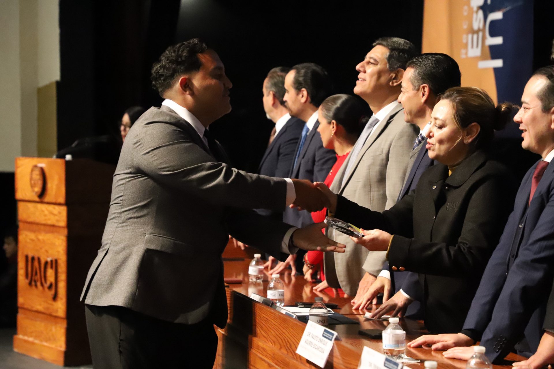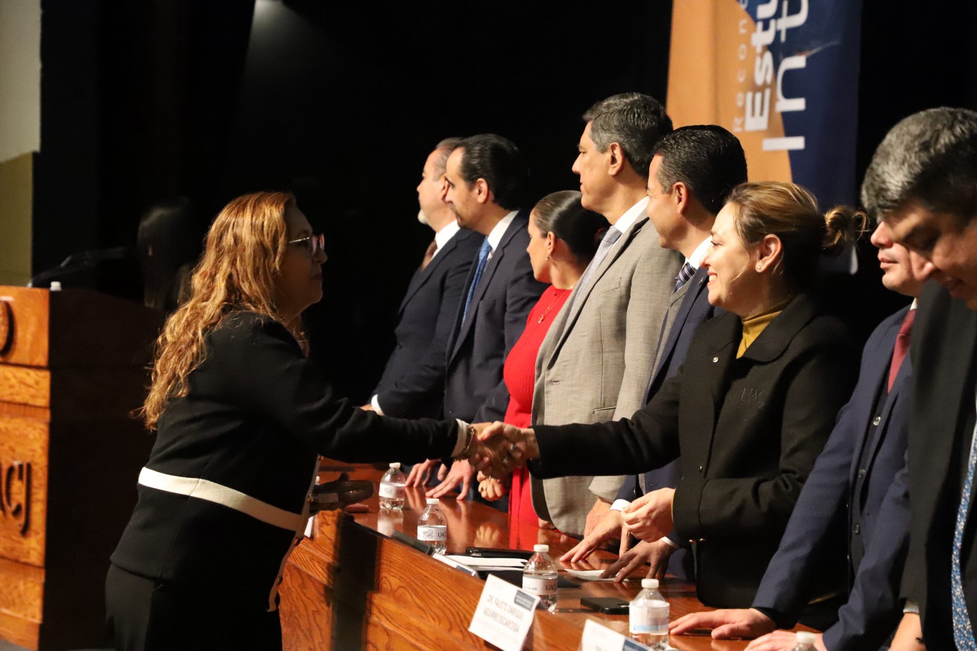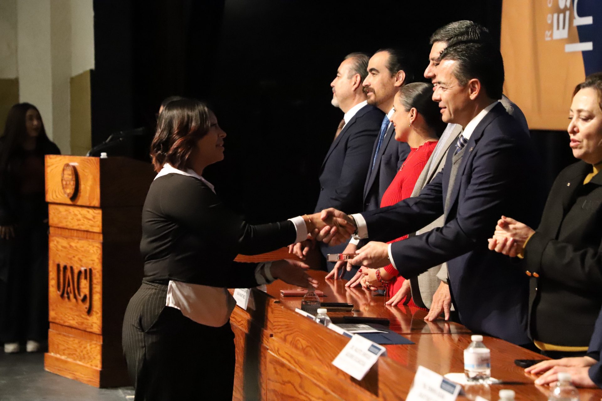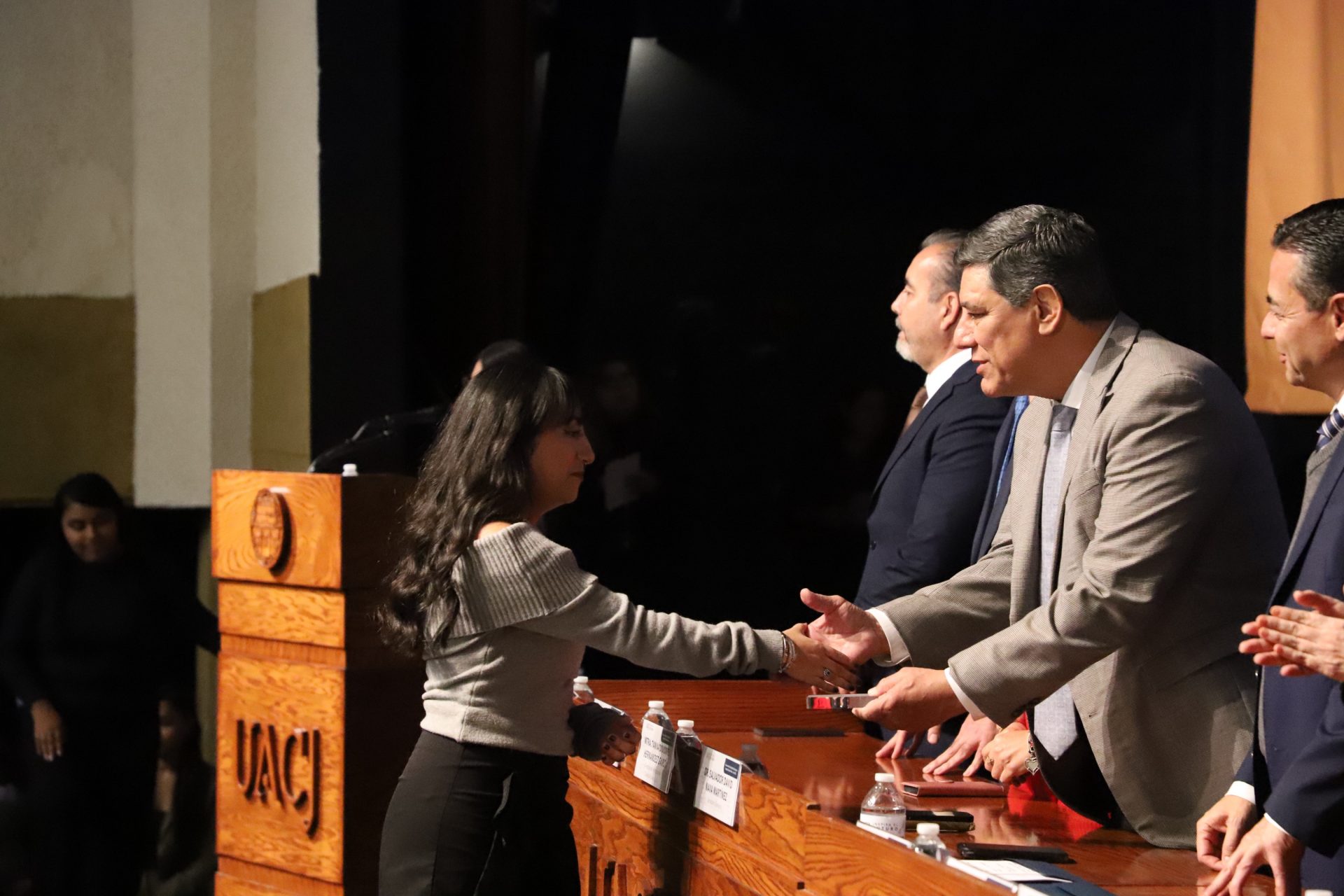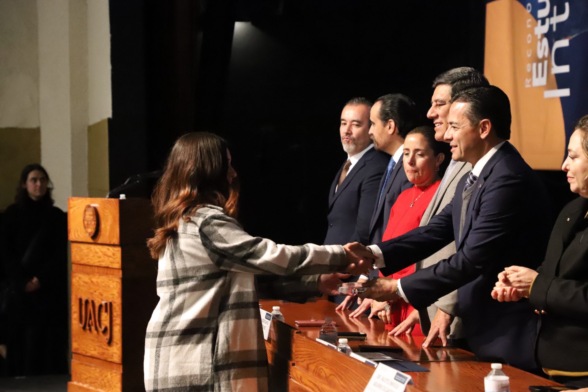 El presídium estuvo integrado por el doctor Daniel Constandse Cortez, rector de la Universidad Autónoma de Ciudad Juárez; la maestra Guadalupe Gaytán Aguirre, secretaria académica; el doctor Salvador Nava Martínez, secretario general; el doctor Pedro Enrique Yánez Camacho, director general de Bienestar Universitario; la doctora Gabriela Ortega Estrada, jefa del Campus Ciudad Universitaria; el doctor Fausto Enrique Aguirre Escárcega, director del Instituto de Arquitectura, Diseño y Arte; la maestra Tania Dolores Hernández García, directora del Instituto de Ciencias Biomédicas; el maestro José Daniel Sayto Calzadillas, jefe del Departamento de Ciencias Jurídicas, en representación del doctor Jesús Meza Vega, director del Instituto de Ciencias Sociales y Administración; el doctor Erwin Adán Martínez Gómez, director del Instituto de Ingeniería y Tecnología y el licenciado Claudio Armando Reyes Macías, subdirector de Promoción y Fomento de Bienestar.