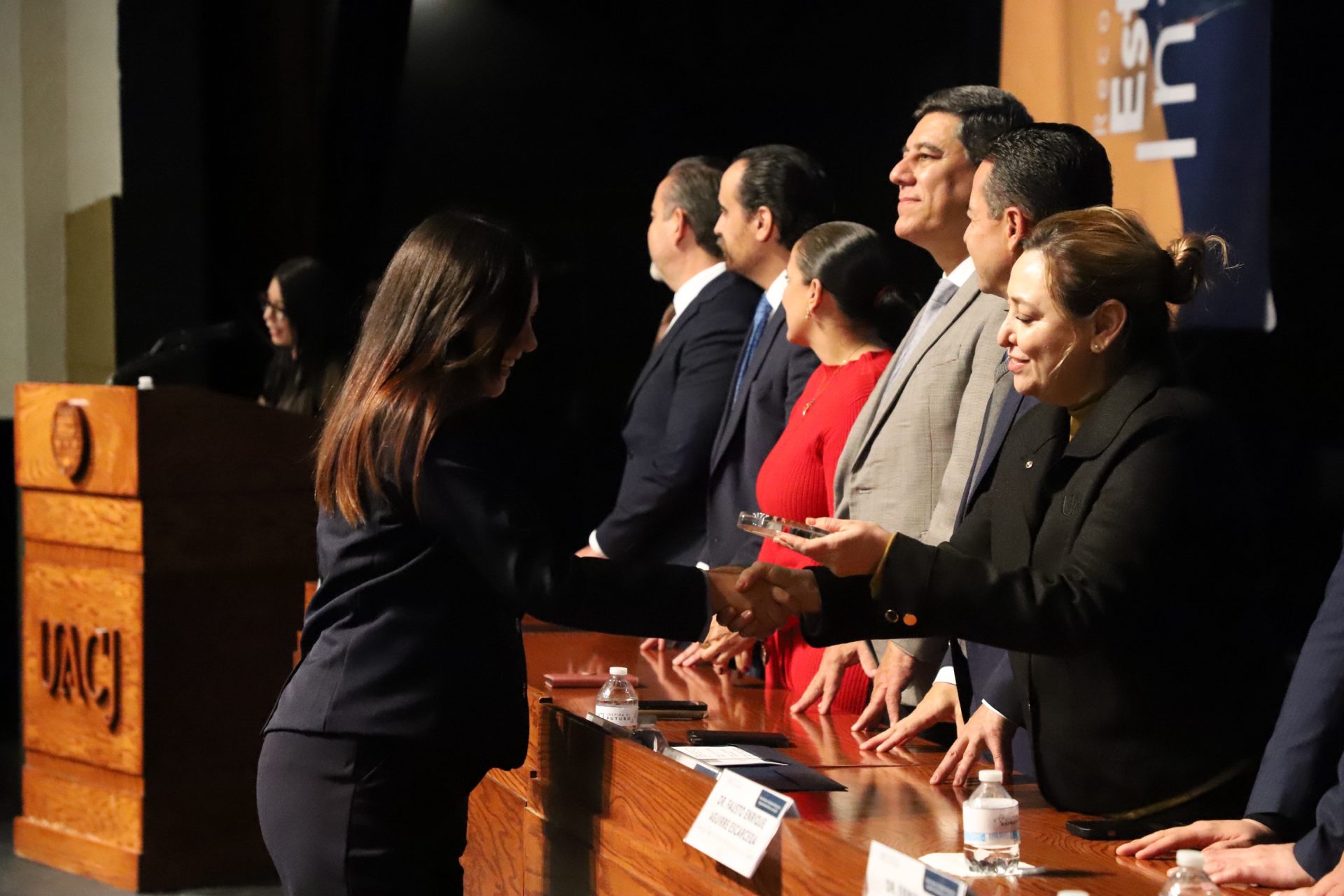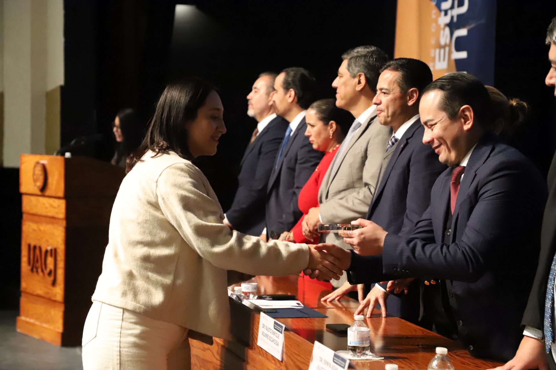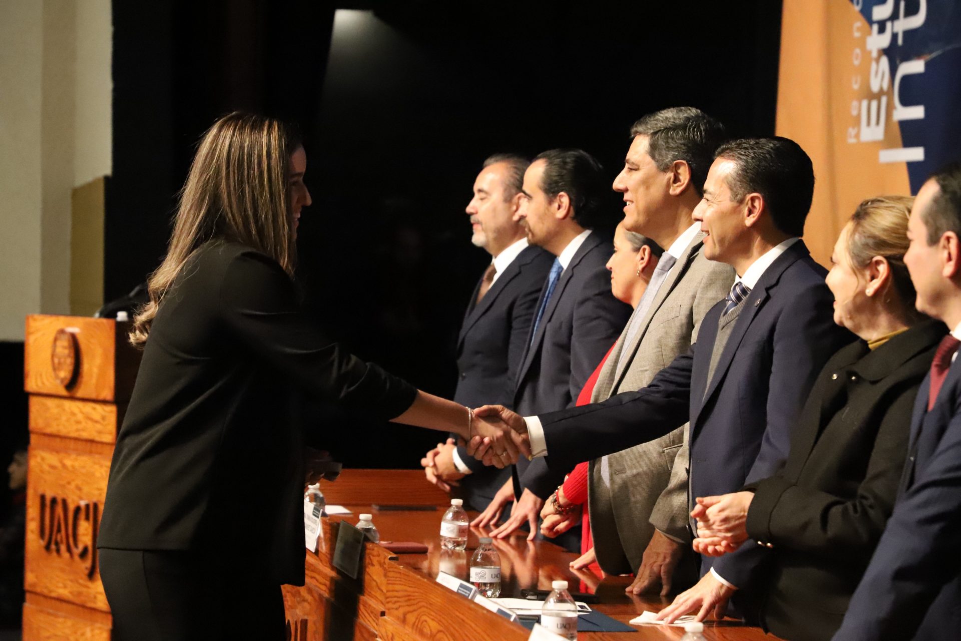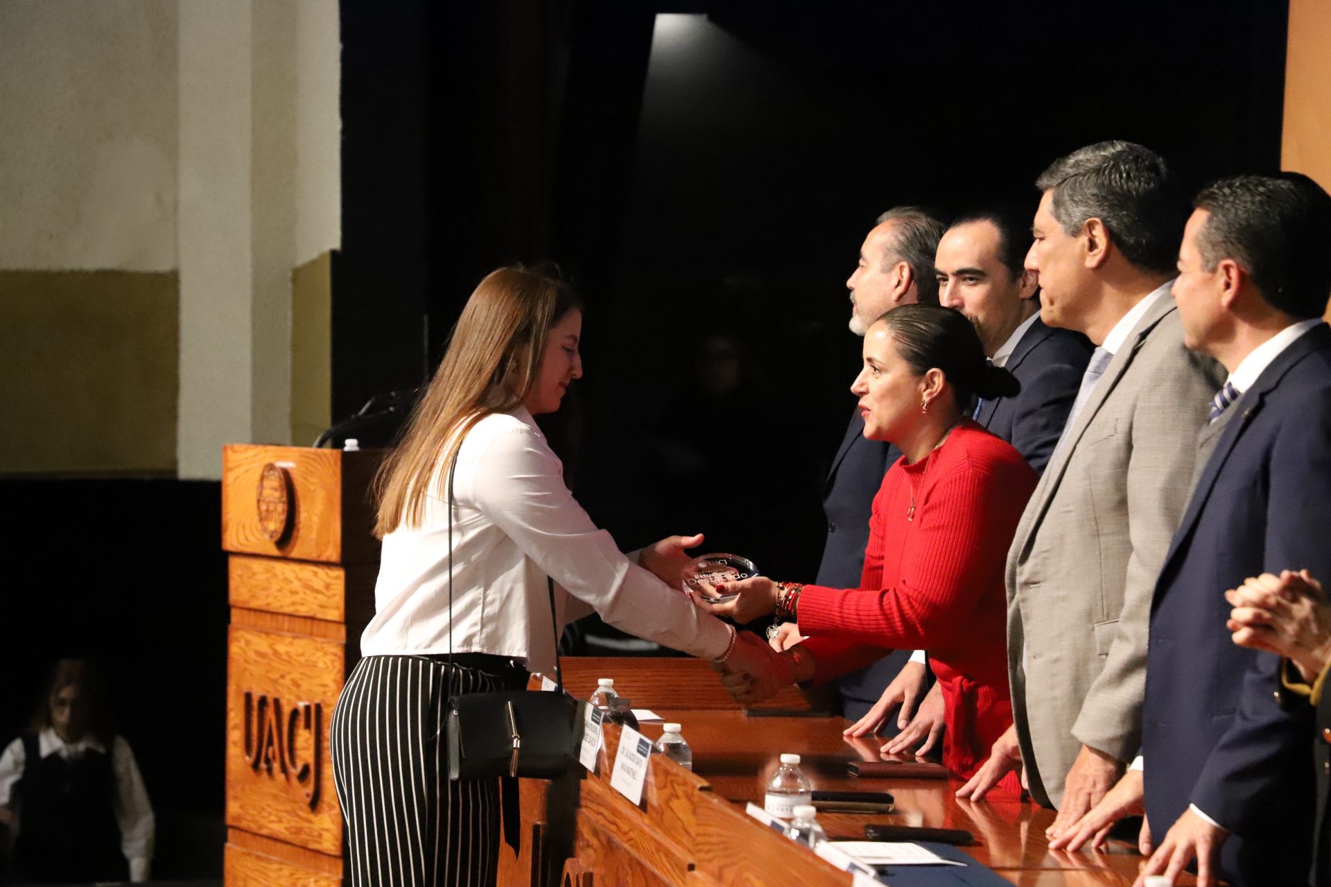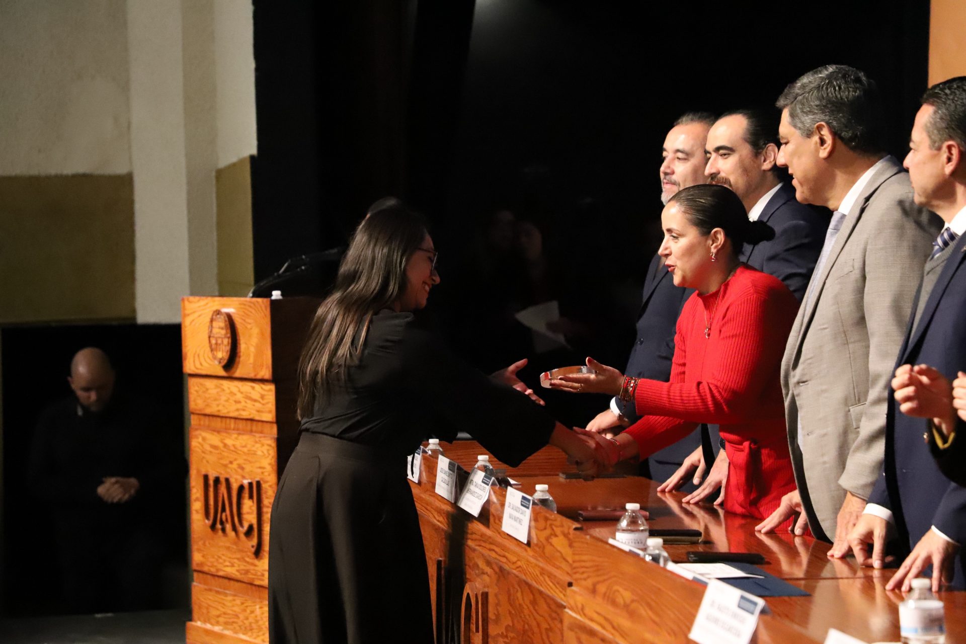 El presídium estuvo integrado por el doctor Daniel Constandse Cortez, rector de la Universidad Autónoma de Ciudad Juárez; la maestra Guadalupe Gaytán Aguirre, secretaria académica; el doctor Salvador Nava Martínez, secretario general; el doctor Pedro Enrique Yánez Camacho, director general de Bienestar Universitario; la doctora Gabriela Ortega Estrada, jefa del Campus Ciudad Universitaria; el doctor Fausto Enrique Aguirre Escárcega, director del Instituto de Arquitectura, Diseño y Arte; la maestra Tania Dolores Hernández García, directora del Instituto de Ciencias Biomédicas; el maestro José Daniel Sayto Calzadillas, jefe del Departamento de Ciencias Jurídicas, en representación del doctor Jesús Meza Vega, director del Instituto de Ciencias Sociales y Administración; el doctor Erwin Adán Martínez Gómez, director del Instituto de Ingeniería y Tecnología y el licenciado Claudio Armando Reyes Macías, subdirector de Promoción y Fomento de Bienestar.