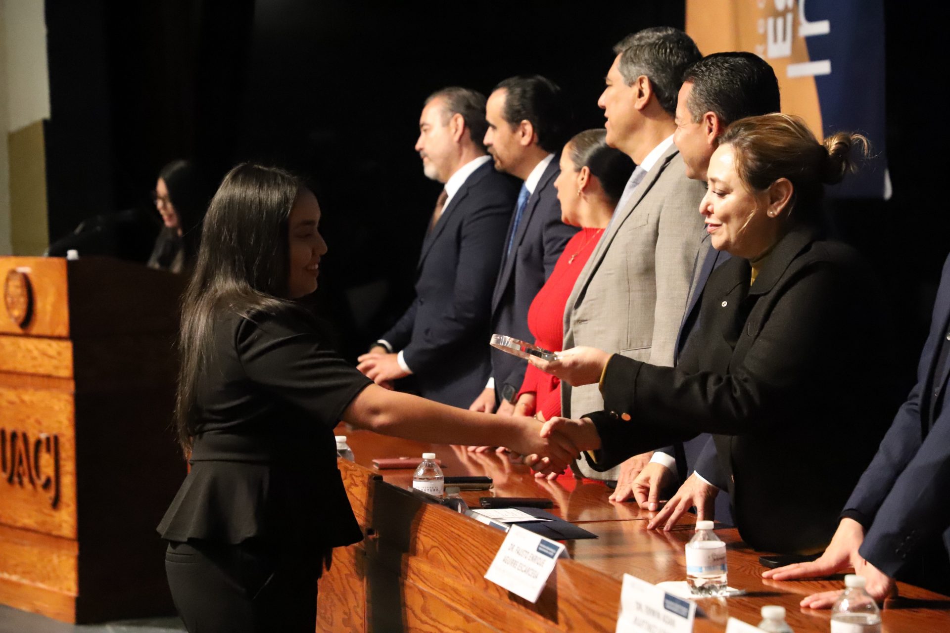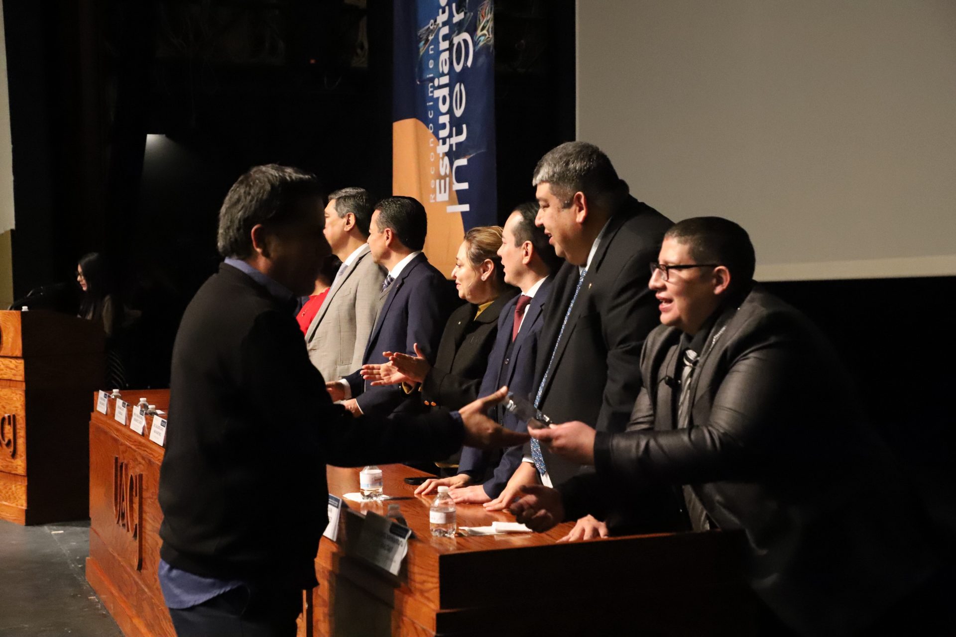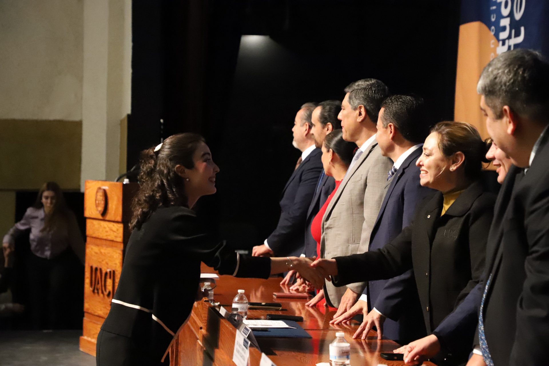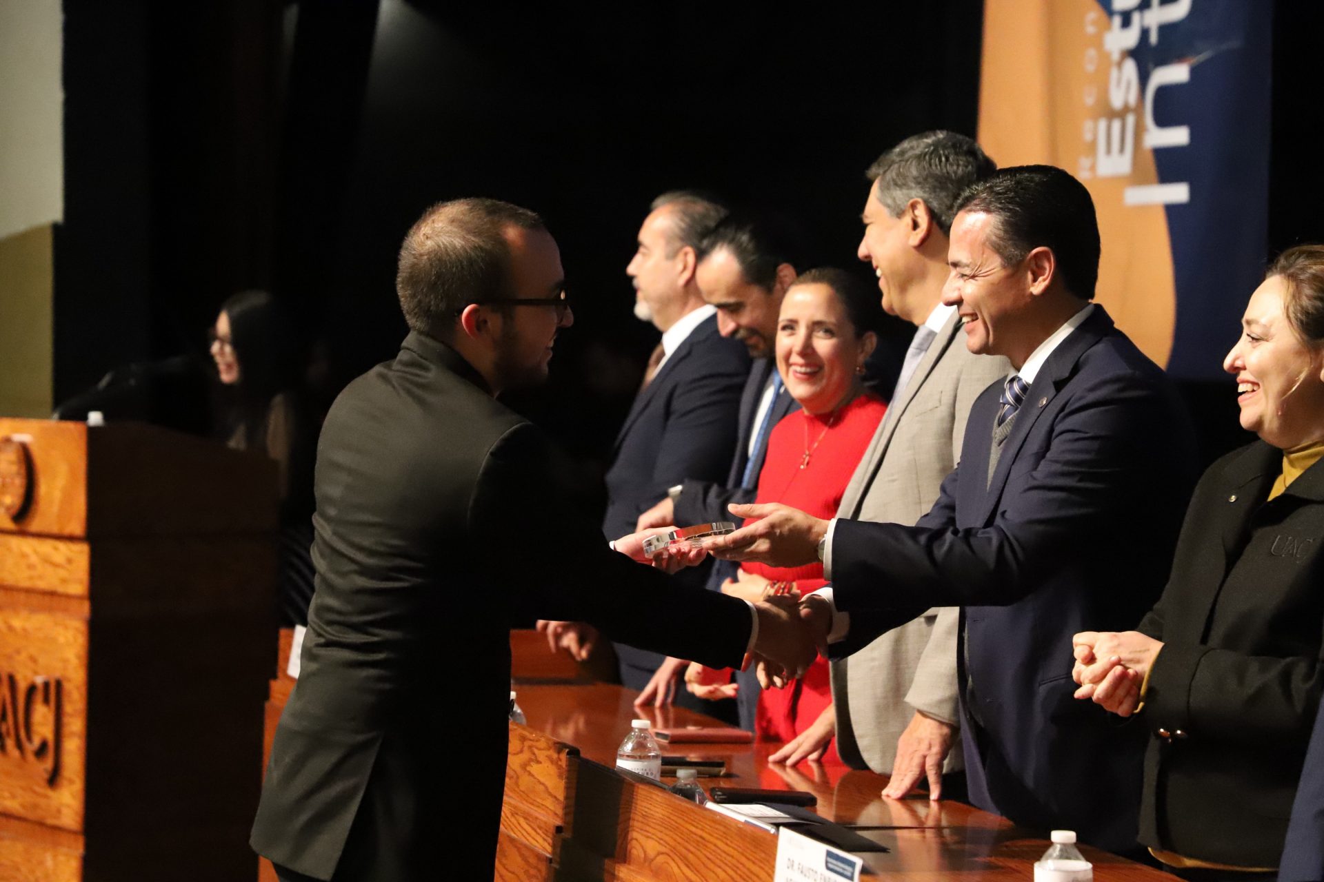 El presídium estuvo integrado por el doctor Daniel Constandse Cortez, rector de la Universidad Autónoma de Ciudad Juárez; la maestra Guadalupe Gaytán Aguirre, secretaria académica; el doctor Salvador Nava Martínez, secretario general; el doctor Pedro Enrique Yánez Camacho, director general de Bienestar Universitario; la doctora Gabriela Ortega Estrada, jefa del Campus Ciudad Universitaria; el doctor Fausto Enrique Aguirre Escárcega, director del Instituto de Arquitectura, Diseño y Arte; la maestra Tania Dolores Hernández García, directora del Instituto de Ciencias Biomédicas; el maestro José Daniel Sayto Calzadillas, jefe del Departamento de Ciencias Jurídicas, en representación del doctor Jesús Meza Vega, director del Instituto de Ciencias Sociales y Administración; el doctor Erwin Adán Martínez Gómez, director del Instituto de Ingeniería y Tecnología y el licenciado Claudio Armando Reyes Macías, subdirector de Promoción y Fomento de Bienestar.