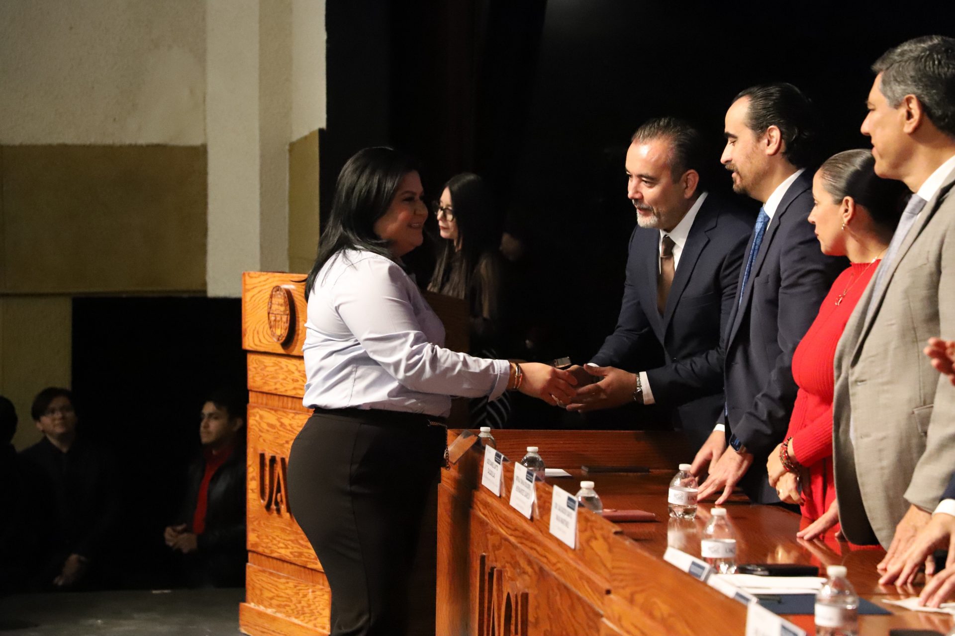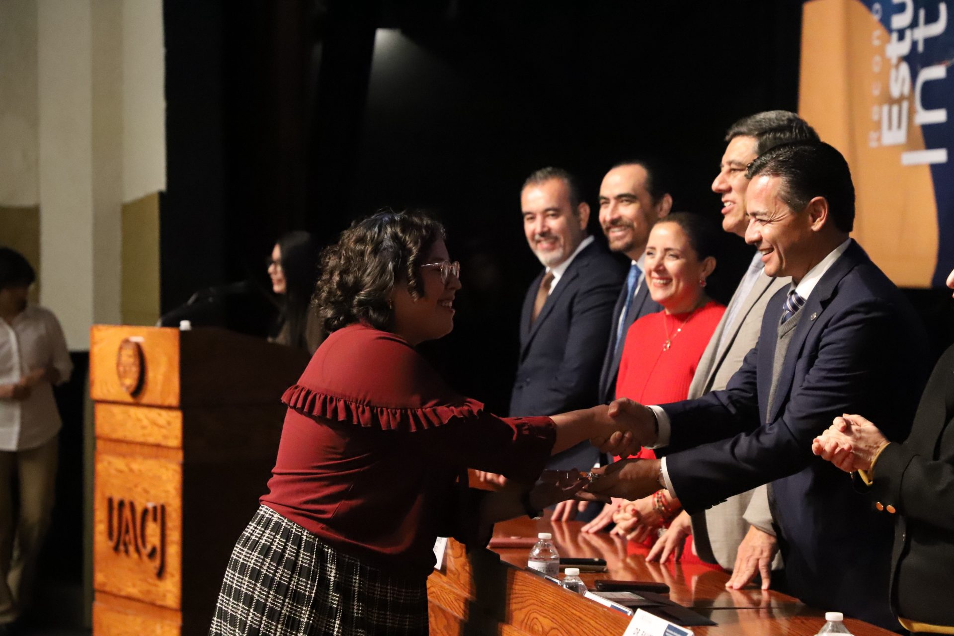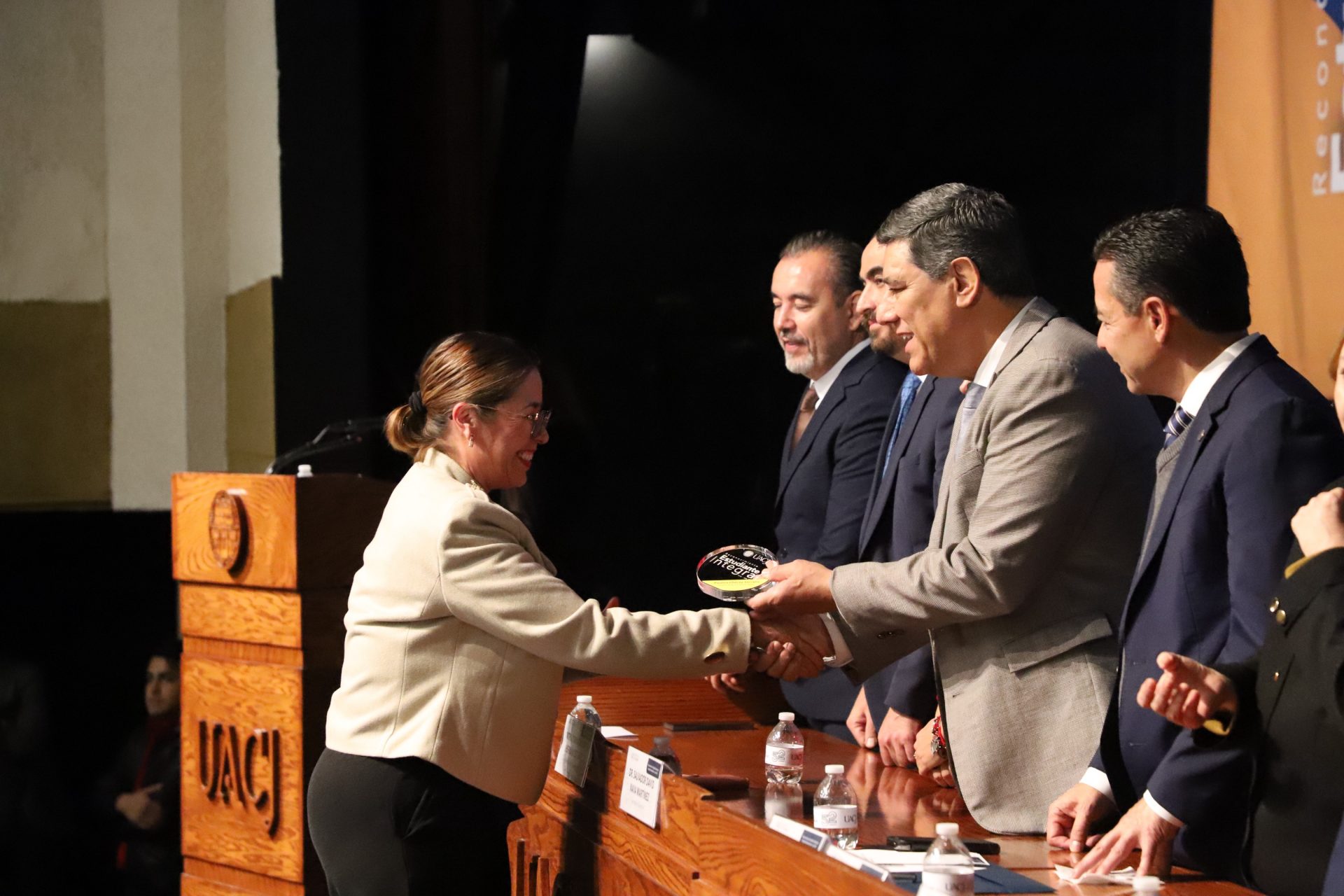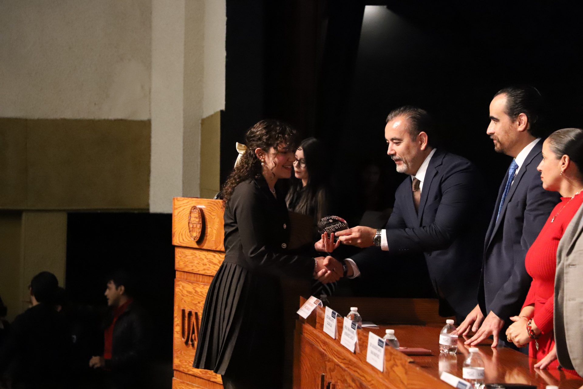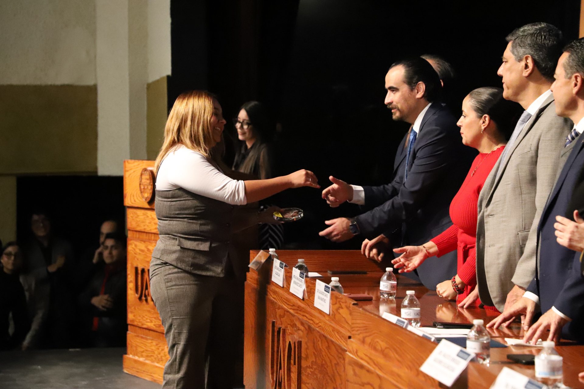 El presídium estuvo integrado por el doctor Daniel Constandse Cortez, rector de la Universidad Autónoma de Ciudad Juárez; la maestra Guadalupe Gaytán Aguirre, secretaria académica; el doctor Salvador Nava Martínez, secretario general; el doctor Pedro Enrique Yánez Camacho, director general de Bienestar Universitario; la doctora Gabriela Ortega Estrada, jefa del Campus Ciudad Universitaria; el doctor Fausto Enrique Aguirre Escárcega, director del Instituto de Arquitectura, Diseño y Arte; la maestra Tania Dolores Hernández García, directora del Instituto de Ciencias Biomédicas; el maestro José Daniel Sayto Calzadillas, jefe del Departamento de Ciencias Jurídicas, en representación del doctor Jesús Meza Vega, director del Instituto de Ciencias Sociales y Administración; el doctor Erwin Adán Martínez Gómez, director del Instituto de Ingeniería y Tecnología y el licenciado Claudio Armando Reyes Macías, subdirector de Promoción y Fomento de Bienestar.