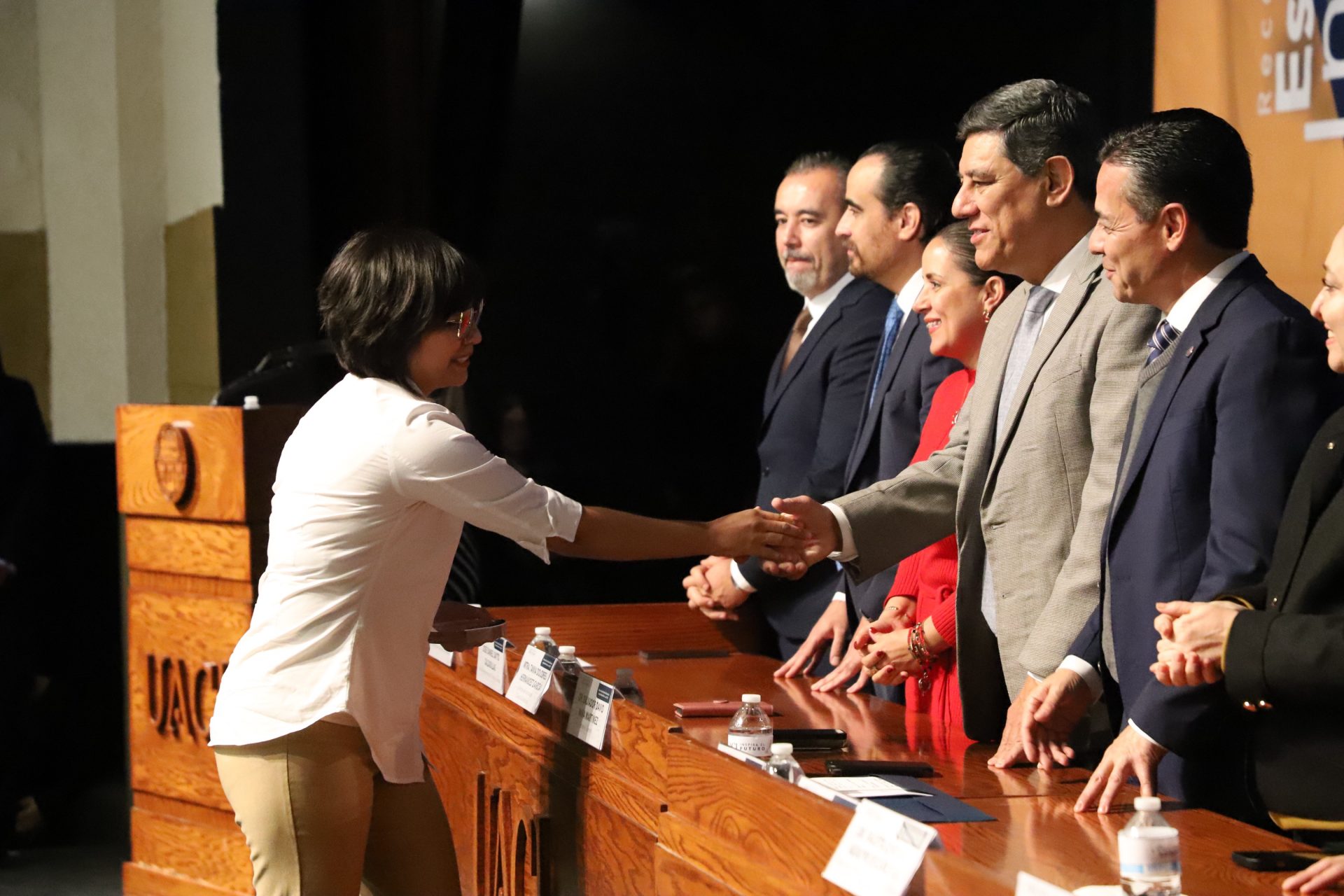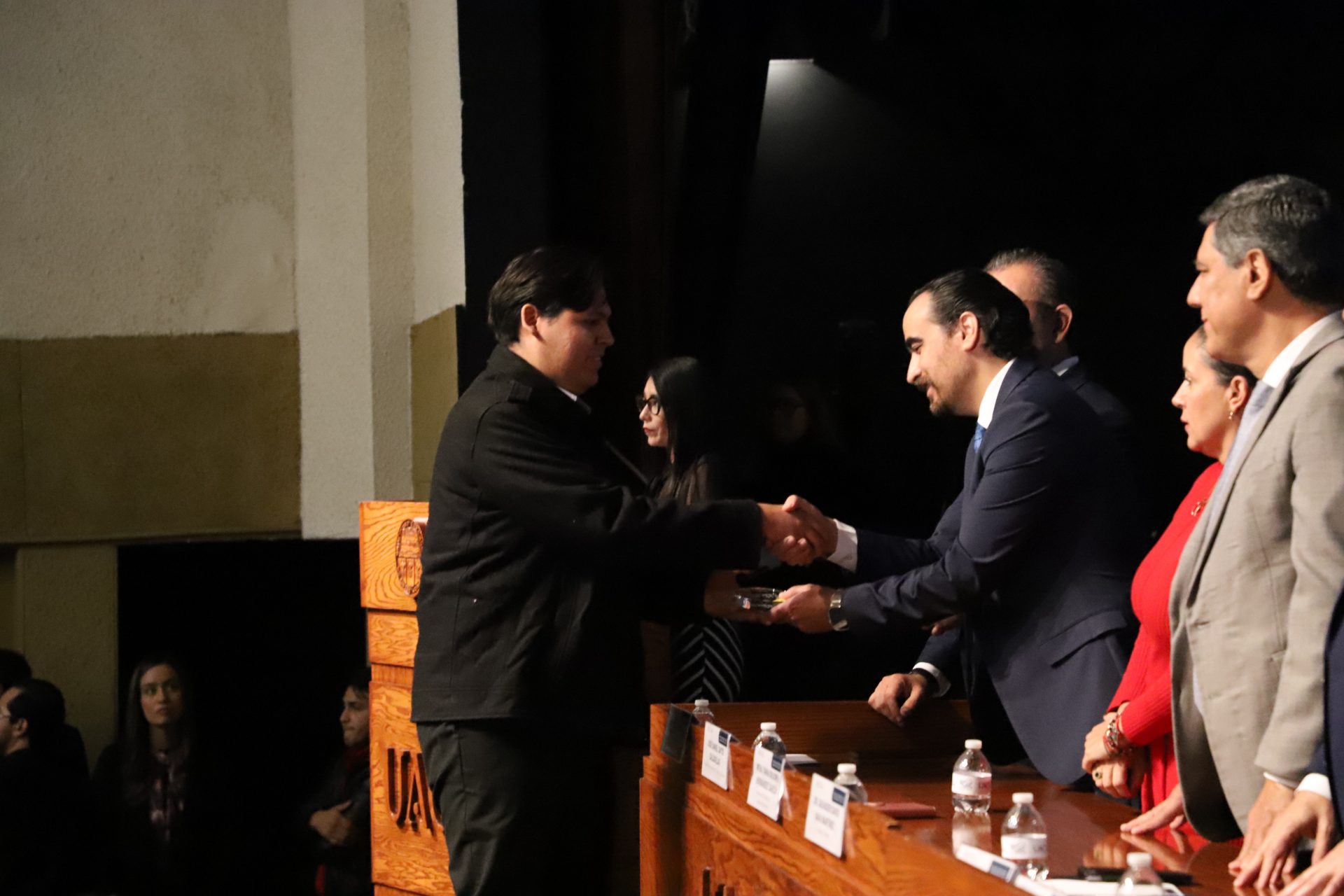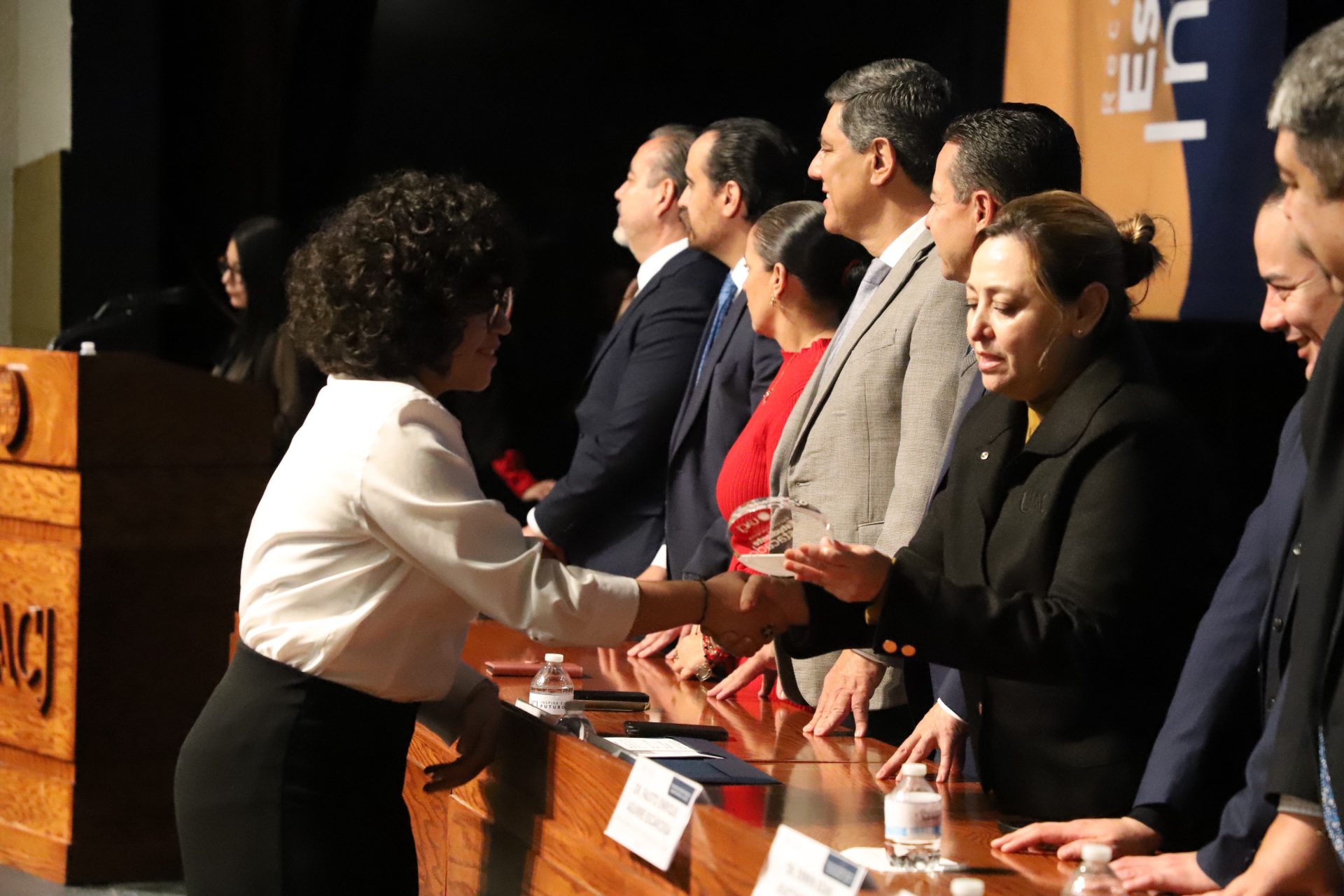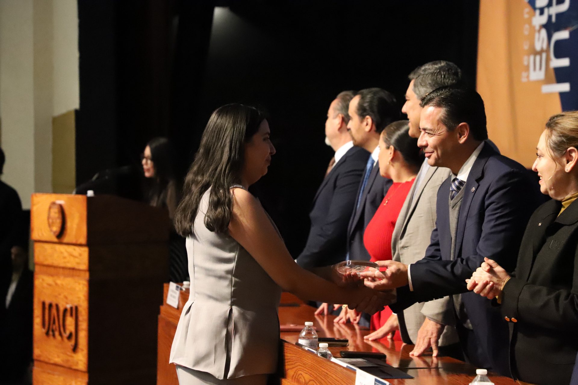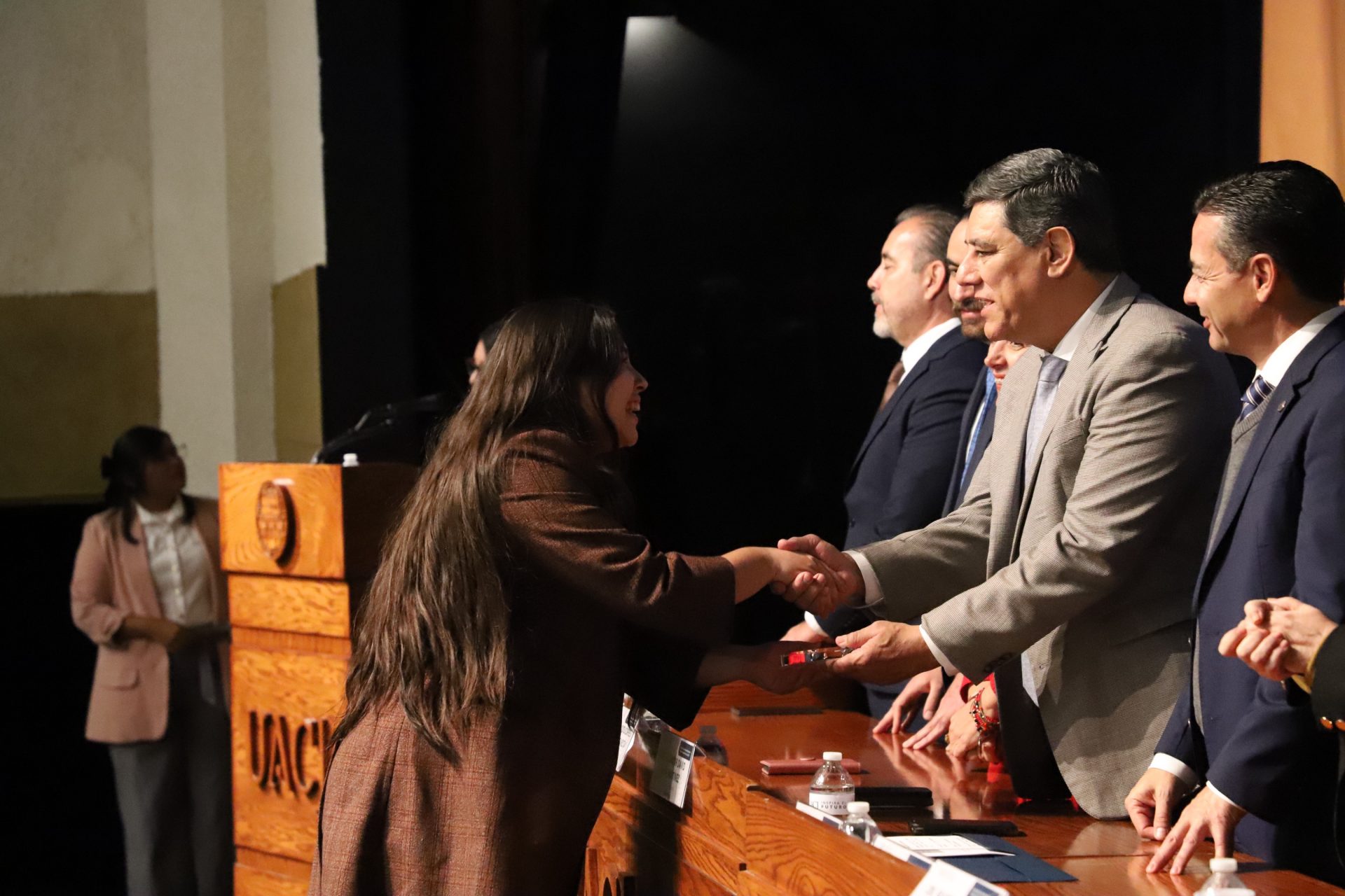 El presídium estuvo integrado por el doctor Daniel Constandse Cortez, rector de la Universidad Autónoma de Ciudad Juárez; la maestra Guadalupe Gaytán Aguirre, secretaria académica; el doctor Salvador Nava Martínez, secretario general; el doctor Pedro Enrique Yánez Camacho, director general de Bienestar Universitario; la doctora Gabriela Ortega Estrada, jefa del Campus Ciudad Universitaria; el doctor Fausto Enrique Aguirre Escárcega, director del Instituto de Arquitectura, Diseño y Arte; la maestra Tania Dolores Hernández García, directora del Instituto de Ciencias Biomédicas; el maestro José Daniel Sayto Calzadillas, jefe del Departamento de Ciencias Jurídicas, en representación del doctor Jesús Meza Vega, director del Instituto de Ciencias Sociales y Administración; el doctor Erwin Adán Martínez Gómez, director del Instituto de Ingeniería y Tecnología y el licenciado Claudio Armando Reyes Macías, subdirector de Promoción y Fomento de Bienestar.