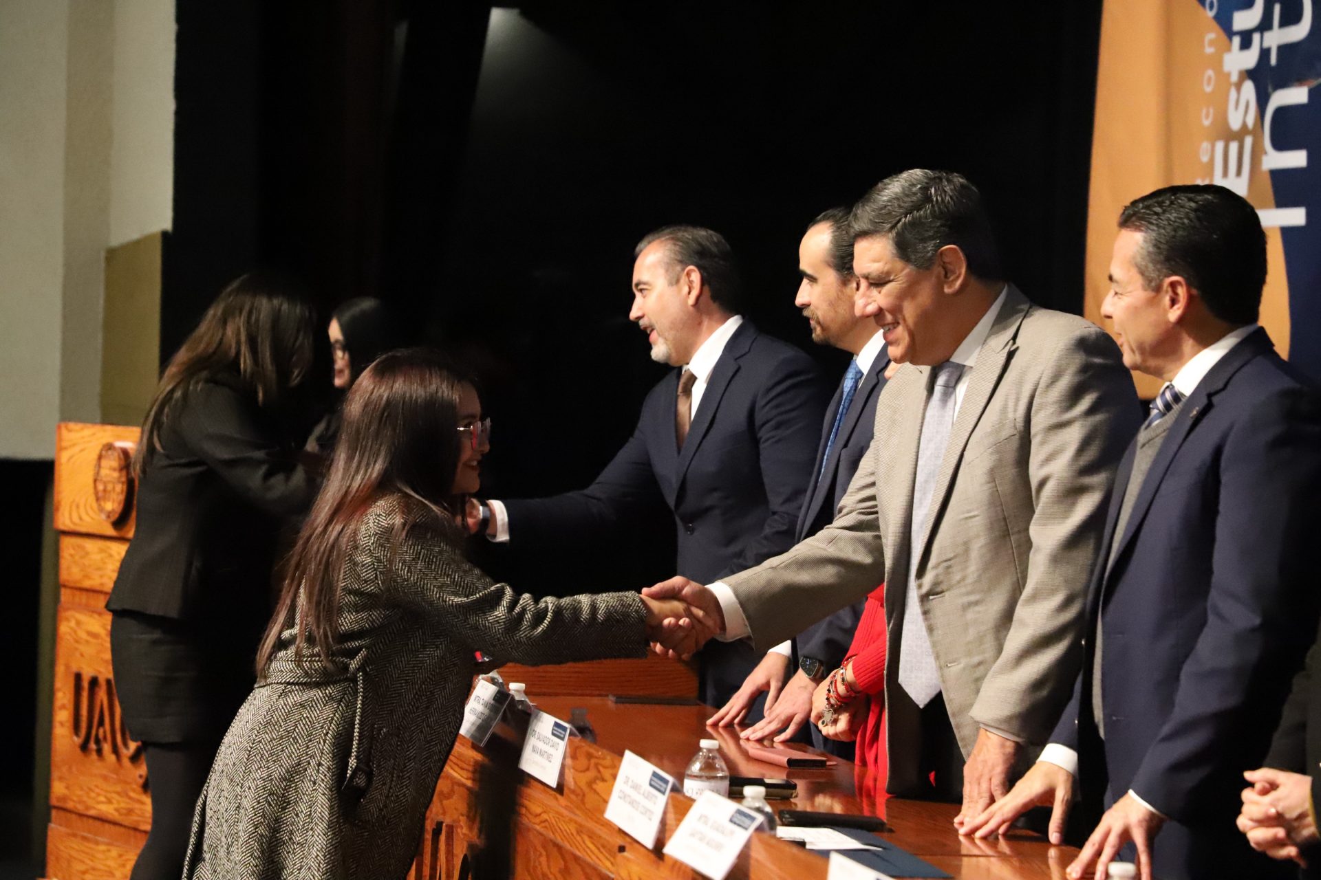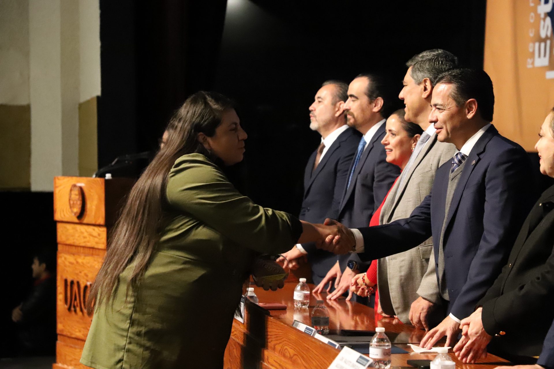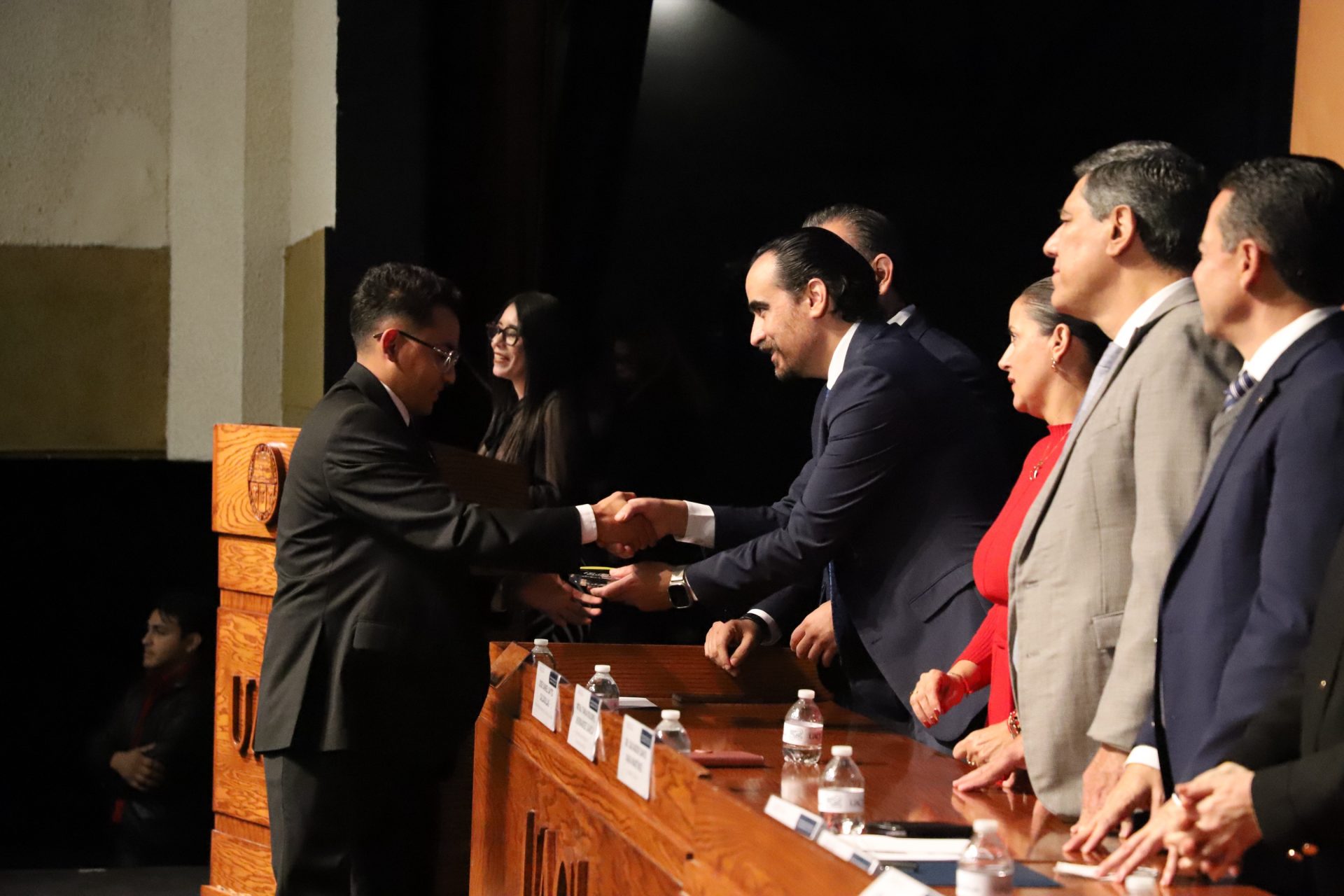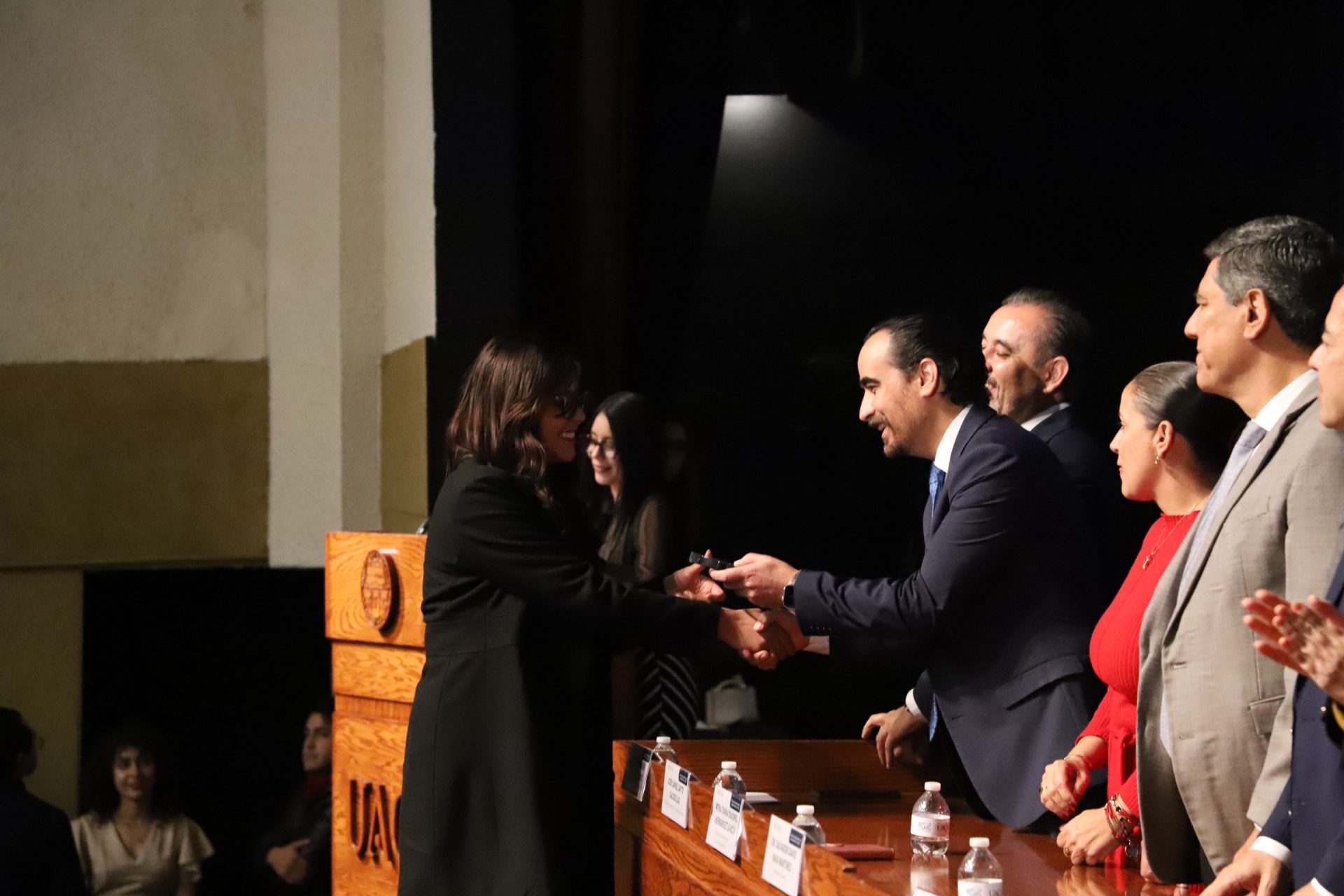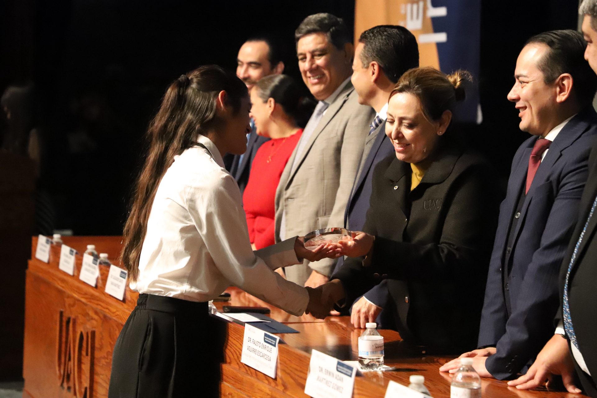 El presídium estuvo integrado por el doctor Daniel Constandse Cortez, rector de la Universidad Autónoma de Ciudad Juárez; la maestra Guadalupe Gaytán Aguirre, secretaria académica; el doctor Salvador Nava Martínez, secretario general; el doctor Pedro Enrique Yánez Camacho, director general de Bienestar Universitario; la doctora Gabriela Ortega Estrada, jefa del Campus Ciudad Universitaria; el doctor Fausto Enrique Aguirre Escárcega, director del Instituto de Arquitectura, Diseño y Arte; la maestra Tania Dolores Hernández García, directora del Instituto de Ciencias Biomédicas; el maestro José Daniel Sayto Calzadillas, jefe del Departamento de Ciencias Jurídicas, en representación del doctor Jesús Meza Vega, director del Instituto de Ciencias Sociales y Administración; el doctor Erwin Adán Martínez Gómez, director del Instituto de Ingeniería y Tecnología y el licenciado Claudio Armando Reyes Macías, subdirector de Promoción y Fomento de Bienestar.