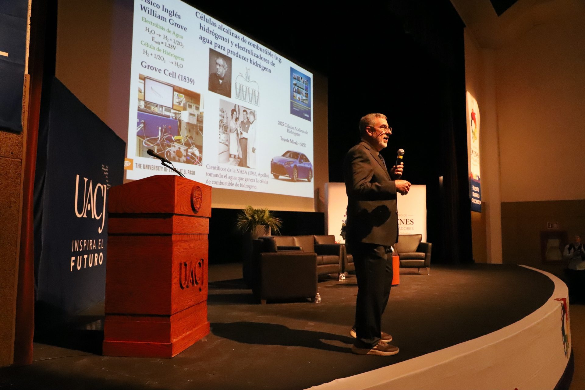 Destacó que este encuentro permite la colaboración científica entre UTEP y Chihuahua, lo que enriquece el conocimiento de los alumnos e invitados. Durante la ponencia abordó el funcionamiento celular de hidrógeno, energía con hidrógeno aplicadas en automóviles e investigaciones relacionadas.