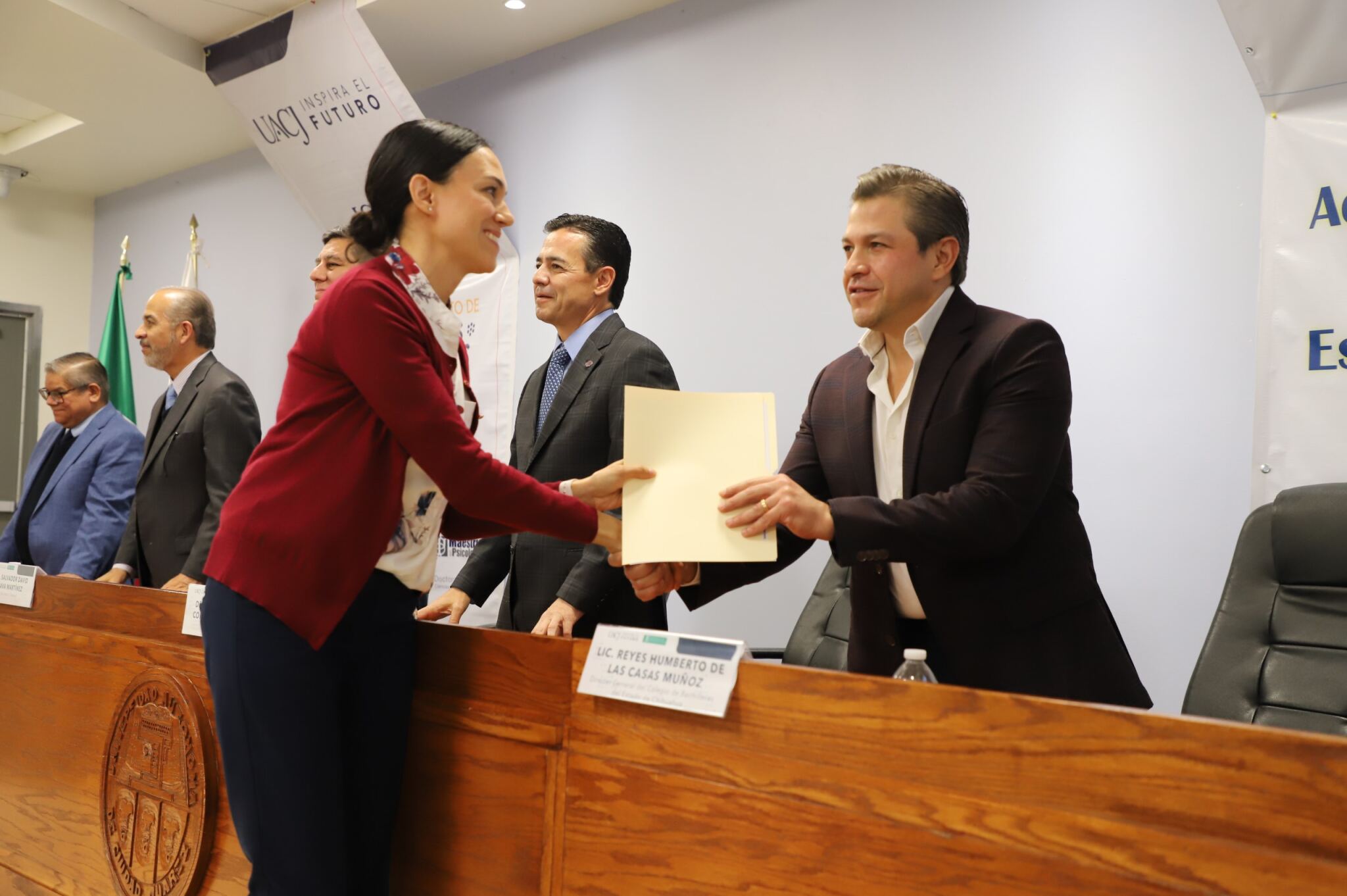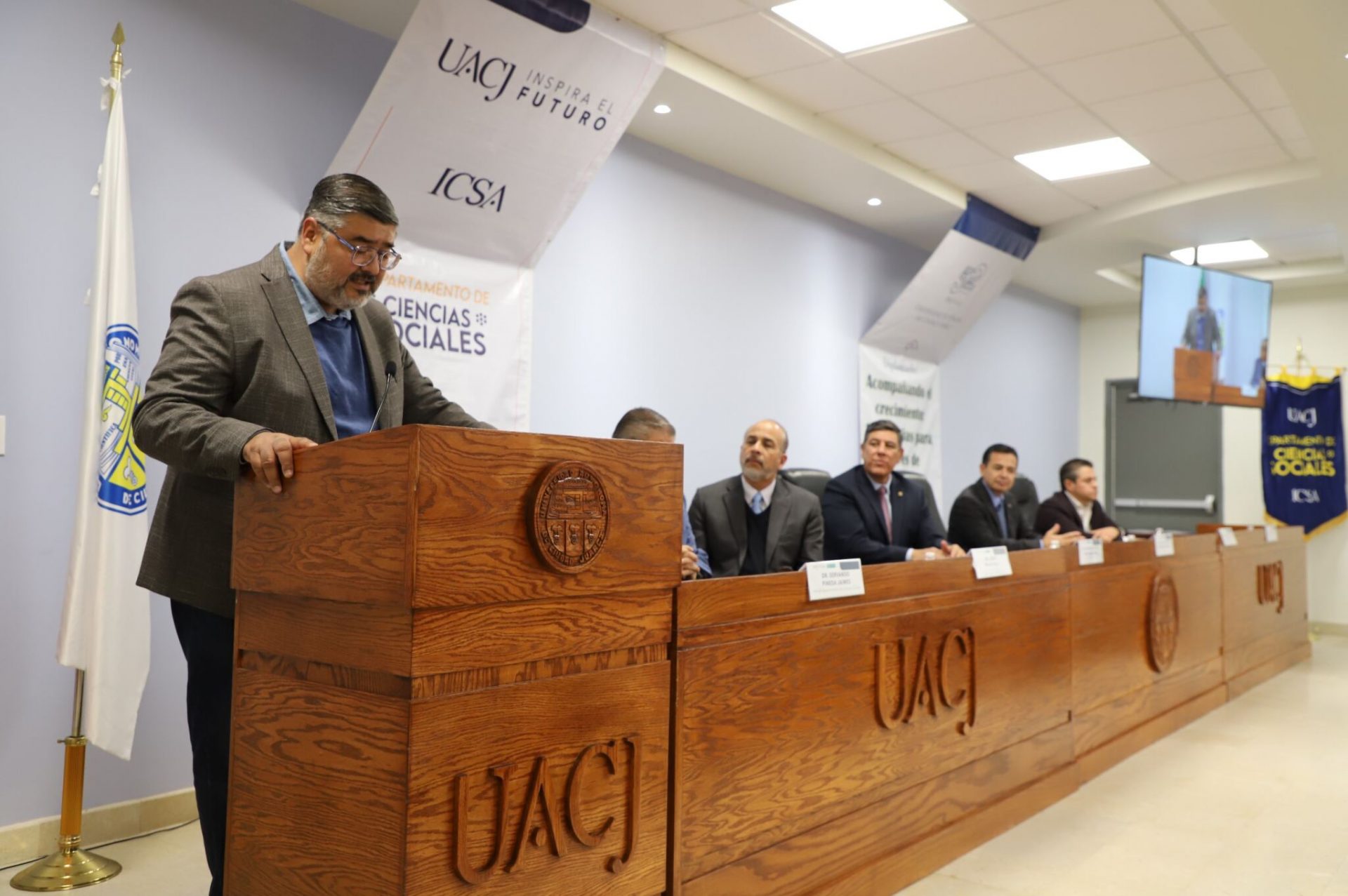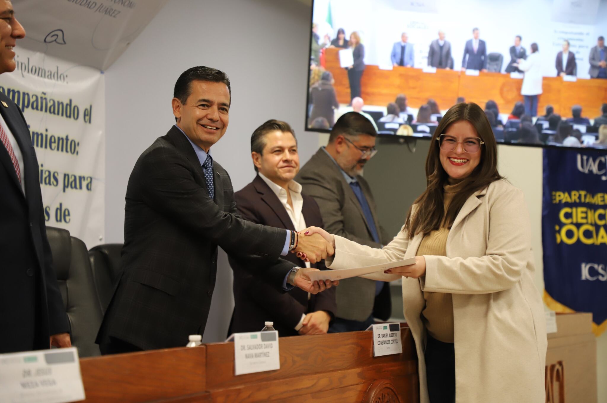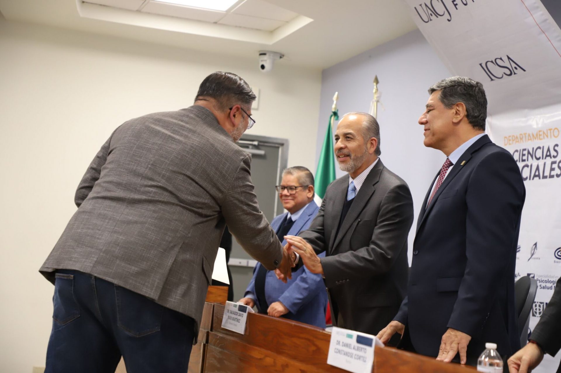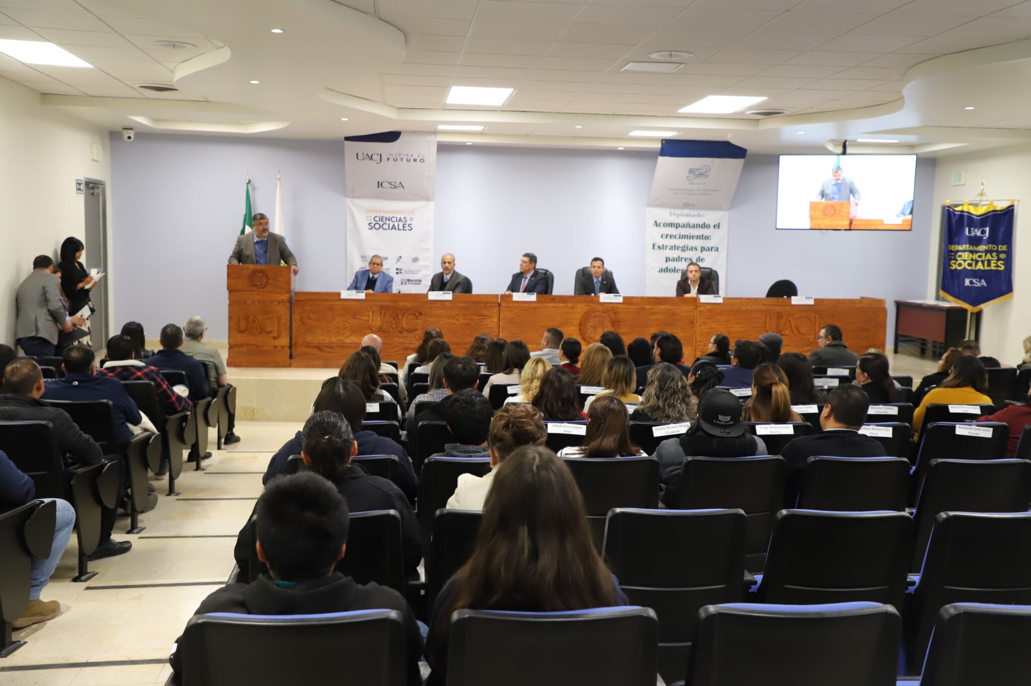 Al evento asistieron como invitados especiales las y los directores de los Planteles 5, 6, 7, 9, 11, 16 y 19 del Colegio de Bachilleres, así como autoridades universitarias convocadas: el Dr. Óscar Armando Esparza del Villar, Coordinador del Programa de Psicología; Mtro. Reyes Humberto de las Casas Muñoz, Director General del Cobach; Dr. Servando Pineda Jaimes, Jefe del Departamento de Ciencias Sociales; Lic. Laura Olivia Robledo Vega, Coordinadora Zona Norte de COBACh; Dr. Jesús Meza Vega, Director del ICSA; Dr. Salvador David Nava Martínez, Secretario General y el Dr. Daniel Alberto Constandse Cortez, Rector de la UACJ.