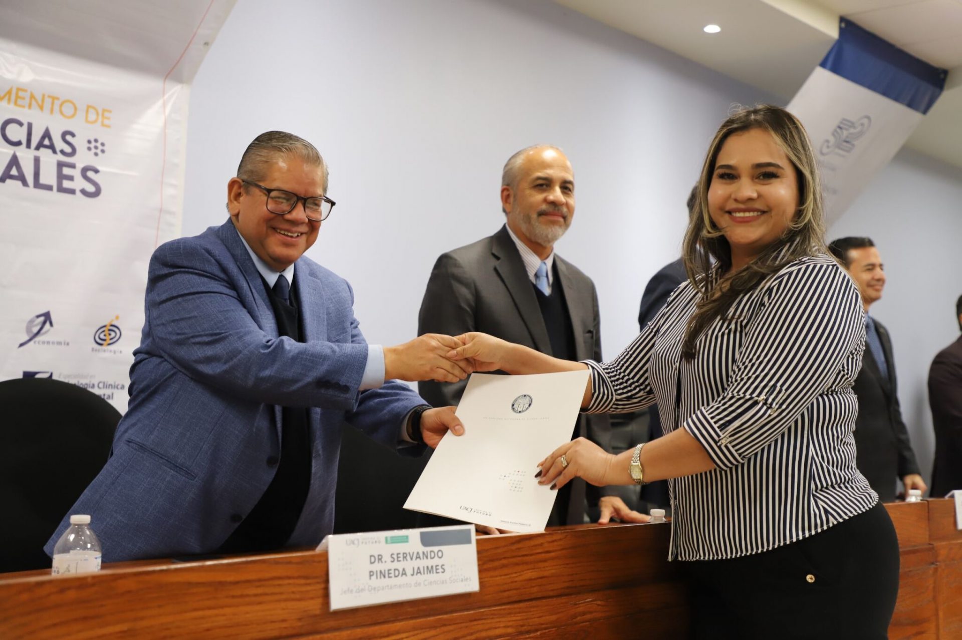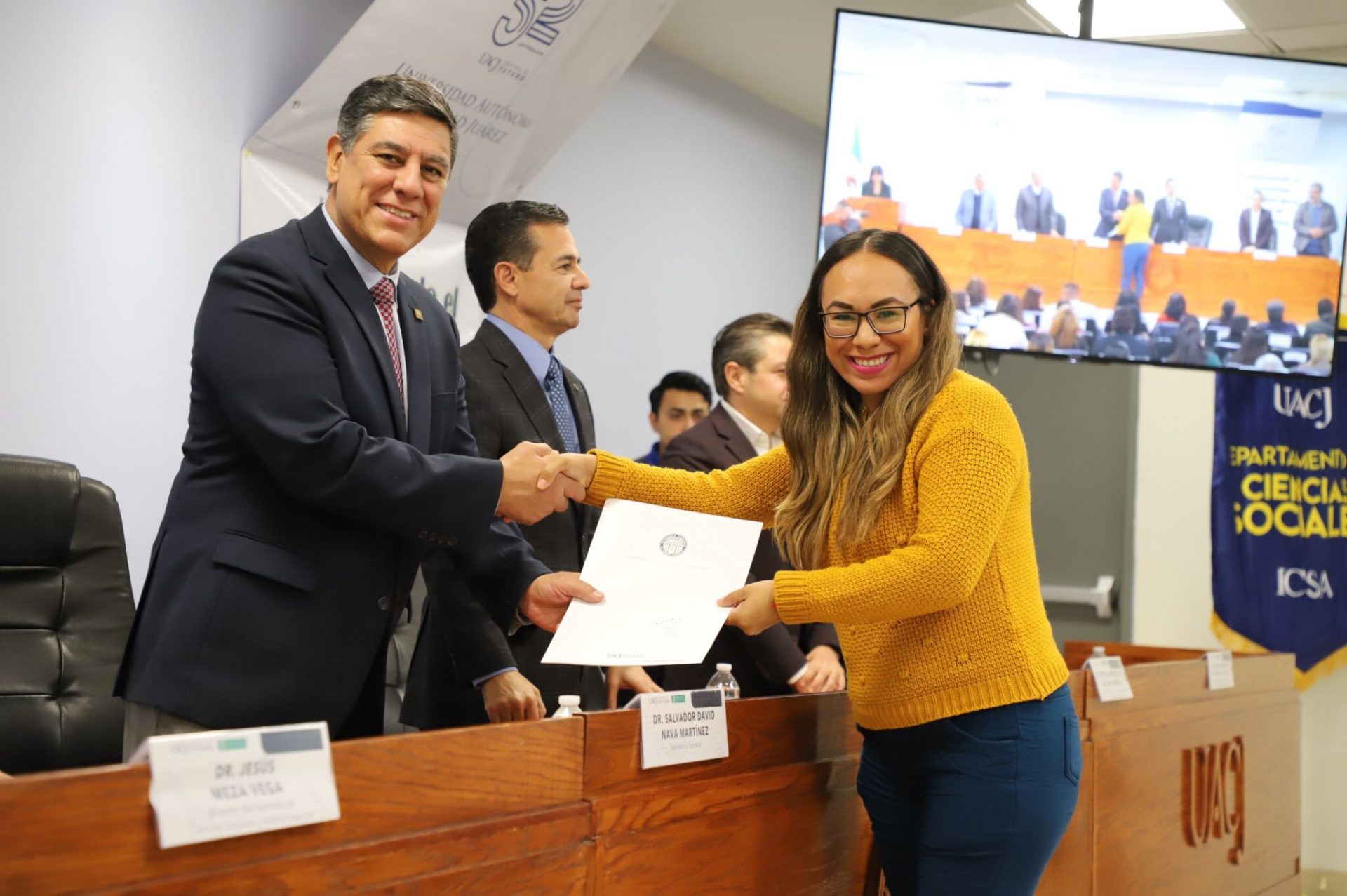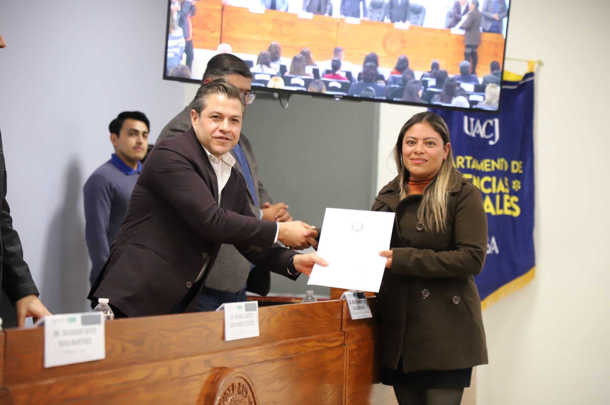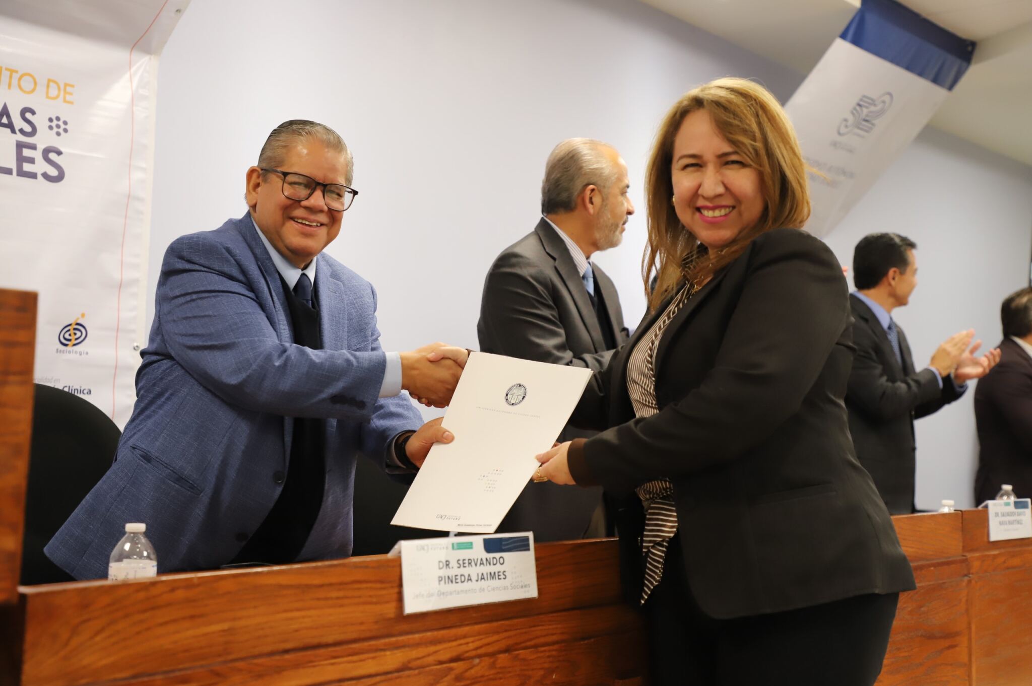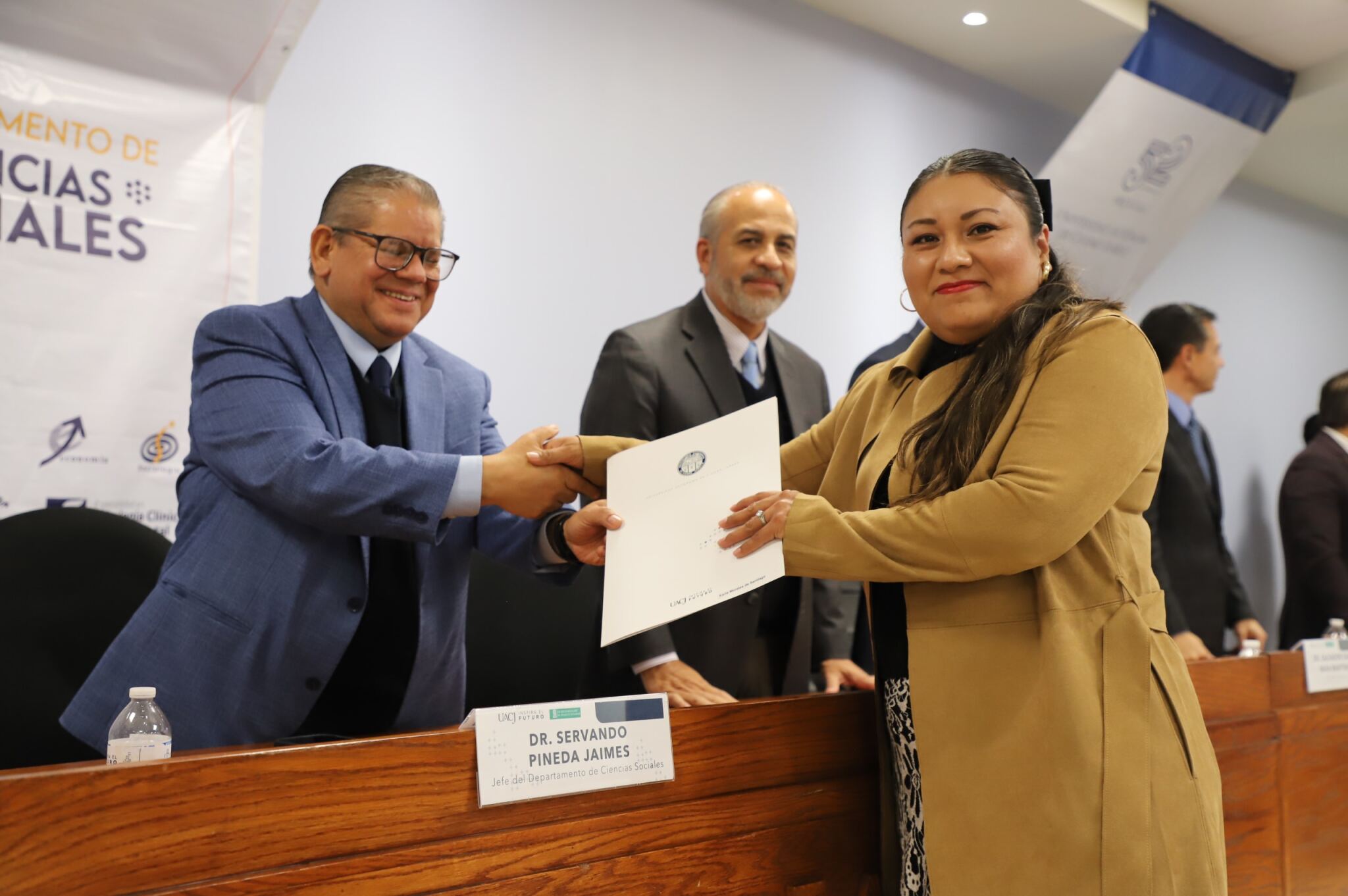Al evento asistieron como invitados especiales las y los directores de los Planteles 5, 6, 7, 9, 11, 16 y 19 del Colegio de Bachilleres, así como autoridades universitarias convocadas: el Dr. Óscar Armando Esparza del Villar, Coordinador del Programa de Psicología; Mtro. Reyes Humberto de las Casas Muñoz, Director General del Cobach; Dr. Servando Pineda Jaimes, Jefe del Departamento de Ciencias Sociales; Lic. Laura Olivia Robledo Vega, Coordinadora Zona Norte de COBACh; Dr. Jesús Meza Vega, Director del ICSA; Dr. Salvador David Nava Martínez, Secretario General y el Dr. Daniel Alberto Constandse Cortez, Rector de la UACJ.