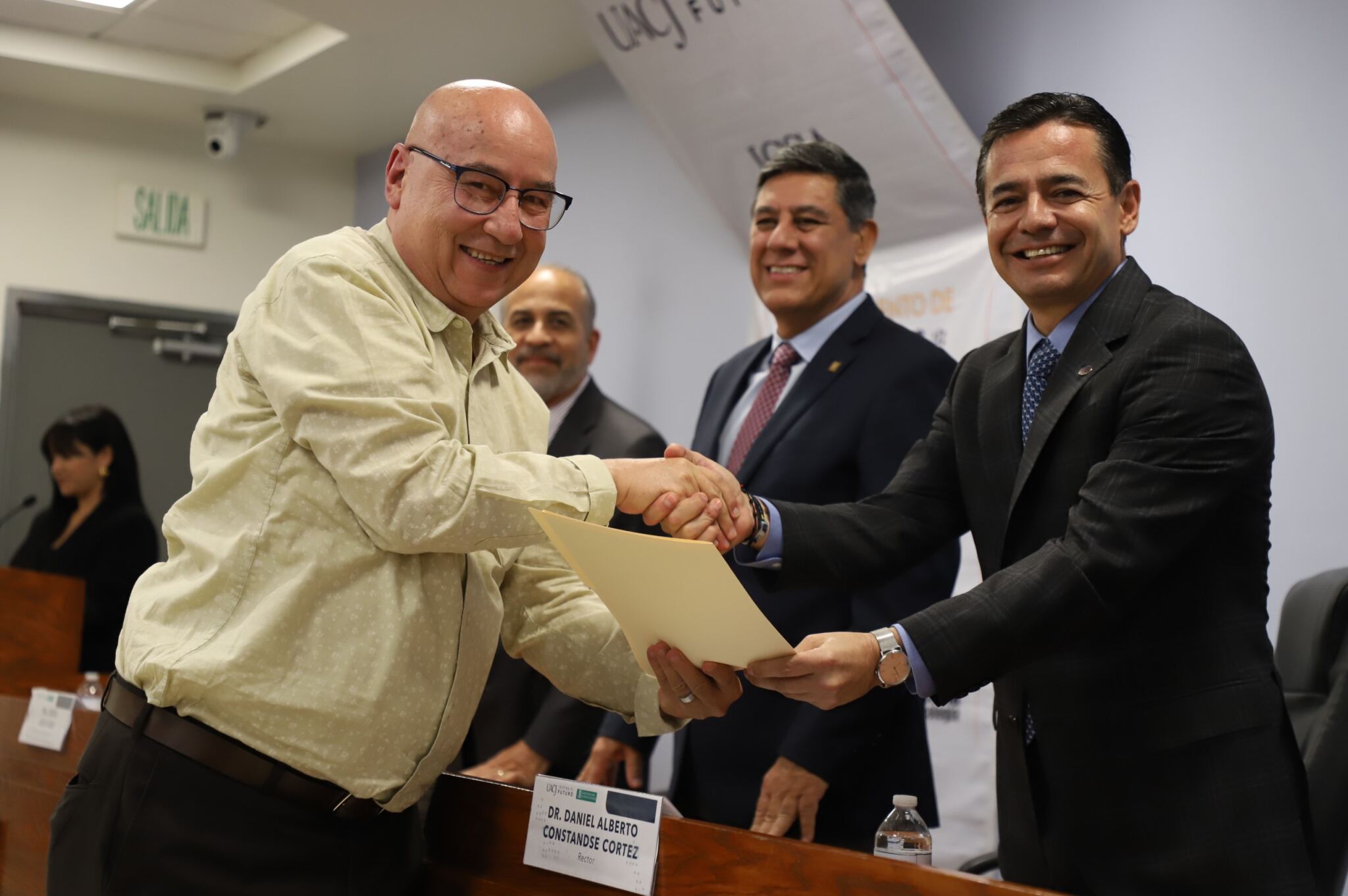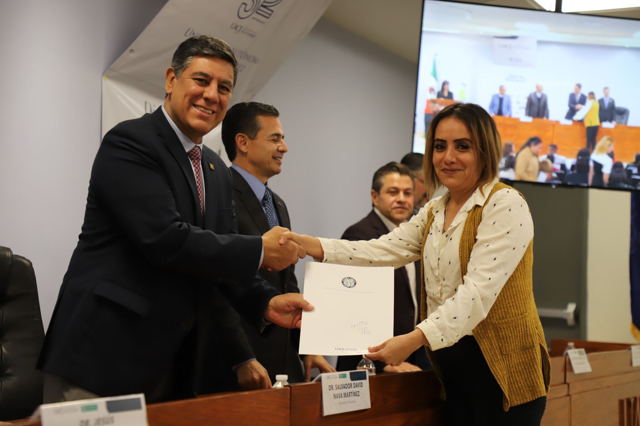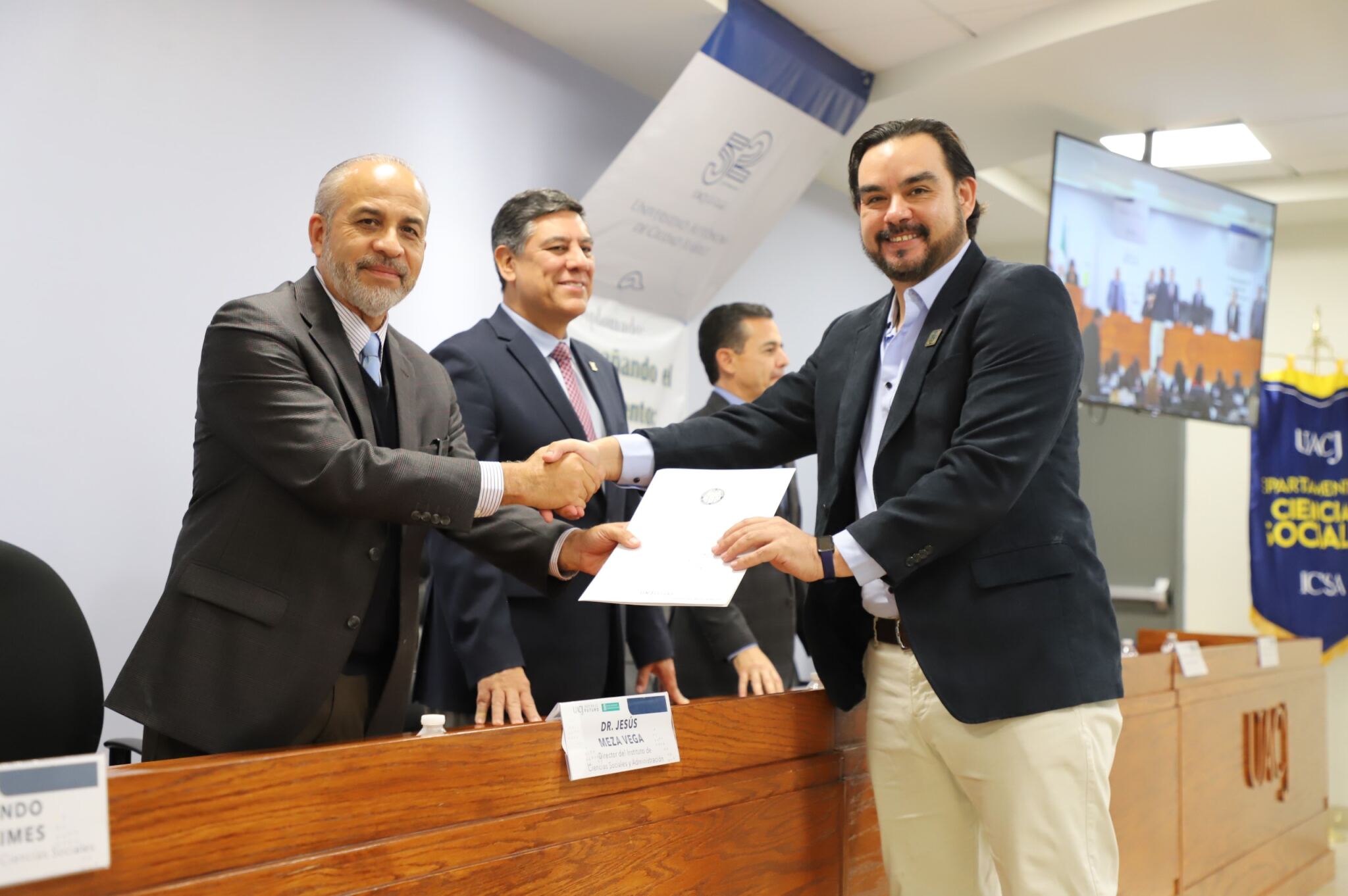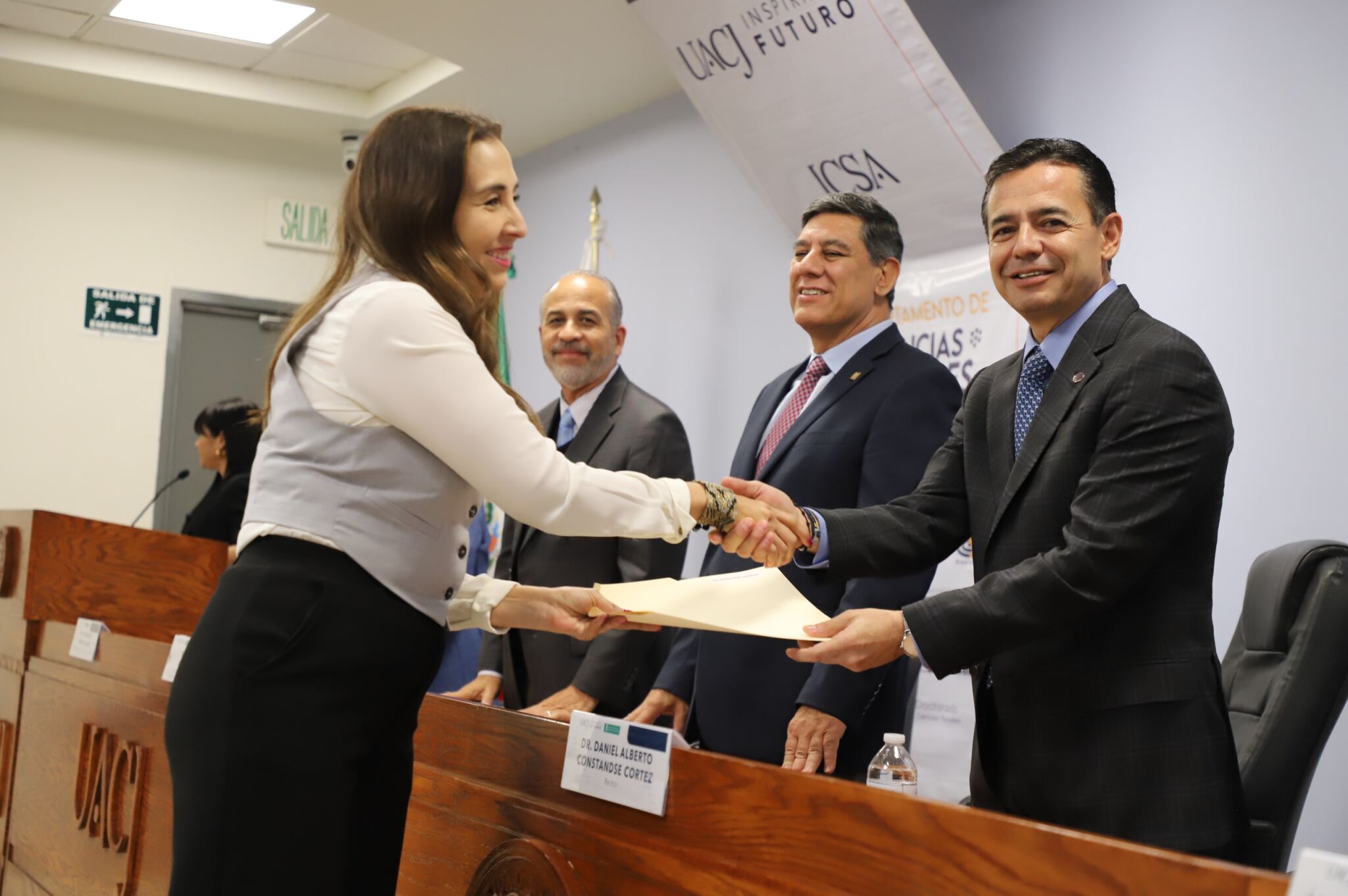 Al evento asistieron como invitados especiales las y los directores de los Planteles 5, 6, 7, 9, 11, 16 y 19 del Colegio de Bachilleres, así como autoridades universitarias convocadas: el Dr. Óscar Armando Esparza del Villar, Coordinador del Programa de Psicología; Mtro. Reyes Humberto de las Casas Muñoz, Director General del Cobach; Dr. Servando Pineda Jaimes, Jefe del Departamento de Ciencias Sociales; Lic. Laura Olivia Robledo Vega, Coordinadora Zona Norte de COBACh; Dr. Jesús Meza Vega, Director del ICSA; Dr. Salvador David Nava Martínez, Secretario General y el Dr. Daniel Alberto Constandse Cortez, Rector de la UACJ.