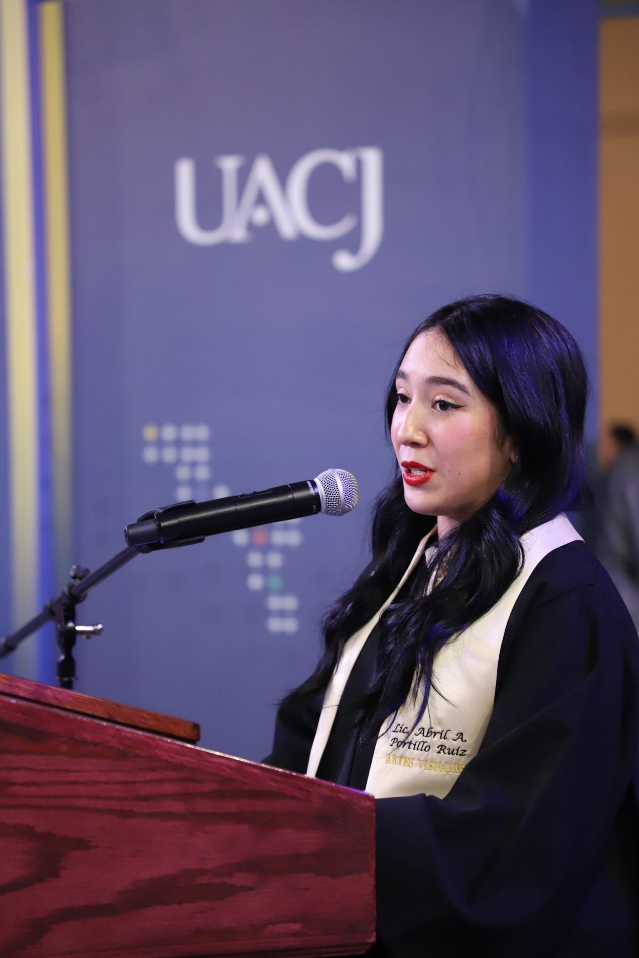 La emoción también se reflejó en la voz de Abril Angélica Portillo Ruiz, egresada de Artes Visuales, quien habló en nombre de sus compañeros: