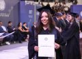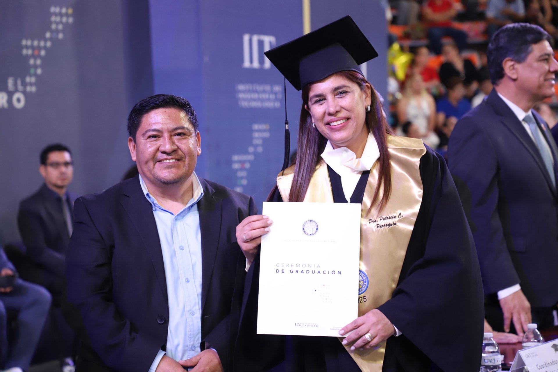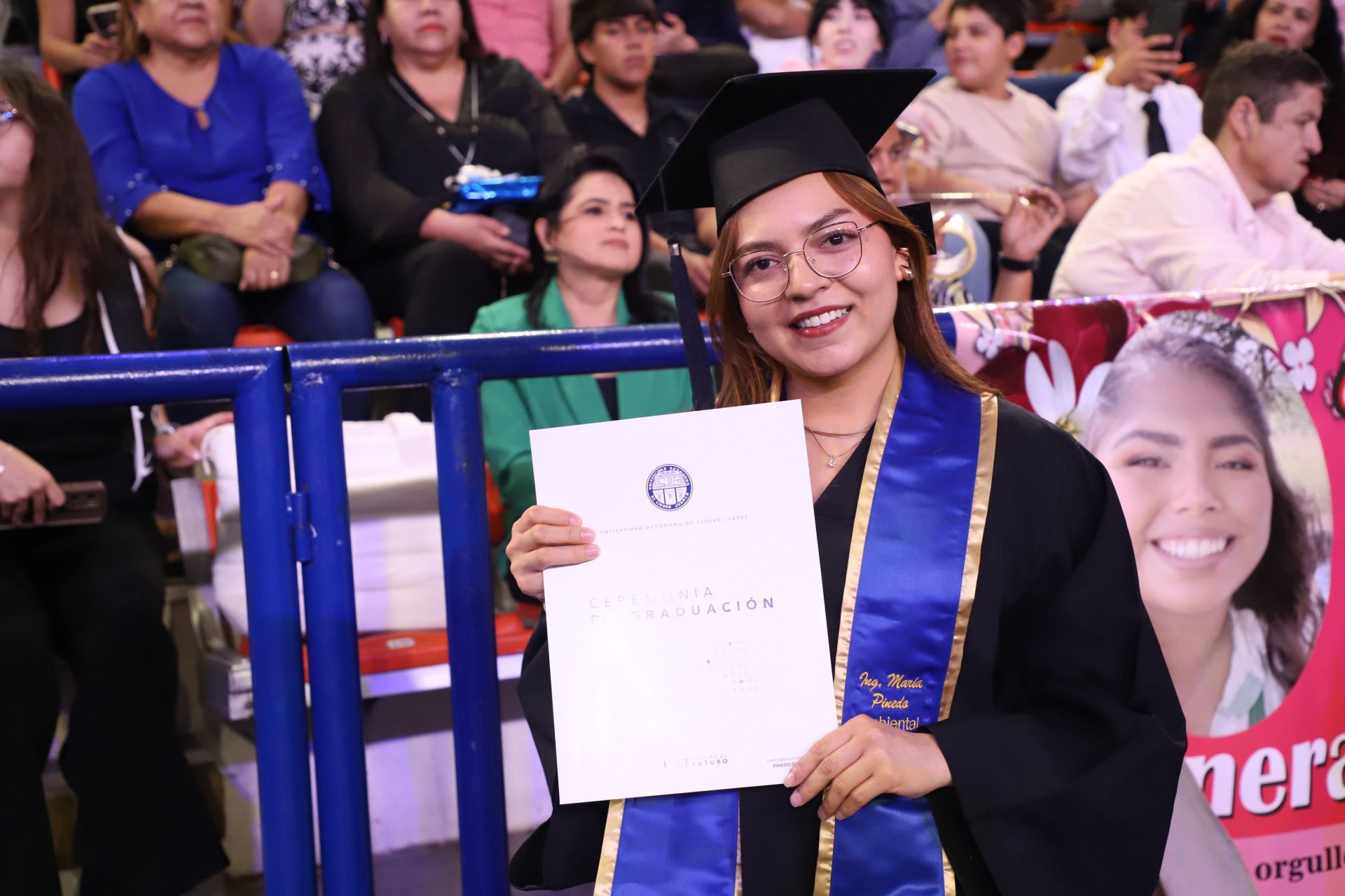 Entre los graduados destacó la historia de María del Carmen Palacios Adame, quien demostró que “nunca es tarde para especializarse en lo que amas”, pues pasaron ocho años desde que terminó su licenciatura en Música en la UACJ, cuando decidió regresar a las aulas para cursar un posgrado en Educación Musical.