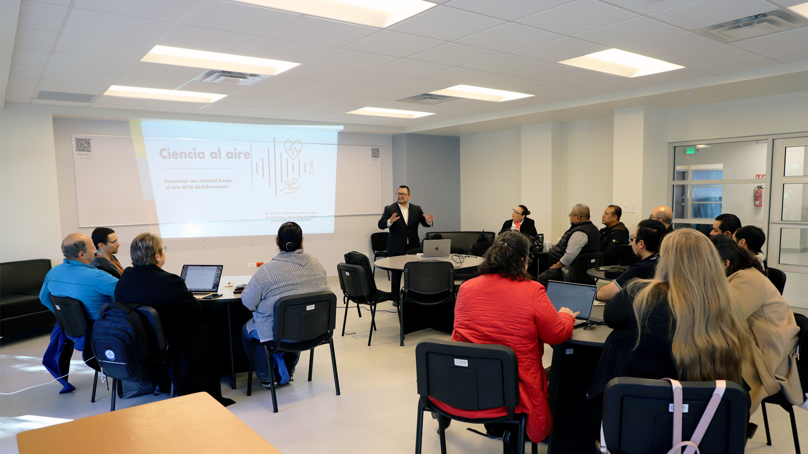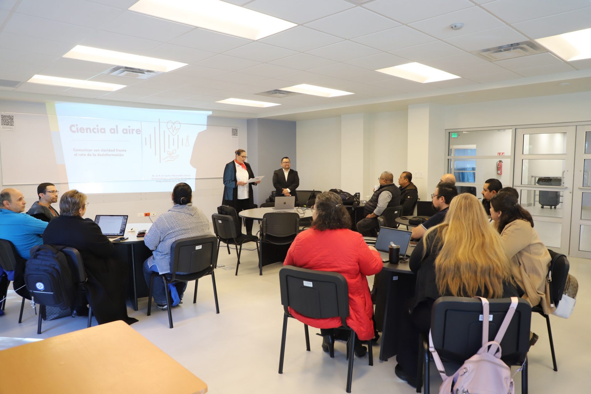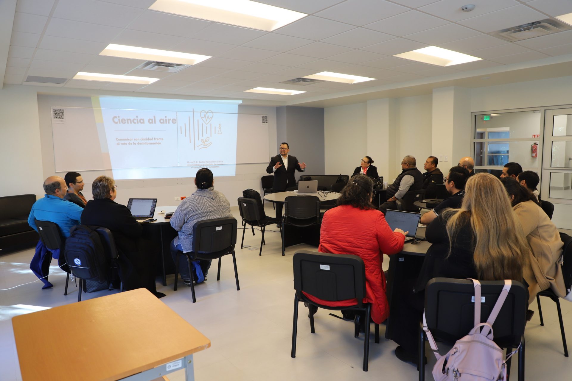 Comunicar con claridad frente al reto de la desinformación es lo que impulsó a la Universidad Autónoma de Ciudad Juárez a dar el taller Ciencia al aire para sus investigadoras e investigadores, mismo que impartió el maestro Carlos Hernández Zarza.