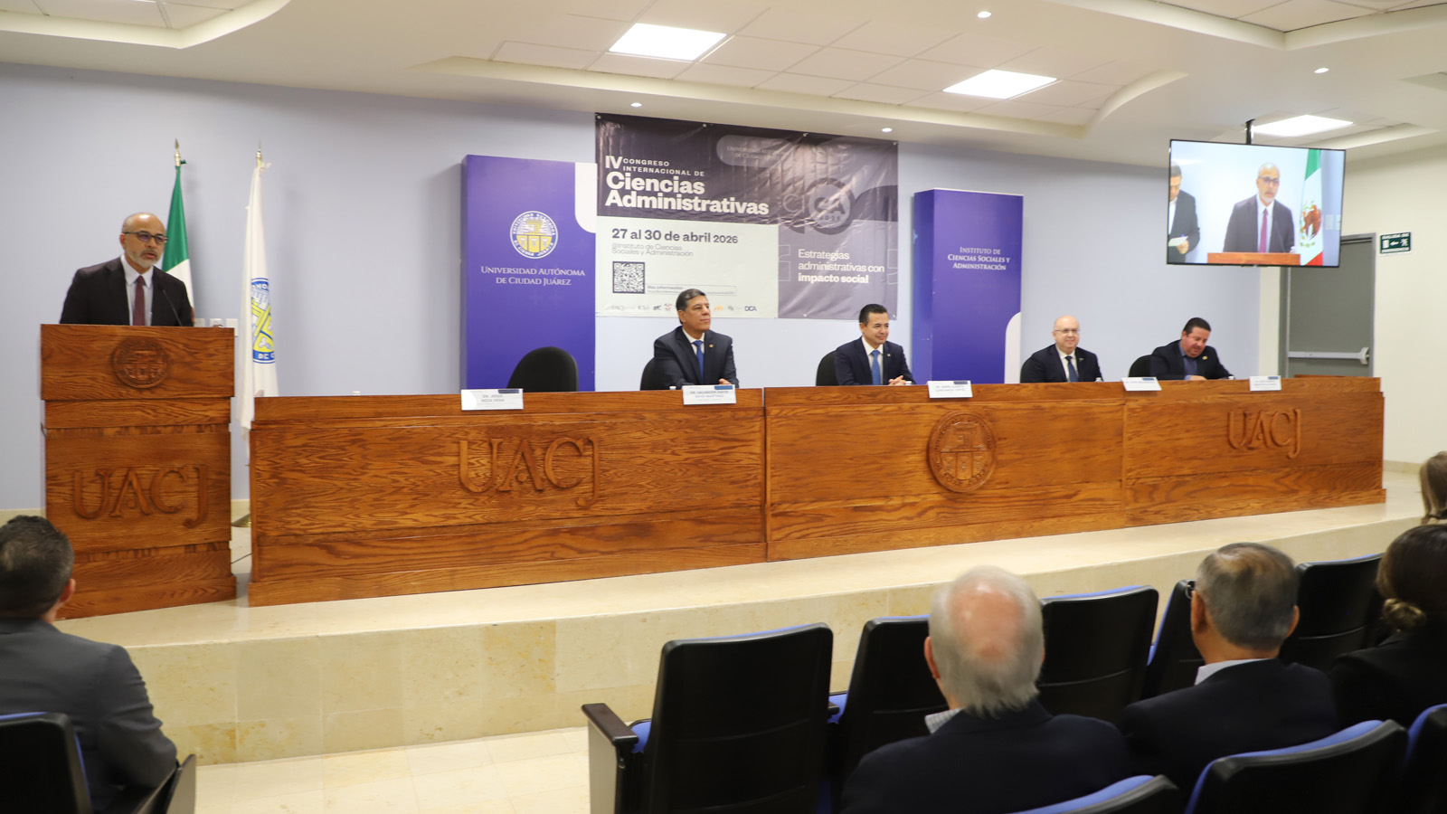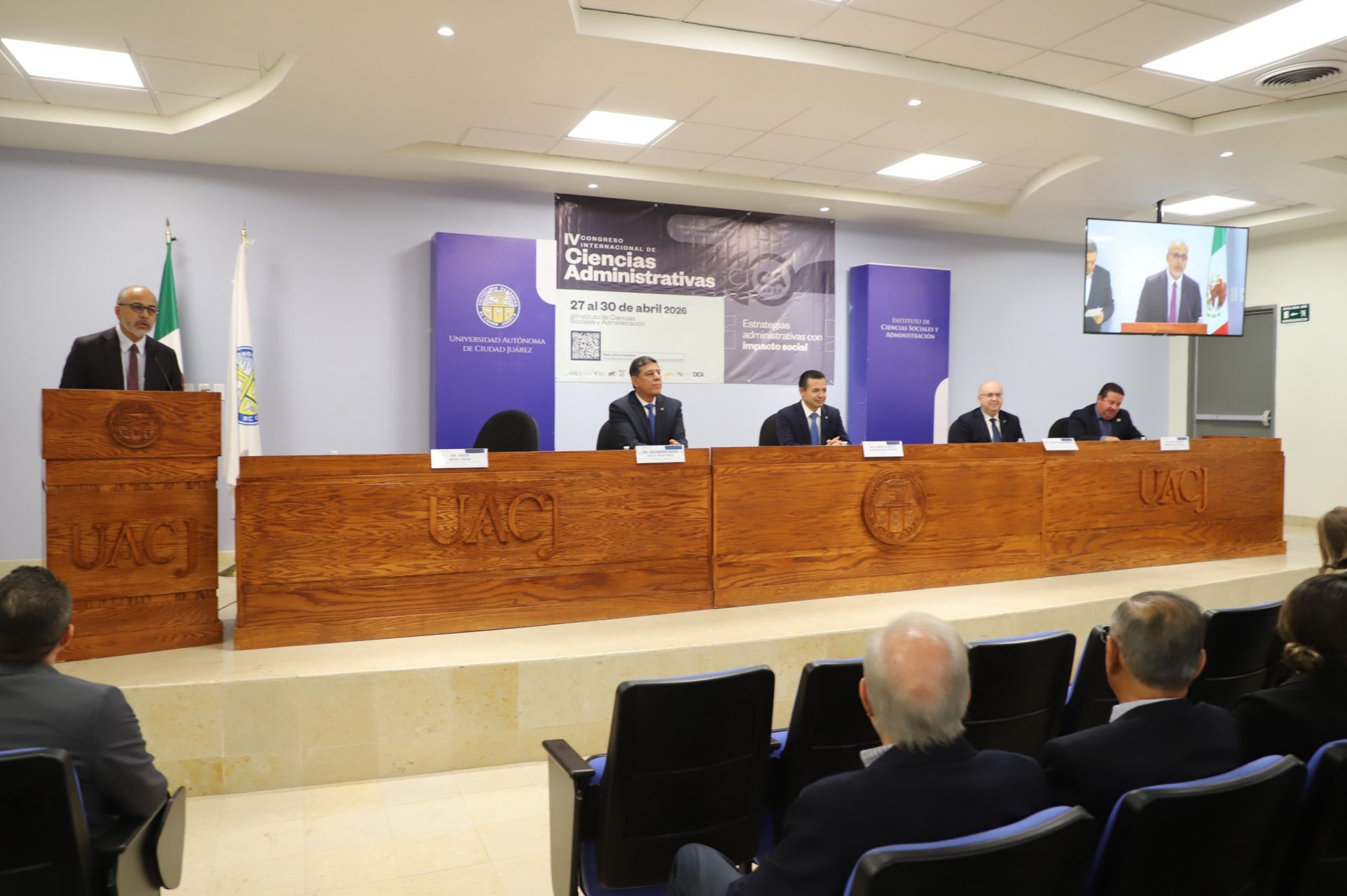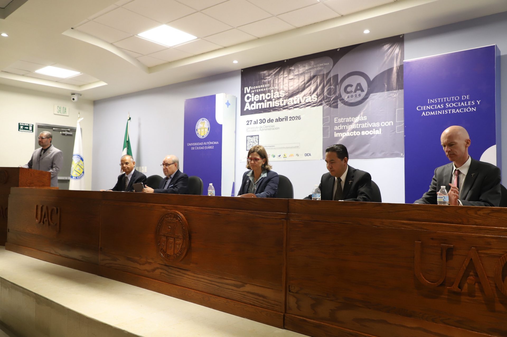 El presídium integrado para la inauguración de la cuarta edición de este congreso internacional estuvo conformado por el rector de la UACJ, doctor Daniel Alberto Constandse Cortez; el secretario general, doctor Salvador David Nava Martínez; el director del ICSA, doctor Jesús Meza Vega; y el decano de la facultad de negocios en UTEP, doctor John Hadjimarcou.