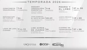 También explicó que las fechas consideradas contarán con variedad creativa y escénica, además de gestos de temporalidad, como la puesta en escena de Pedro y el lobo en el marco de los festejos del Día del Niño, un concierto a la memoria de Juan Gabriel en su aniversario luctuoso, un sinfónico de música mexicana, el esperado concierto especial por el 53 aniversario de la Universidad y el cierre con broche de oro con El Cascanueces en el mes de diciembre.