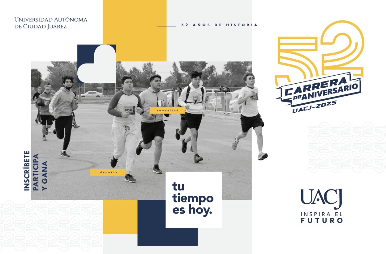 La Dirección del Deporte de la Universidad Autónoma de Ciudad Juárez (UACJ) convoca a su comunidad a participar en la tradicional Carrera del 52 Aniversario, que se llevará a cabo el próximo jueves 2 de octubre, con punto de salida y meta en el exterior del Estadio Olímpico Universitario Benito Juárez, ubicado en la avenida Heroico Colegio Militar s/n, en El Chamizal.