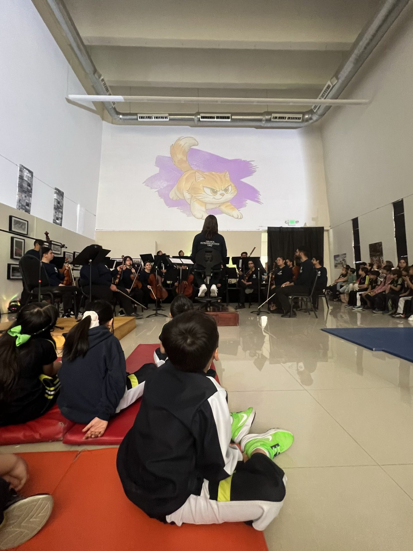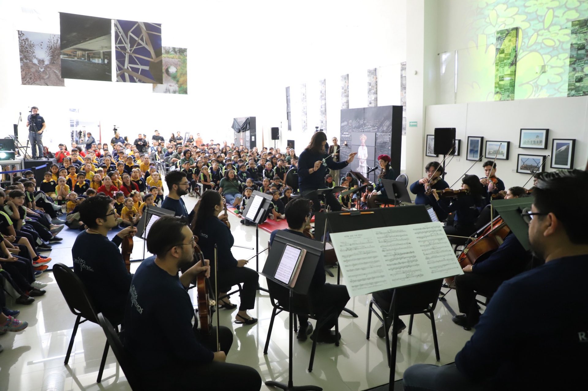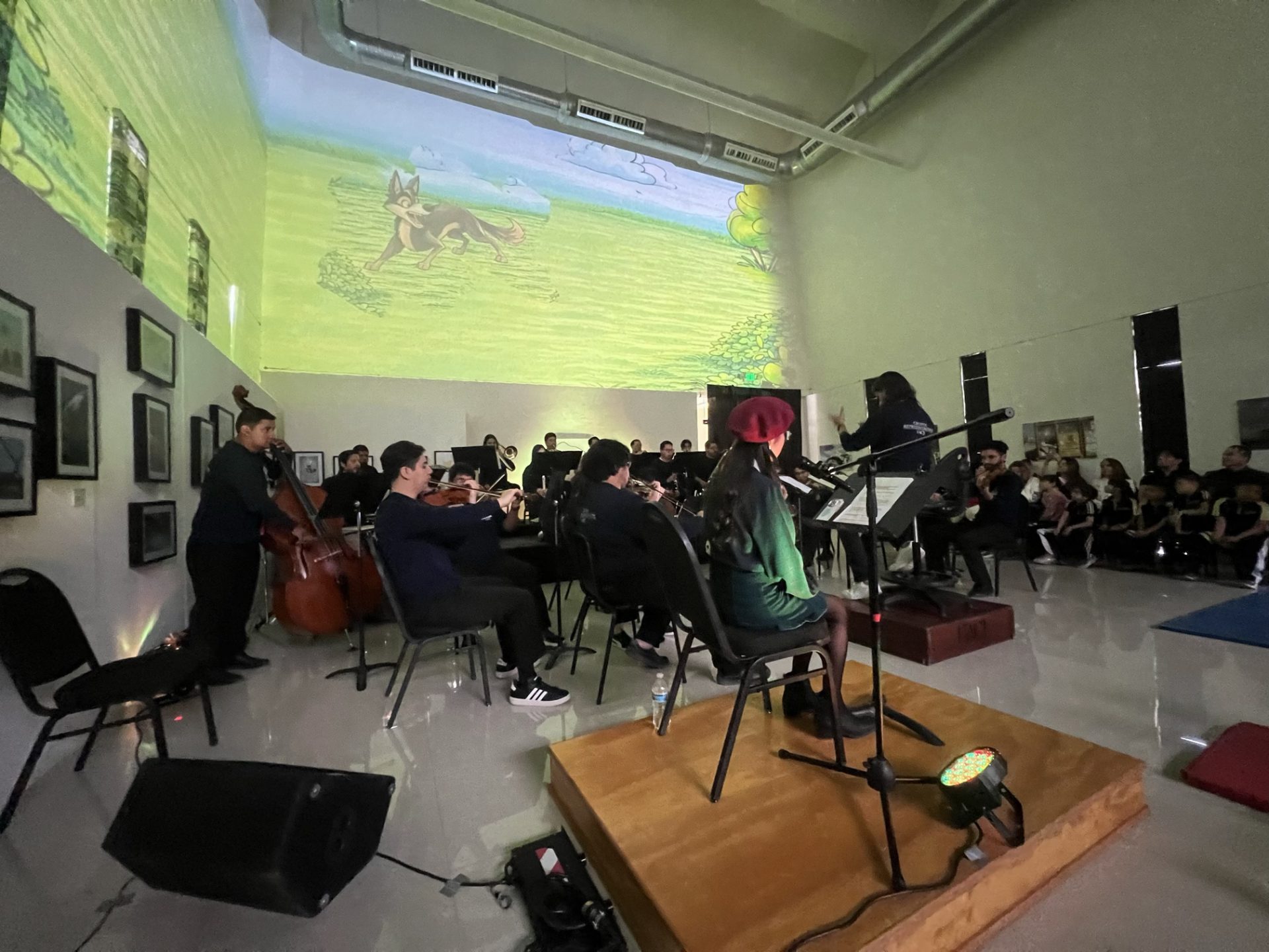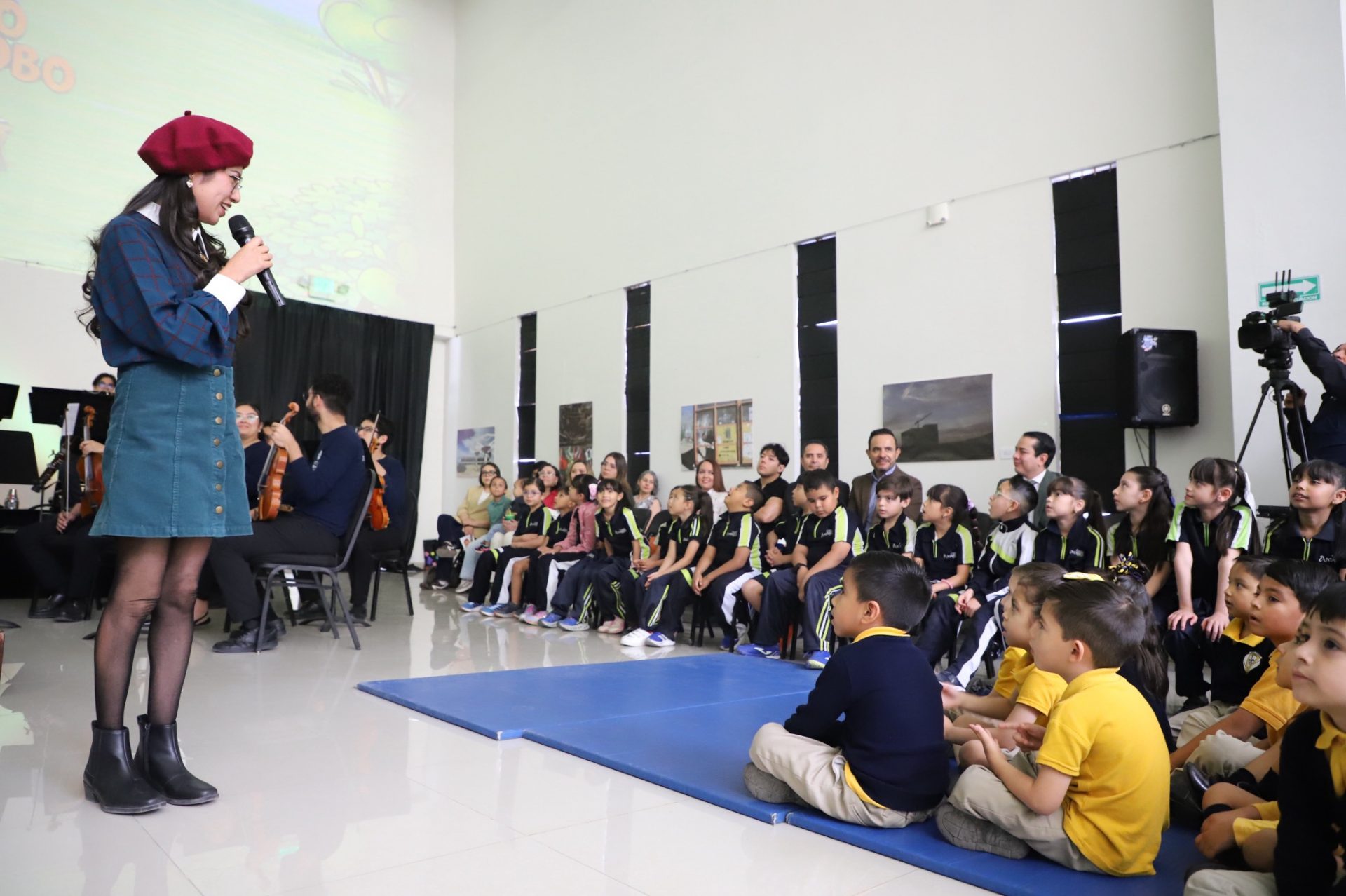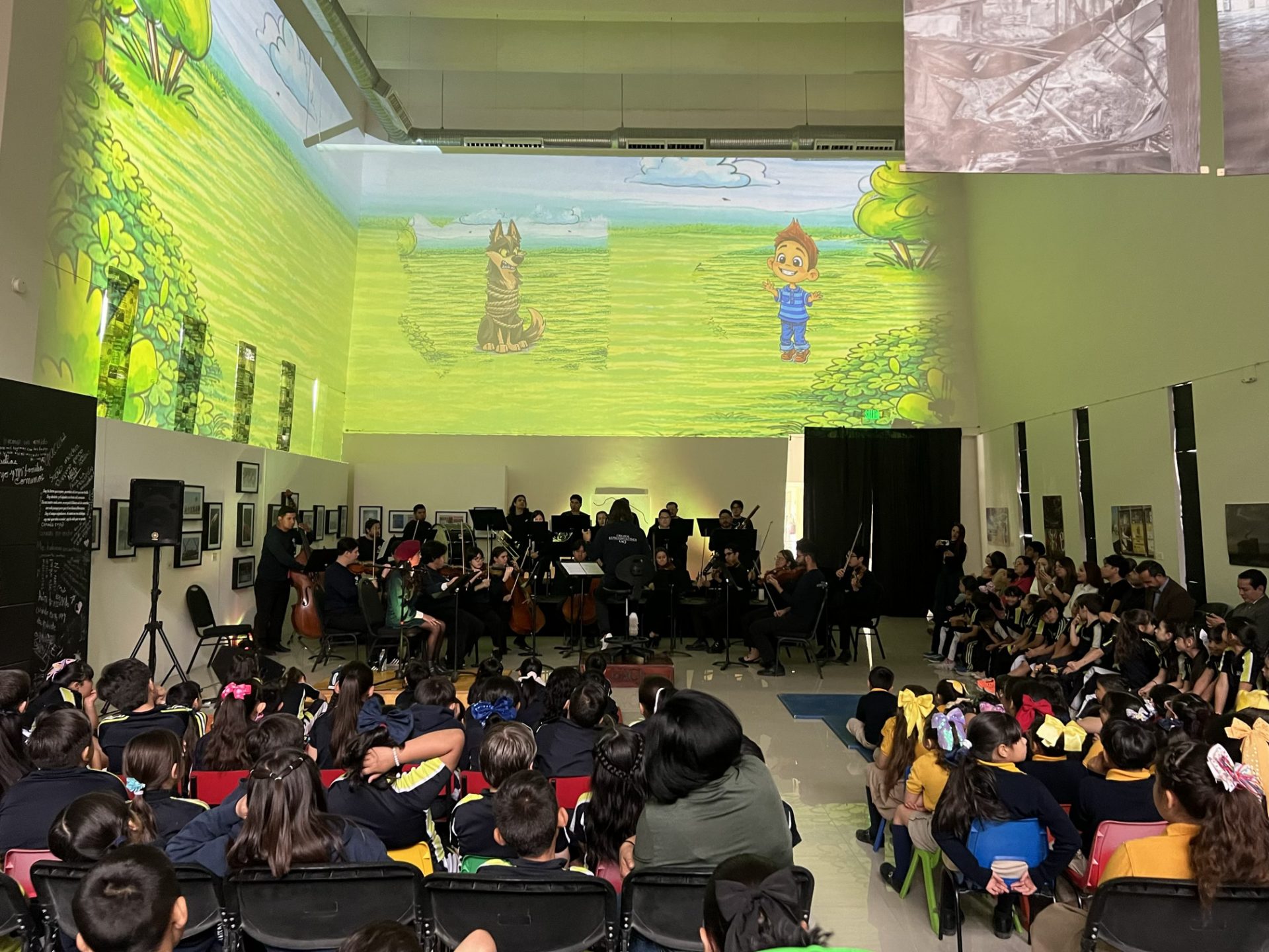 Al menos 200 alumnos de entre 4 a 12 años de los colegios Andares y Jaime Sabines disfrutaron de la colaboración de la Orquesta Sinfónica de la UACJ, que dirige el maestro Lizandro García, y la narración de Arely Hernández, jefa del área de Formación de Públicos.