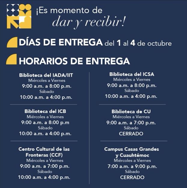 Mientras que en la biblioteca del Campus Ciudad Universitaria (CCU), de miércoles a viernes, en un horario de 9:00 de la mañana a las 19:00 horas. En los campus de Casas Grandes y Cuauhtémoc, de miércoles a viernes, de 9:00 de la mañana a 19:00 horas; el sábado 4 de octubre estas tres últimas permanecerán cerradas.