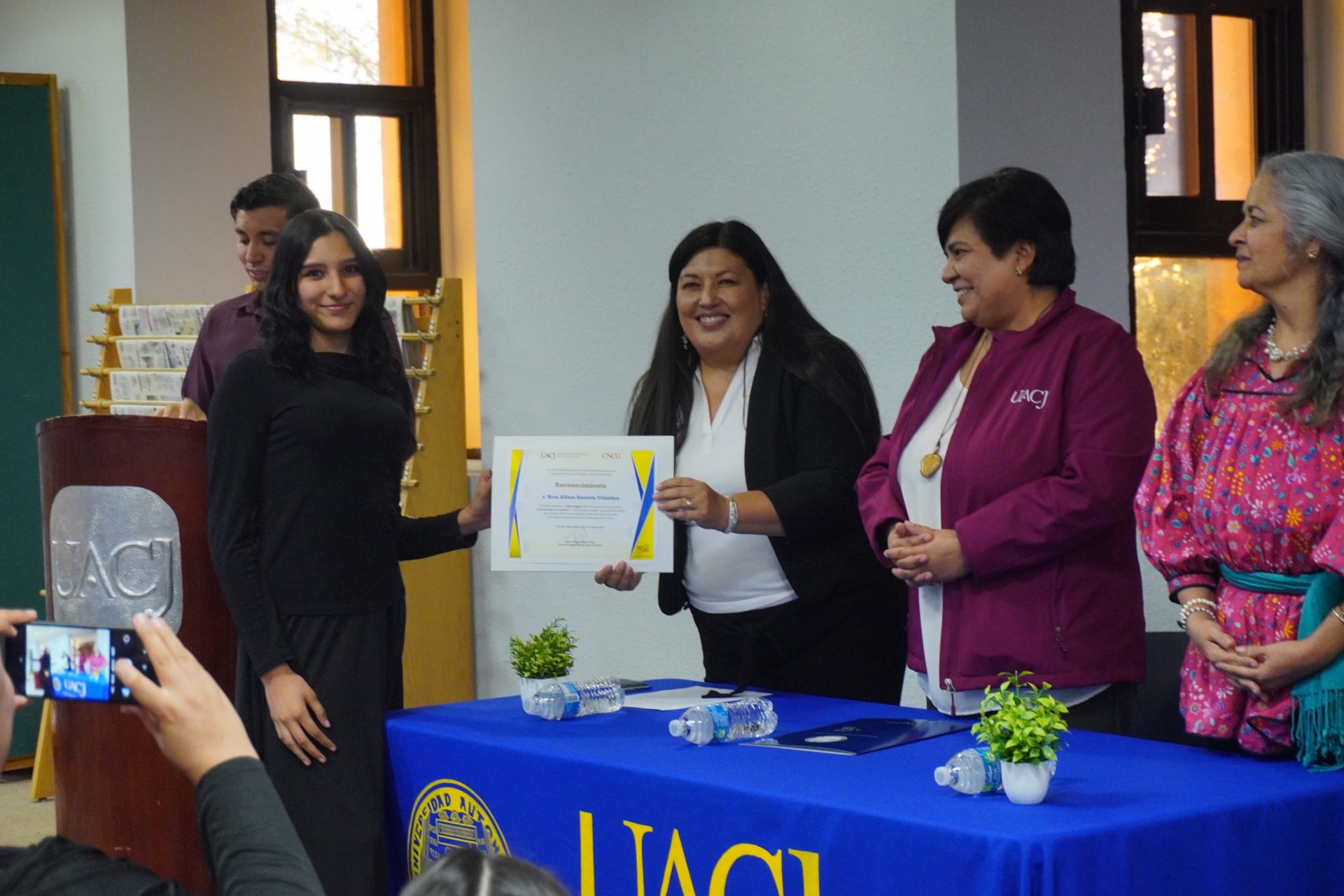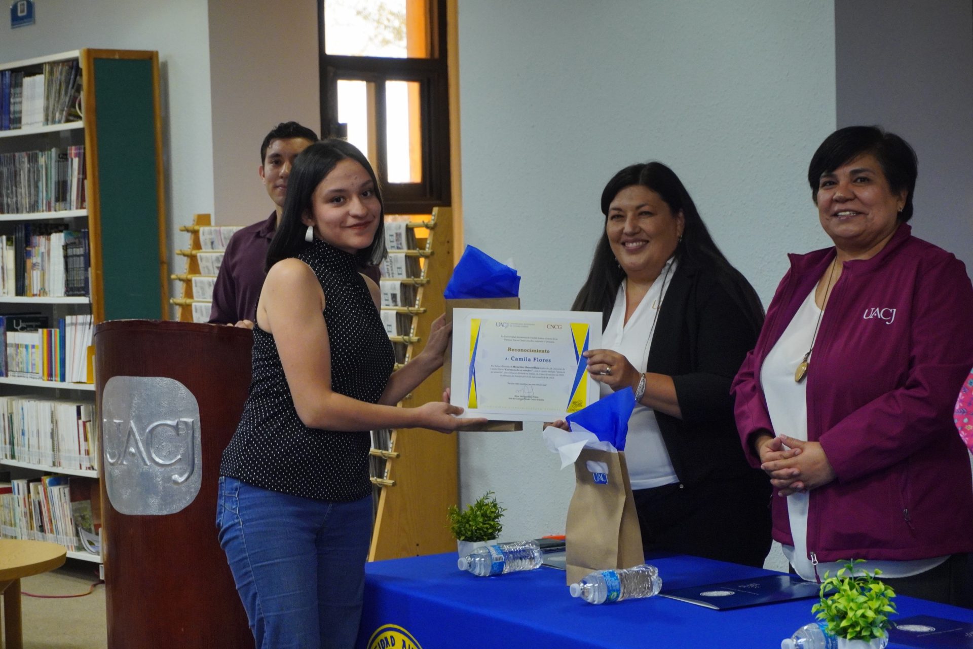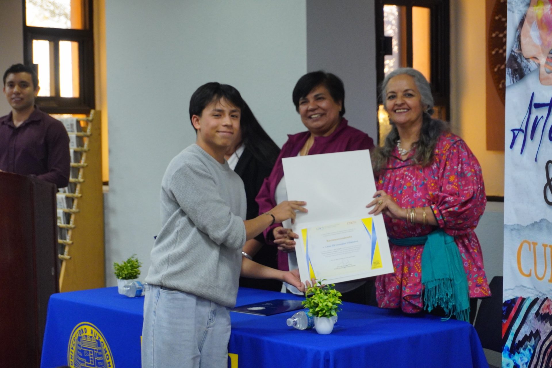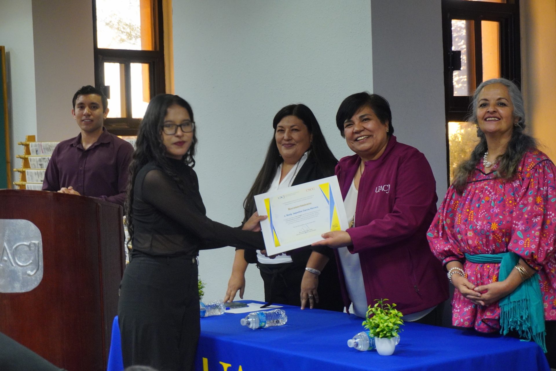 La premiación se llevó a cabo la tarde del 28 de octubre en una emotiva ceremonia realizada dentro de la biblioteca del CNCG, cuyo presídium estuvo integrado por la Mtra. Gabriela Muñoz García, coordinadora del programa de trabajo social, quien representó a la jefa del campus, la Mtra. Miriam Galaz Piñón; la Lic. Desireé Delgado Sujo secretaria del Comité Universitario Pro Arte y Cultura (CUPAC) y la Lic. Elizabeth Mendoza Barrio, integrante del Jurado Calificador.
