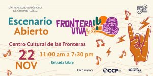 La Universidad Autónoma de Ciudad Juárez (UACJ) invita a los medios de comunicación locales a cubrir la 4.ª edición del Frontera Viva Fest, un encuentro cultural que celebra el talento local, la identidad fronteriza y la creatividad viva. El festival se llevará a cabo el 22 de noviembre, de 11:00 a 19:30 horas, en el … Sigue leyendo Llega el Frontera Viva Fest: desierto, arte y puro corazón